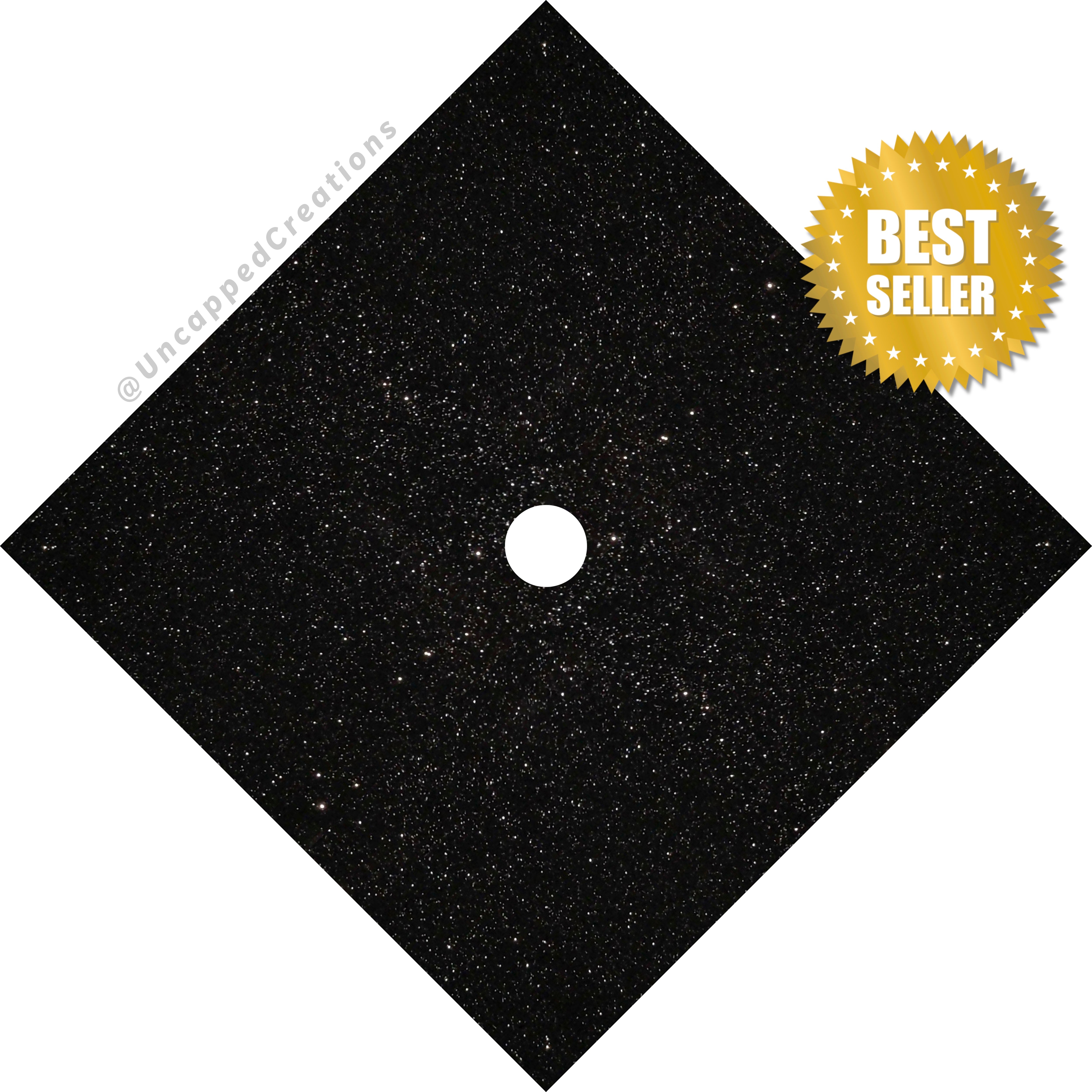 Design is 9.5 x 9.5 inches with an approximate 1 inch hole in the center and double sided adhesive in the back. Design is hand cut on cardstock paper. The topper will fit the standard 9 x 9 inches graduation cap / mortar board. Cap is not included.