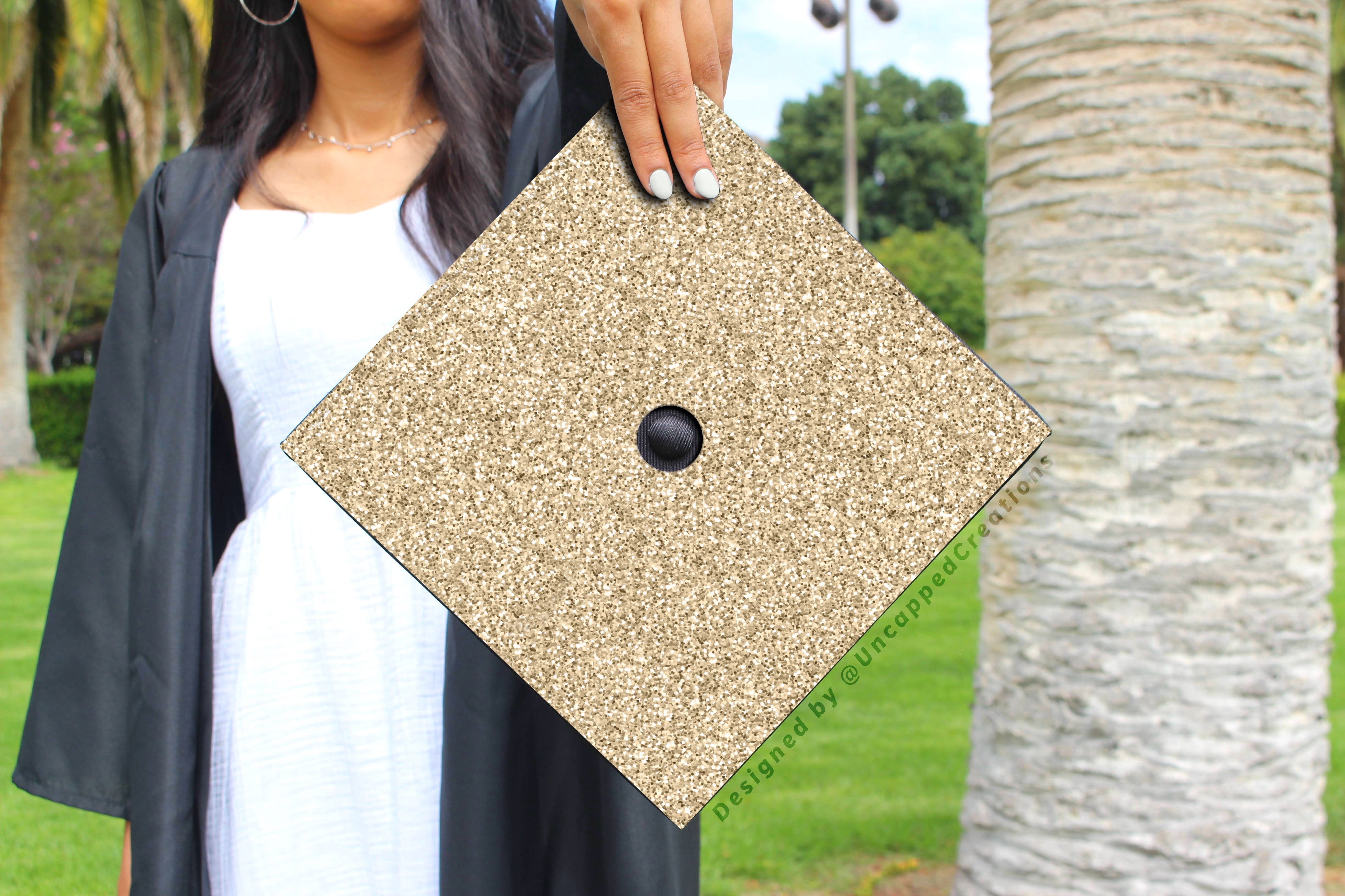 Design is 9.5 x 9.5 inches with an approximate 1 inch hole in the center and double sided adhesive in the back. Design is hand cut on cardstock paper. The topper will fit the standard 9 x 9 inches graduation cap / mortar board. Cap is not included.
