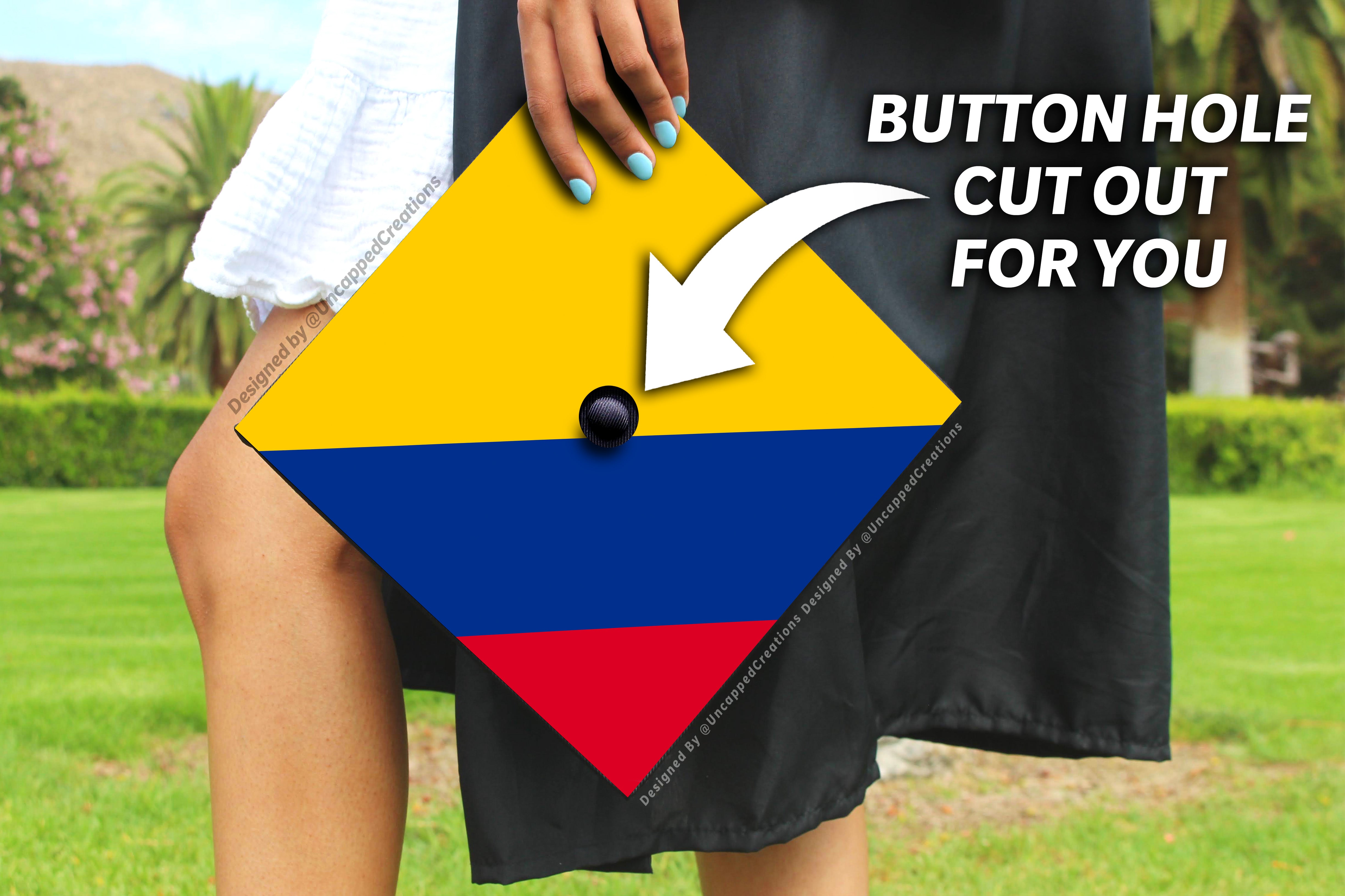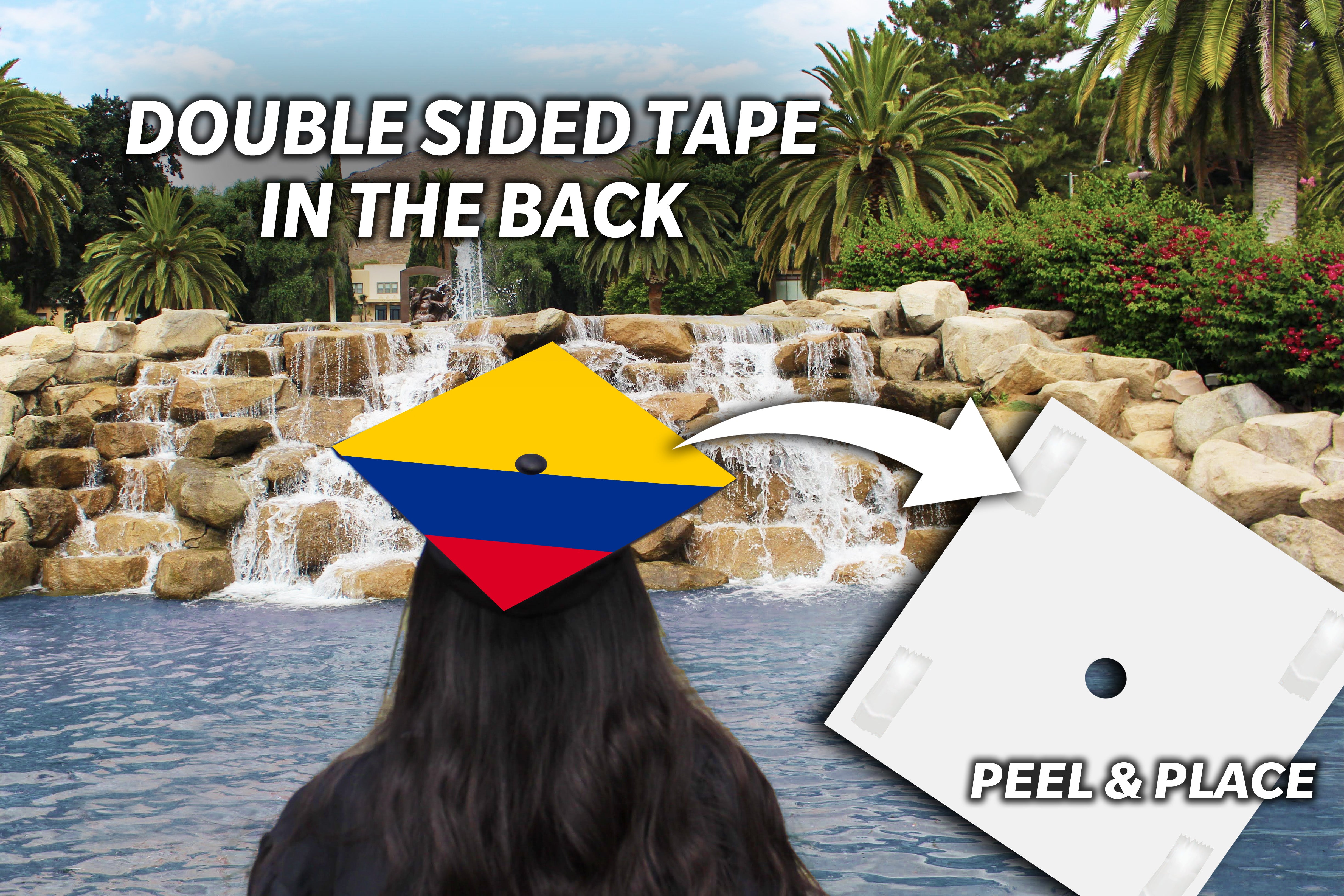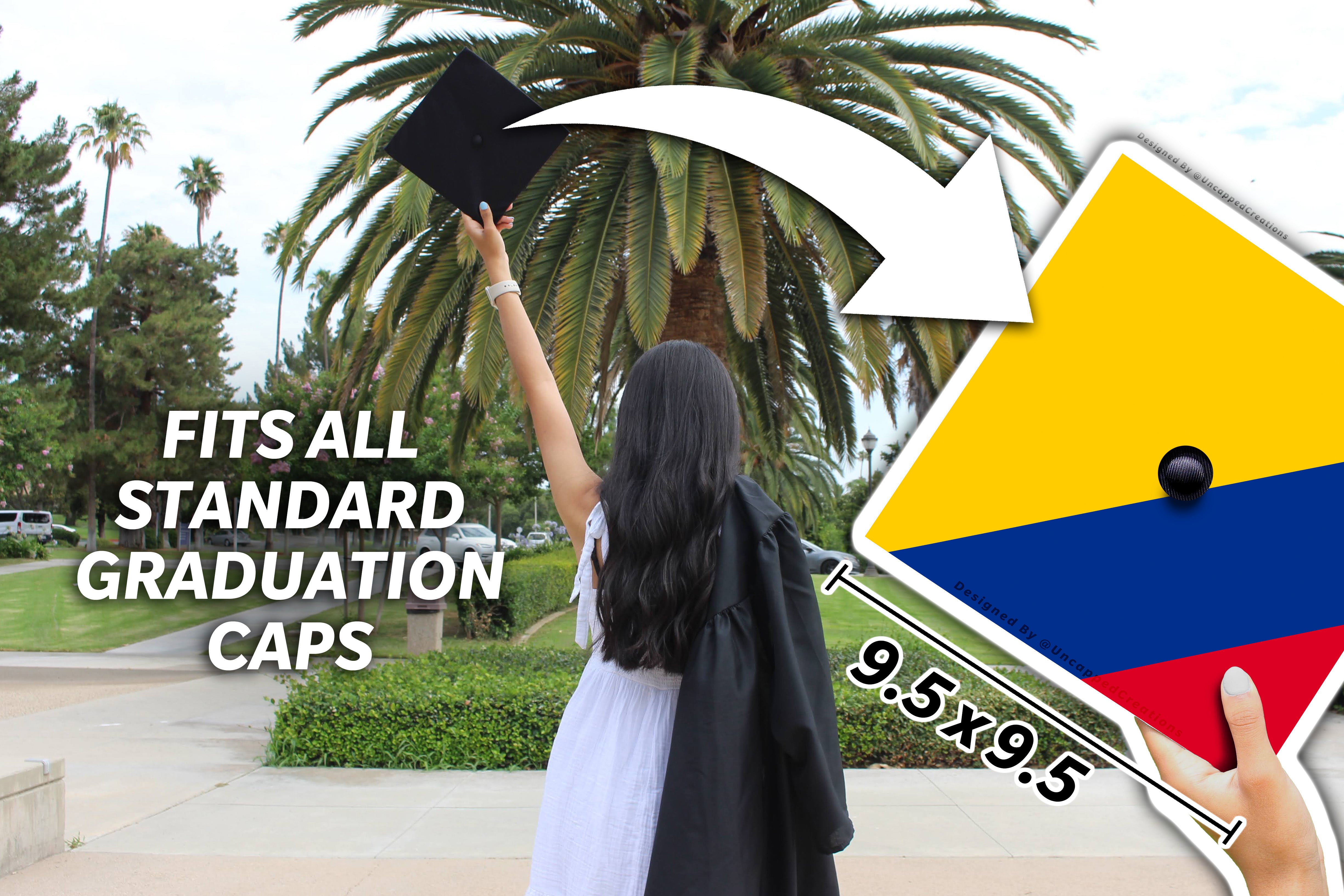 Design is 9.5 x 9.5 inches with an approximate 1 inch hole in the center and double sided adhesive in the back. Design is printed on cardstock, not hand painted. The topper will fit the standard 9 x 9 inches graduation cap / mortar board. Cap/Mortar board is not included. Center circle is not included.