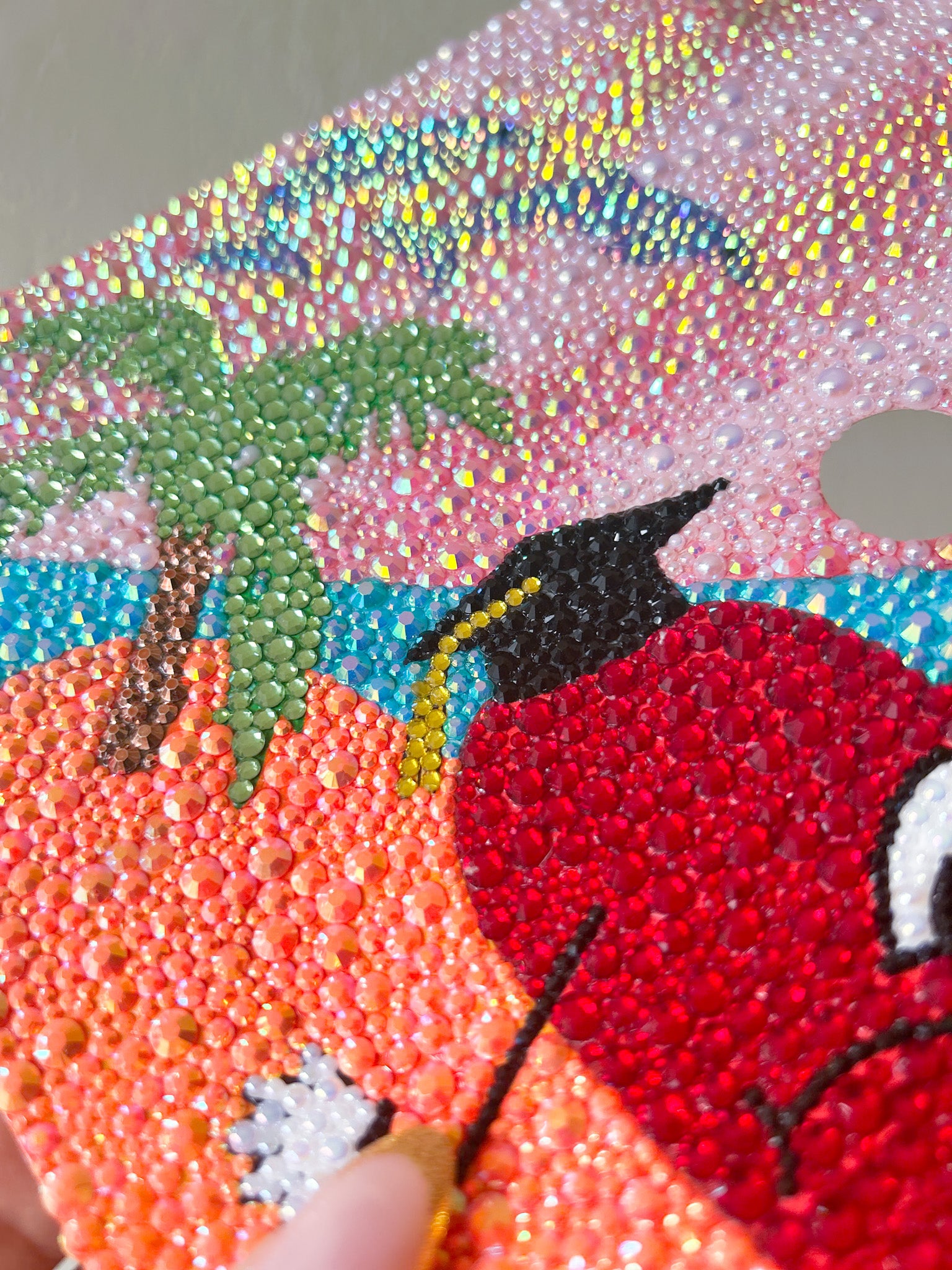 Design is 9.5 x 9.5 inches with an approximate 1 inch hole in the center and double sided adhesive in the back. Design is printed on cardstock, not hand painted, and rhinestoned on top. The topper will fit the standard 9 x 9 inches graduation cap / mortar board. Cap/Mortar board is not included. Center circle is not included.