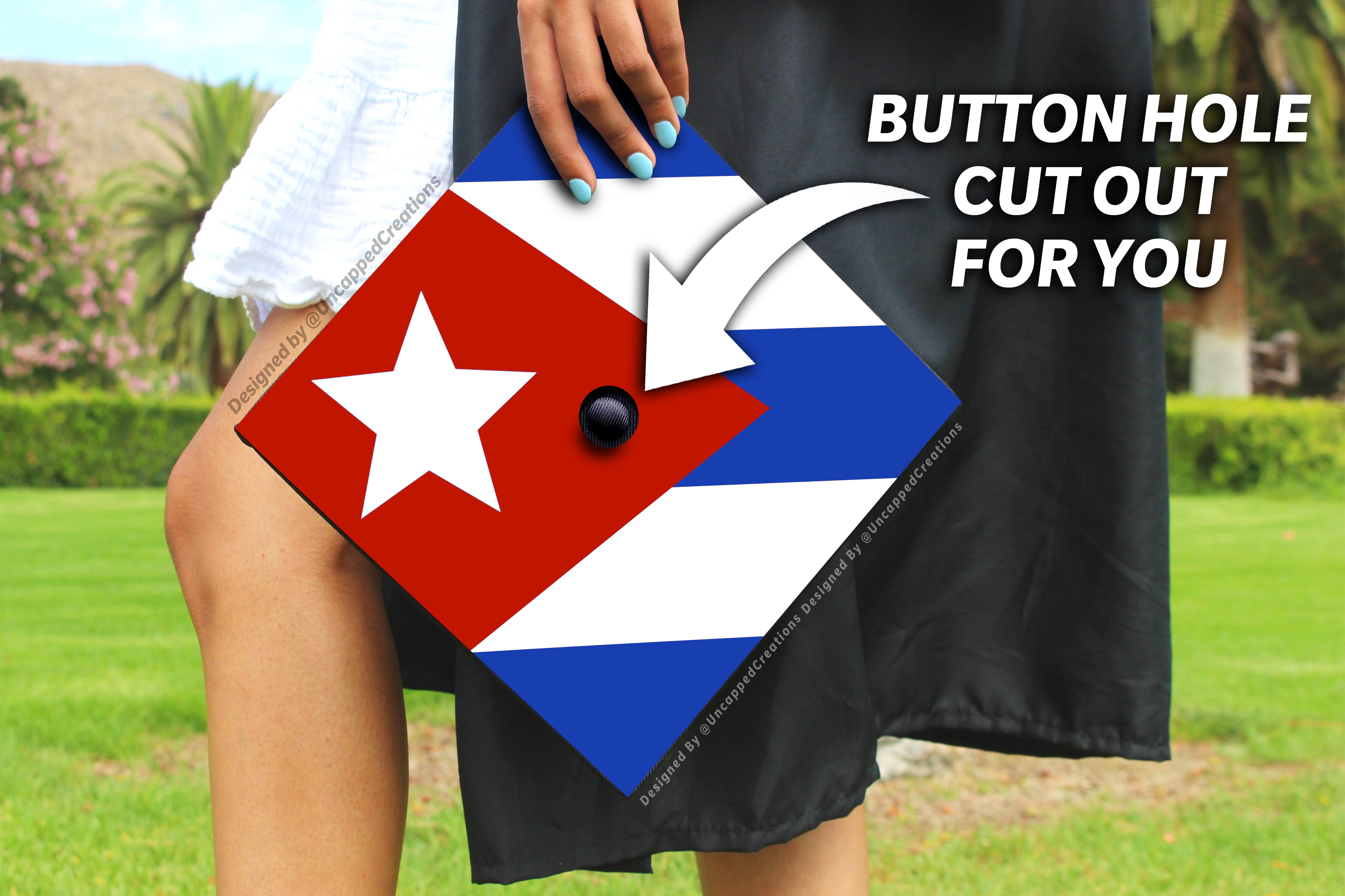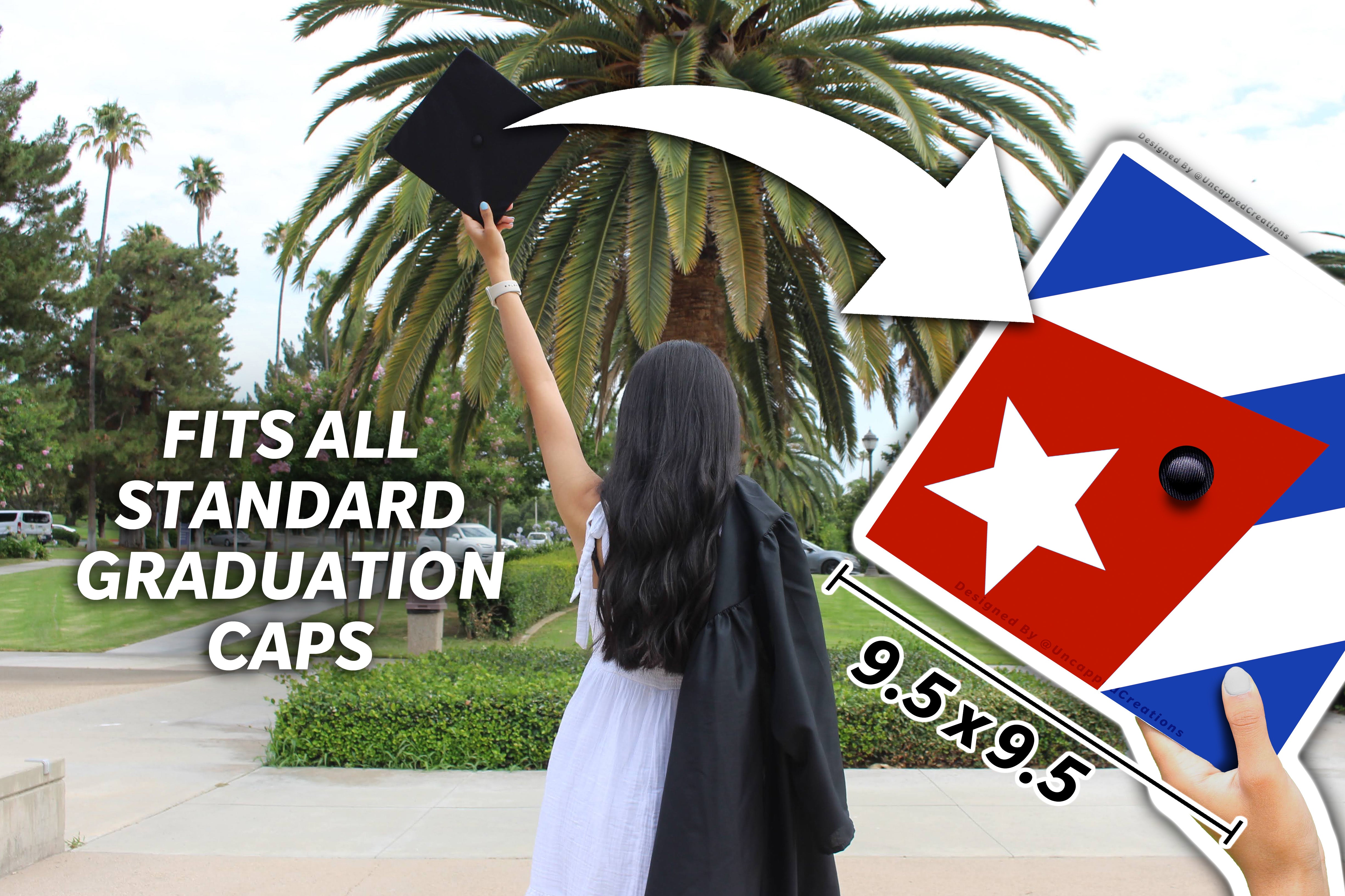 Design is 9.5 x 9.5 inches with an approximate 1 inch hole in the center and double sided adhesive in the back. Design is printed on cardstock, not hand painted. The topper will fit the standard 9 x 9 inches graduation cap / mortar board. Cap/Mortar board is not included. Center circle is not included.