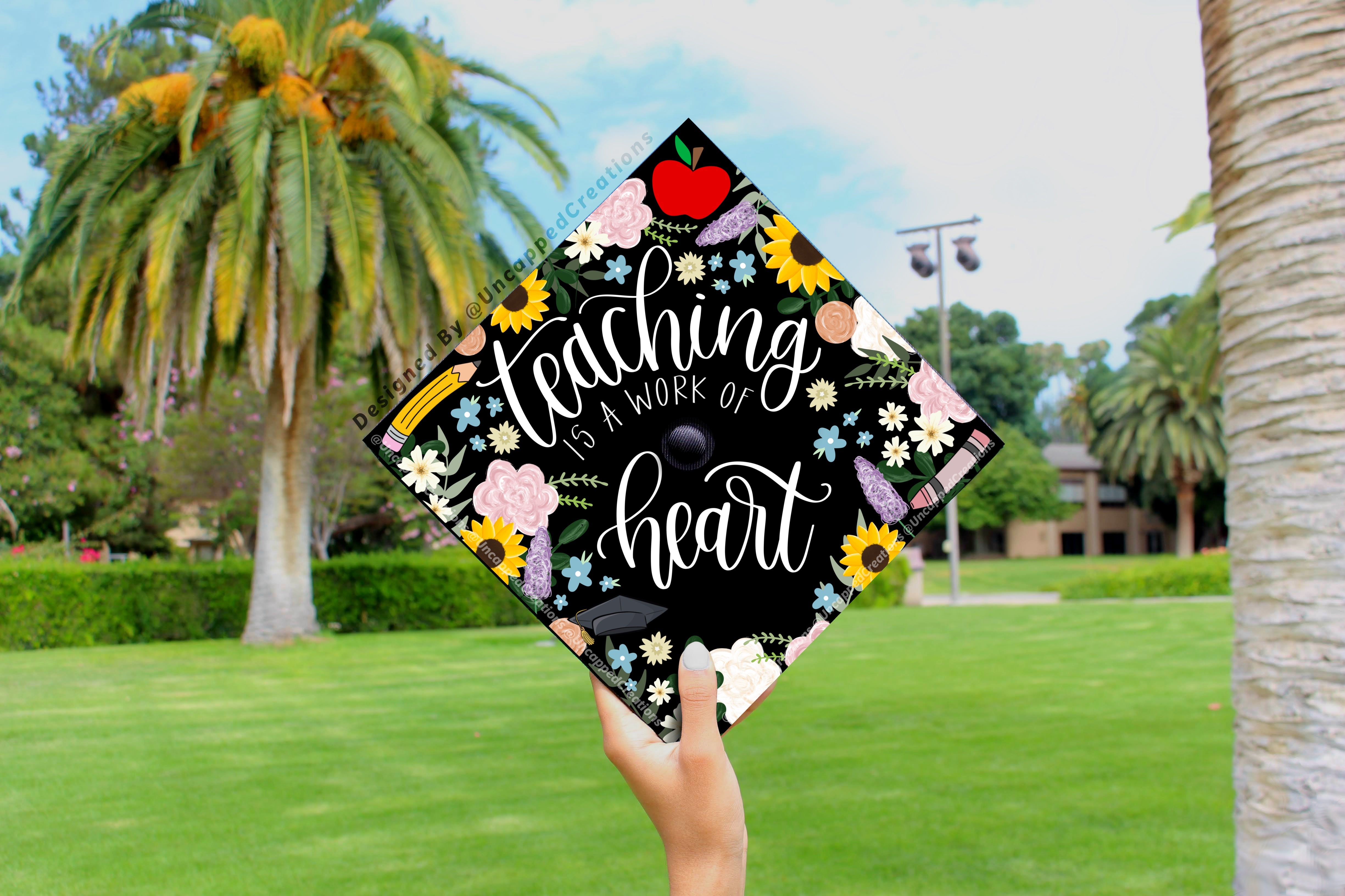 Design is 9.5 x 9.5 inches with an approximate 1 inch hole in the center and double sided adhesive in the back. Design is printed on cardstock, not hand painted. The topper will fit the standard 9 x 9 inches graduation cap / mortar board. (If you need a different size, please let me know the size IN INCHES that you need it for.)