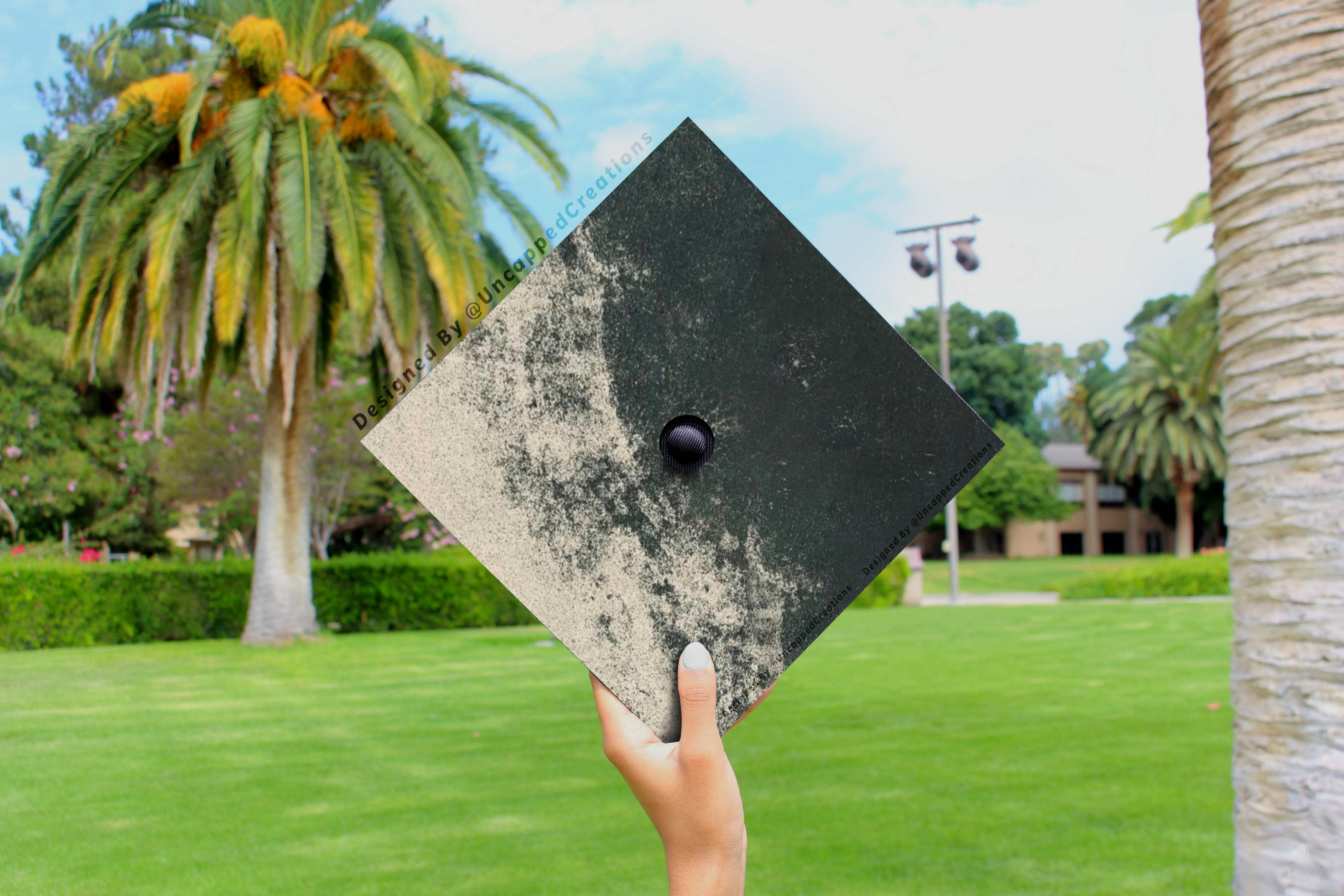 Design is 9.5 x 9.5 inches with an approximate 1 inch hole in the center and double sided adhesive in the back. Design is printed on cardstock, not hand painted. The topper will fit the standard 9 x 9 inches graduation cap / mortar board. (If you need a different size, please let me know the size IN INCHES that you need it for.)