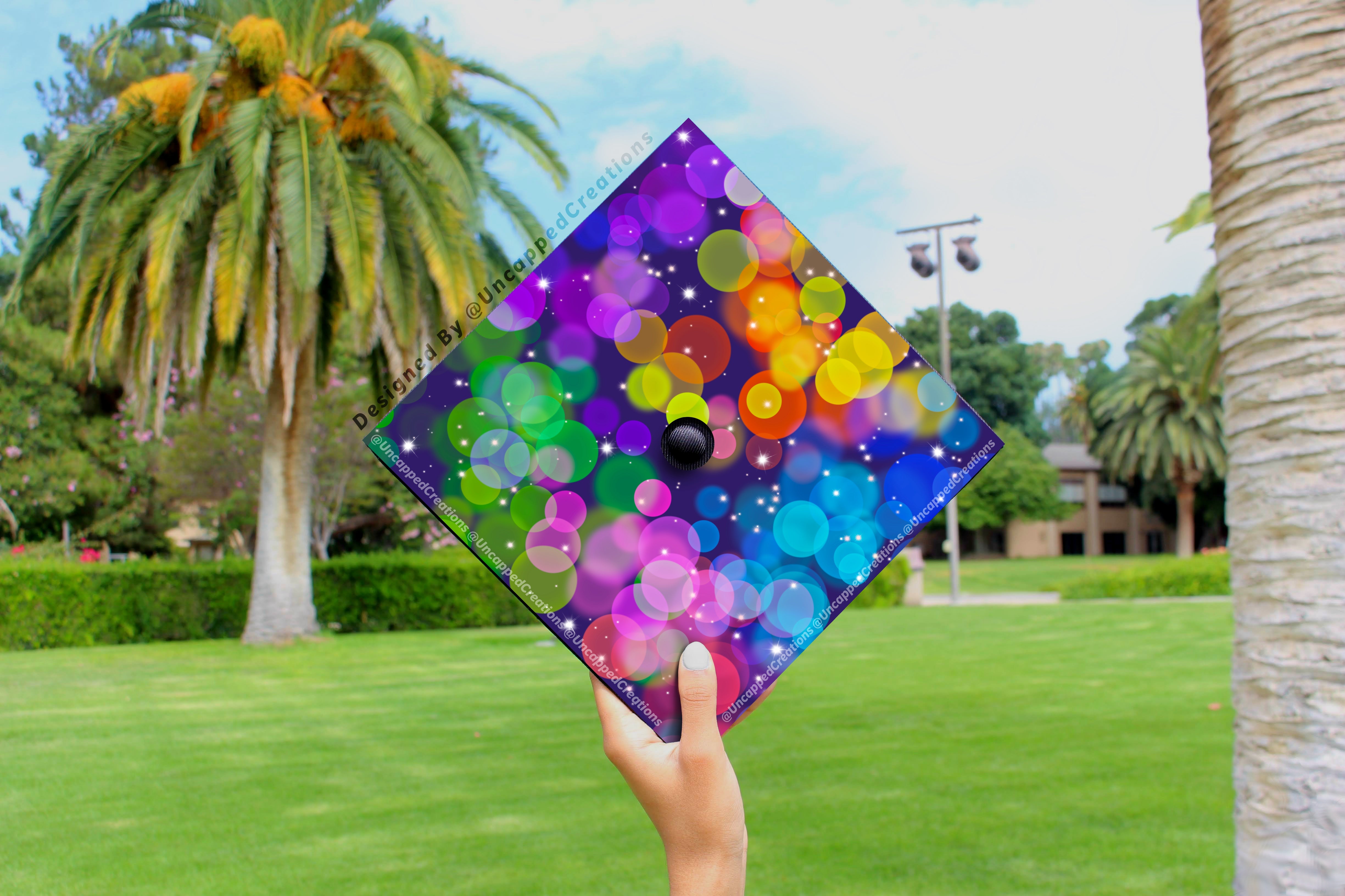 Design is 9.5 x 9.5 inches with an approximate 1 inch hole in the center and double sided adhesive in the back. Design is printed on cardstock, not hand painted. The topper will fit the standard 9 x 9 inches graduation cap / mortar board. (If you need a different size, please let me know the size IN INCHES that you need it for.)