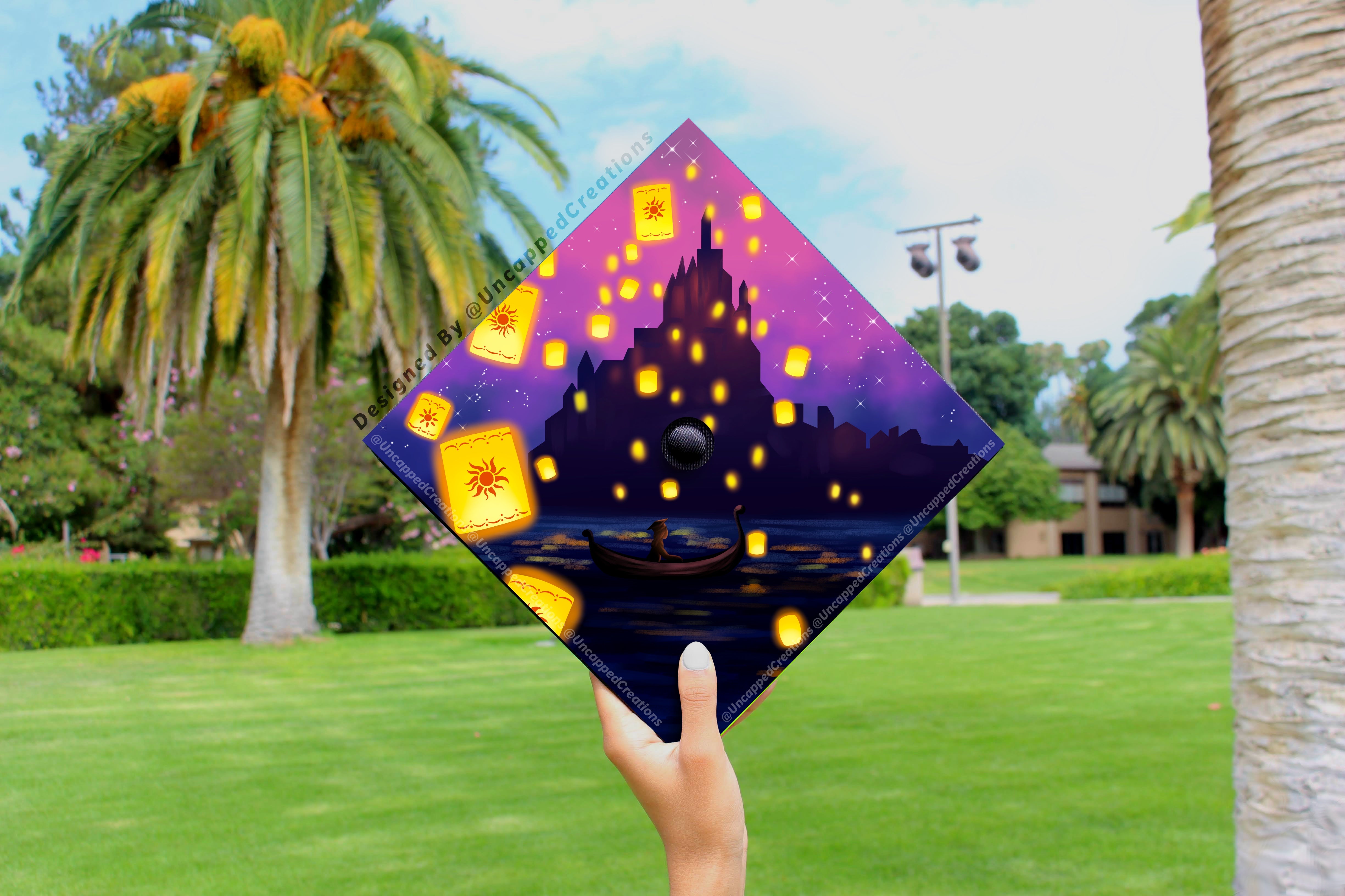 Design is 9.5 x 9.5 inches with an approximate 1 inch hole in the center and double sided adhesive in the back. Design is printed on cardstock, not hand painted. The topper will fit the standard 9 x 9 inches graduation cap / mortar board. (If you need a different size, please let me know the size IN INCHES that you need it for.)
