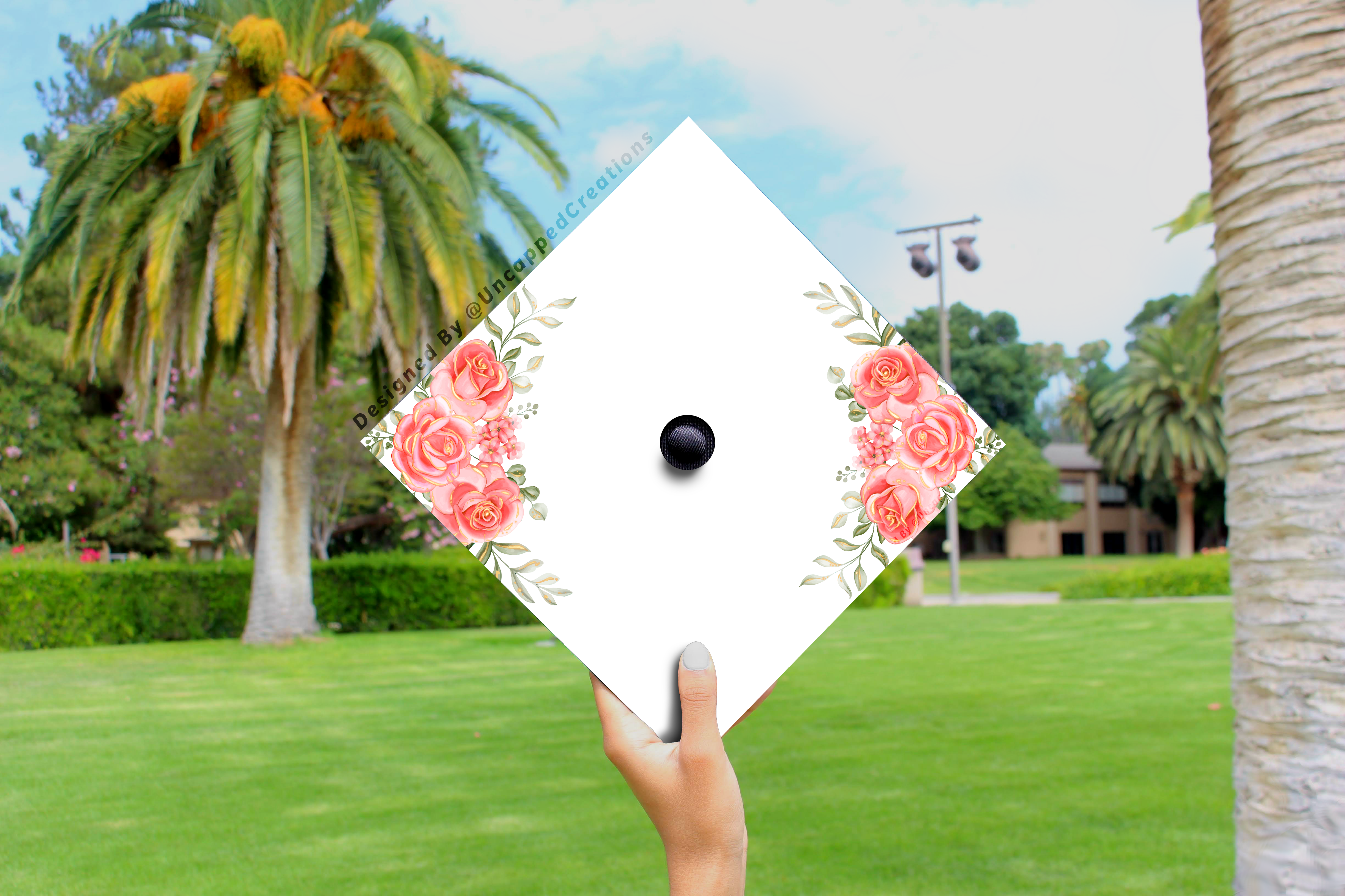 Design is 9.5 x 9.5 inches with an approximate 1 inch hole in the center and double sided adhesive in the back. Design is printed on cardstock, not hand painted. The topper will fit the standard 9 x 9 inches graduation cap / mortar board. (If you need a different size, please let me know the size IN INCHES that you need it for.)