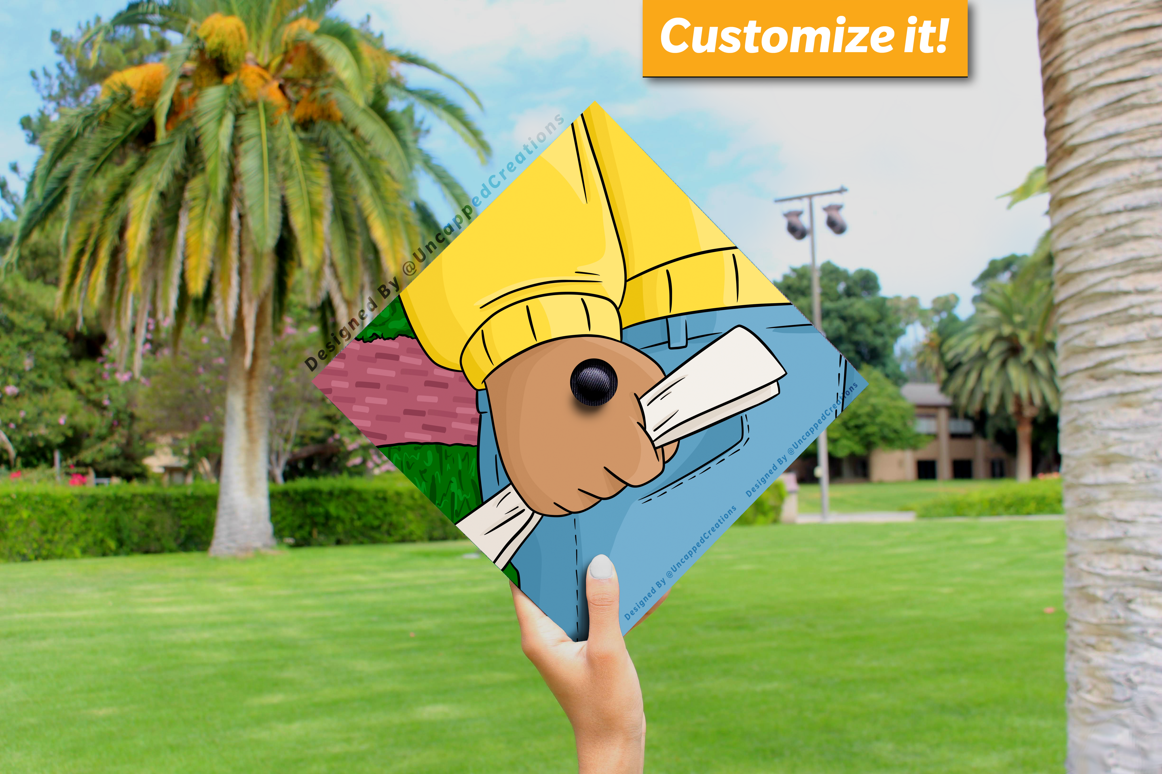 Design is 9.5 x 9.5 inches with an approximate 1 inch hole in the center and double sided adhesive in the back. Design is printed on cardstock, not hand painted. The topper will fit the standard 9 x 9 inches graduation cap / mortar board. (If you need a different size, please let me know the size IN INCHES that you need it for.)