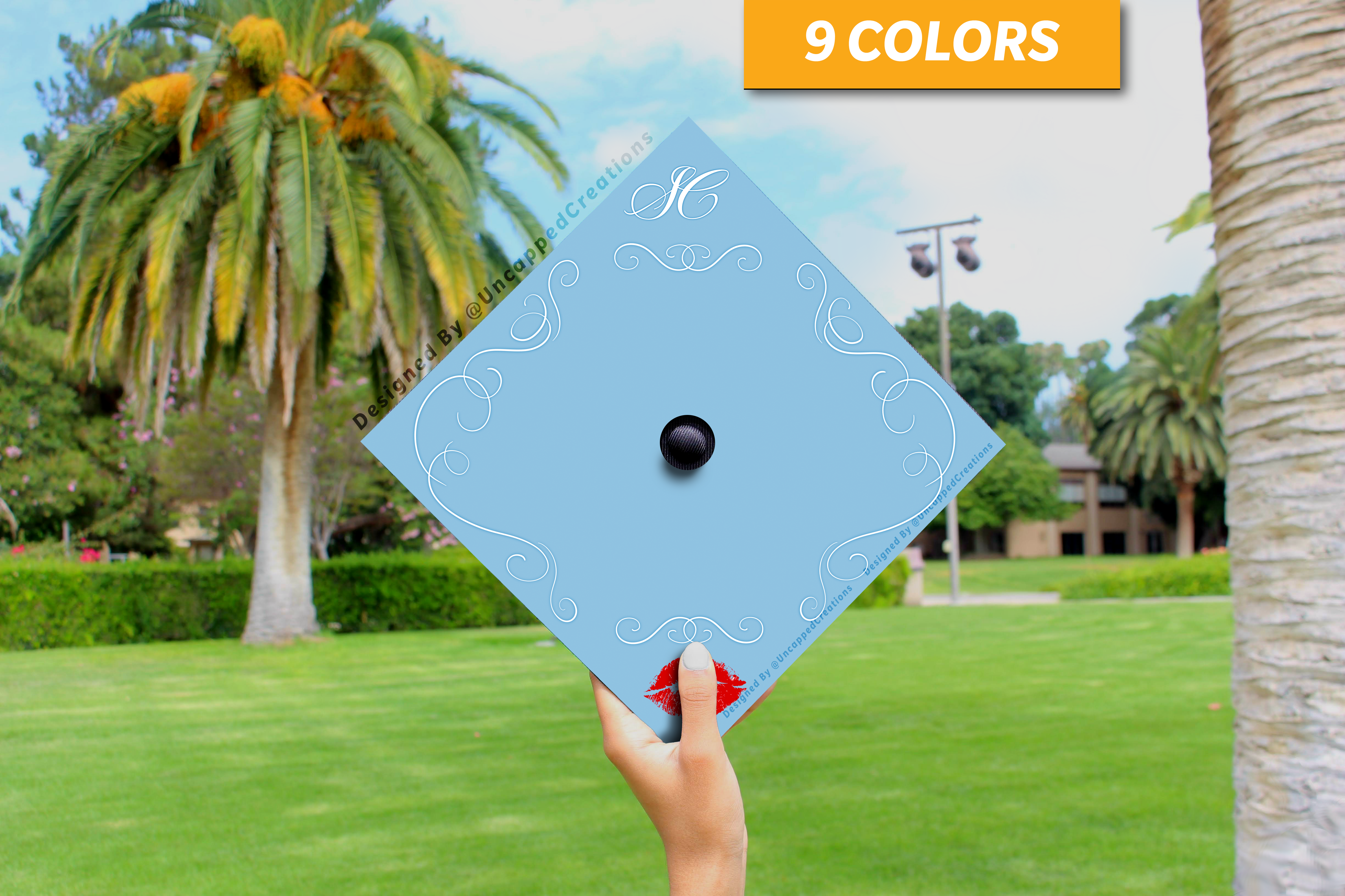 Design is 9.5 x 9.5 inches with an approximate 1 inch hole in the center and double sided adhesive in the back. Design is printed on cardstock, not hand painted. The topper will fit the standard 9 x 9 inches graduation cap / mortar board. (If you need a different size, please let me know the size IN INCHES that you need it for.)