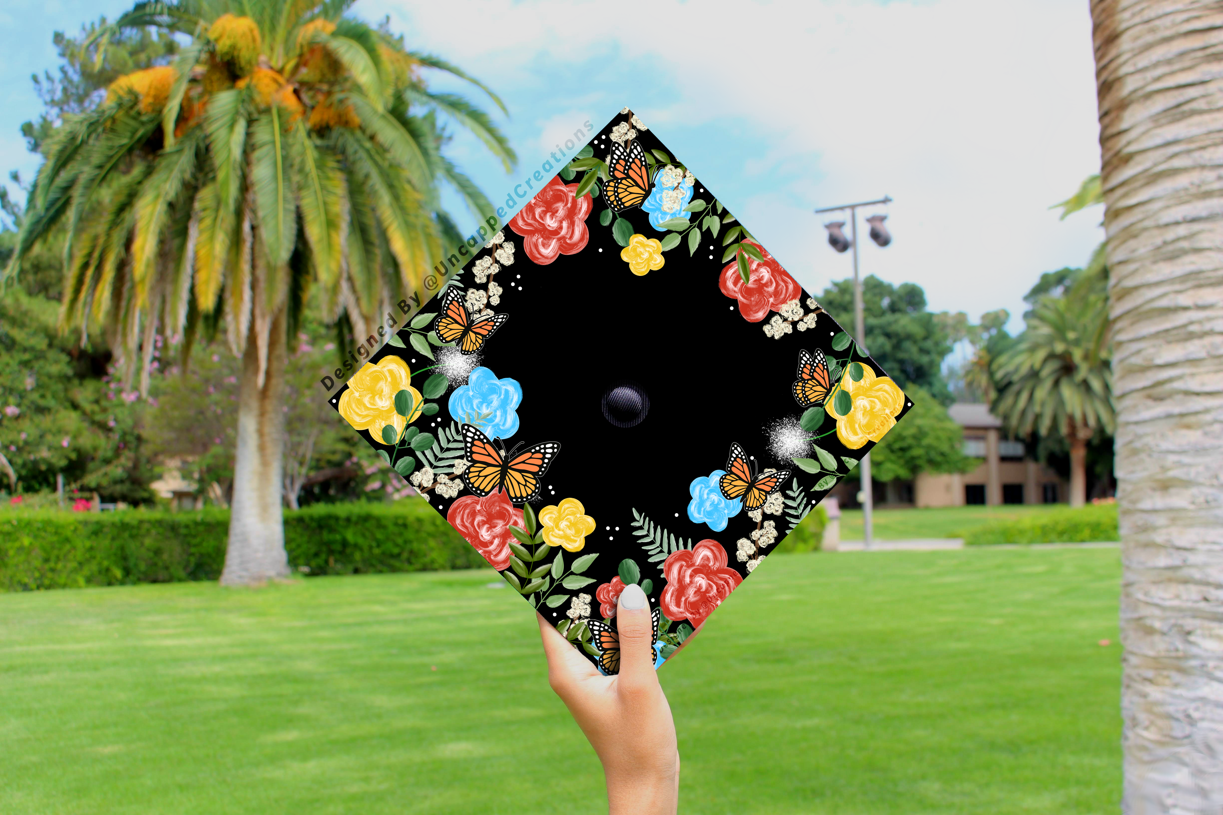 Design is 9.5 x 9.5 inches with an approximate 1 inch hole in the center and double sided adhesive in the back. Design is printed on cardstock, not hand painted. The topper will fit the standard 9 x 9 inches graduation cap / mortar board. (If you need a different size, please let me know the size IN INCHES that you need it for.)