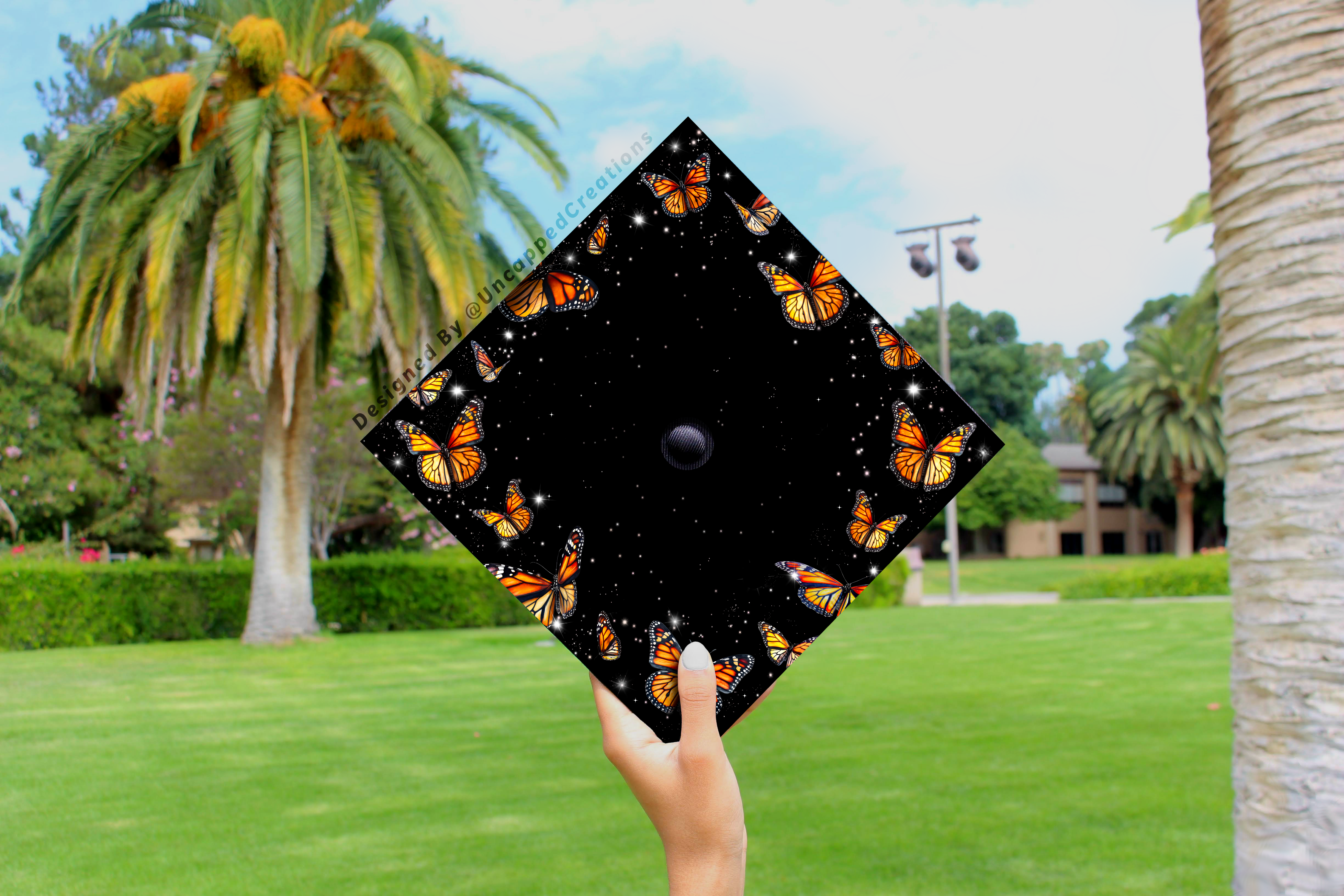 Design is 9.5 x 9.5 inches with an approximate 1 inch hole in the center and double sided adhesive in the back. Design is printed on cardstock, not hand painted. The topper will fit the standard 9 x 9 inches graduation cap / mortar board. (If you need a different size, please let me know the size IN INCHES that you need it for.)