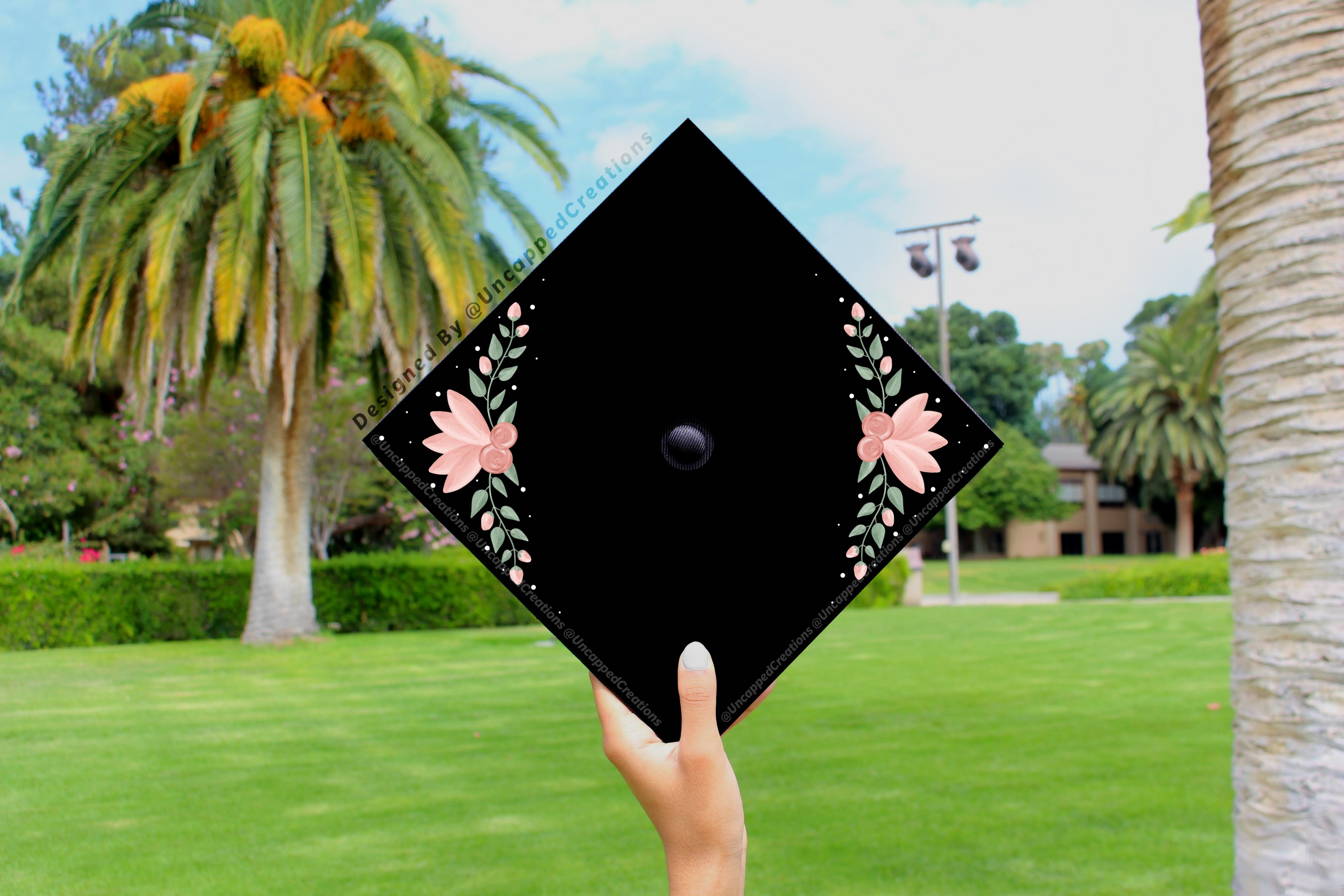 Design is 9.5 x 9.5 inches with an approximate 1 inch hole in the center and double sided adhesive in the back. Design is printed on cardstock, not hand painted. The topper will fit the standard 9 x 9 inches graduation cap / mortar board. (If you need a different size, please let me know the size IN INCHES that you need it for.)