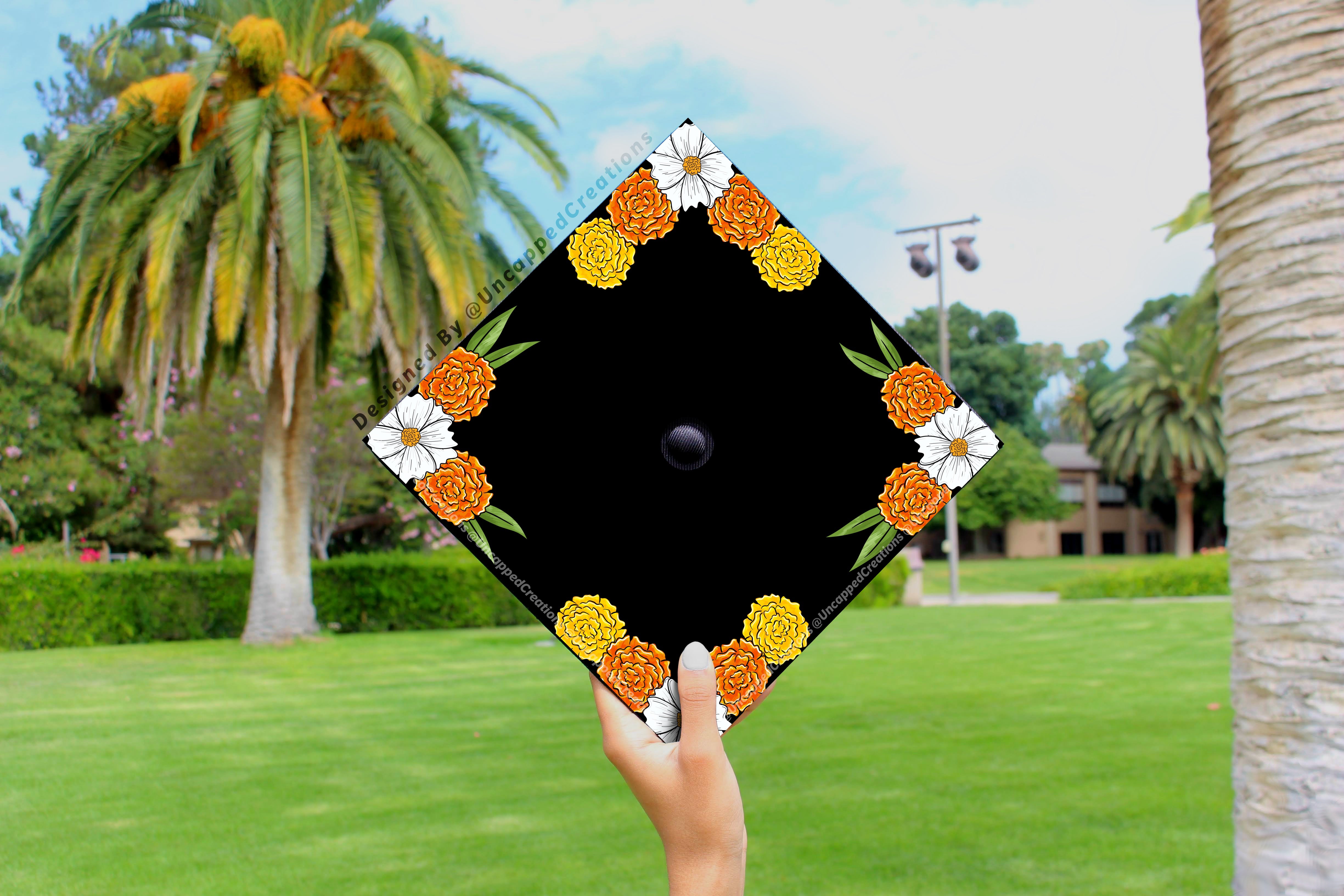 Design is 9.5 x 9.5 inches with an approximate 1 inch hole in the center and double sided adhesive in the back. Design is printed on cardstock, not hand painted. The topper will fit the standard 9 x 9 inches graduation cap / mortar board. (If you need a different size, please let me know the size IN INCHES that you need it for.)