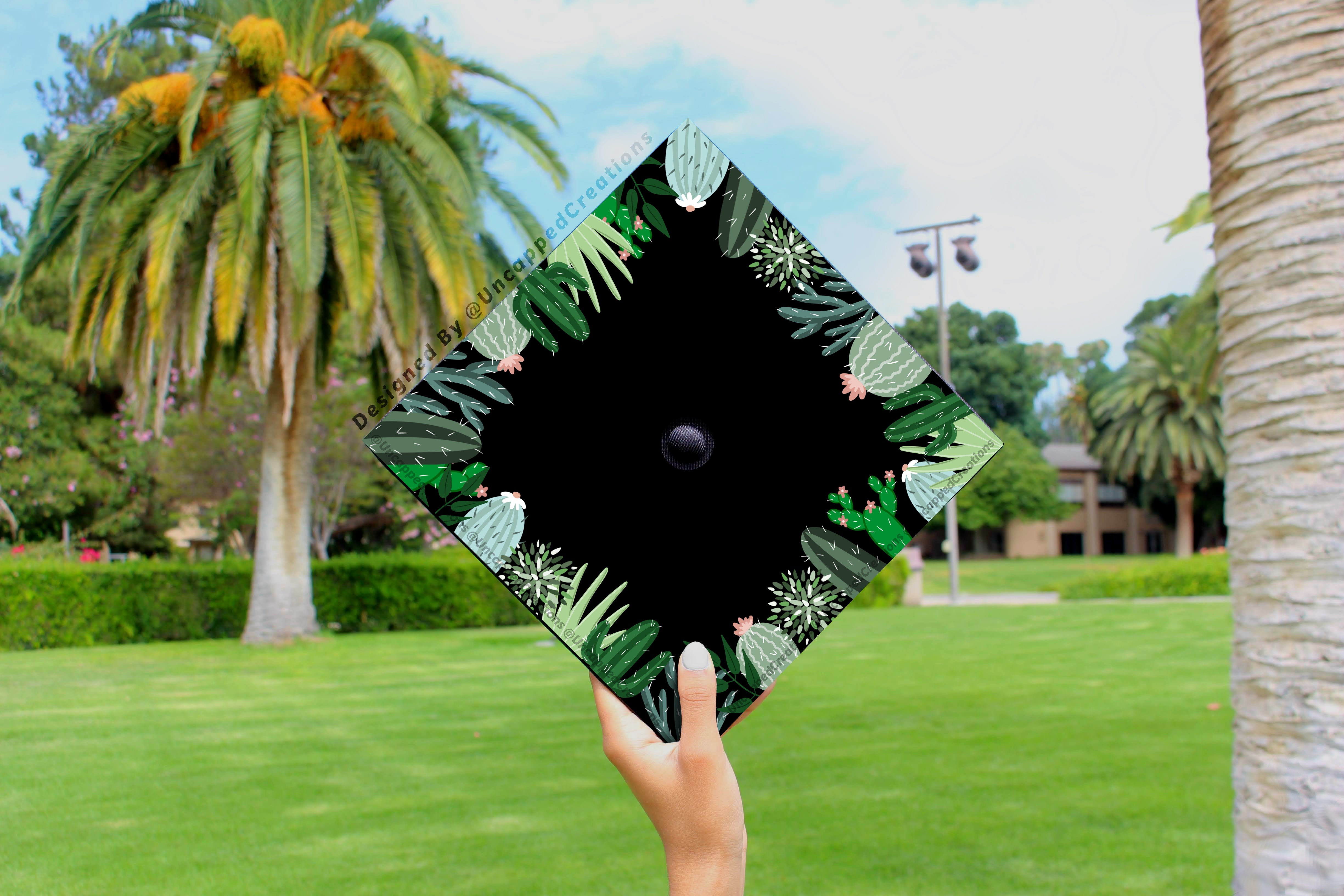 Design is 9.5 x 9.5 inches with an approximate 1 inch hole in the center and double sided adhesive in the back. Design is printed on cardstock, not hand painted. The topper will fit the standard 9 x 9 inches graduation cap / mortar board. (If you need a different size, please let me know the size IN INCHES that you need it for.)