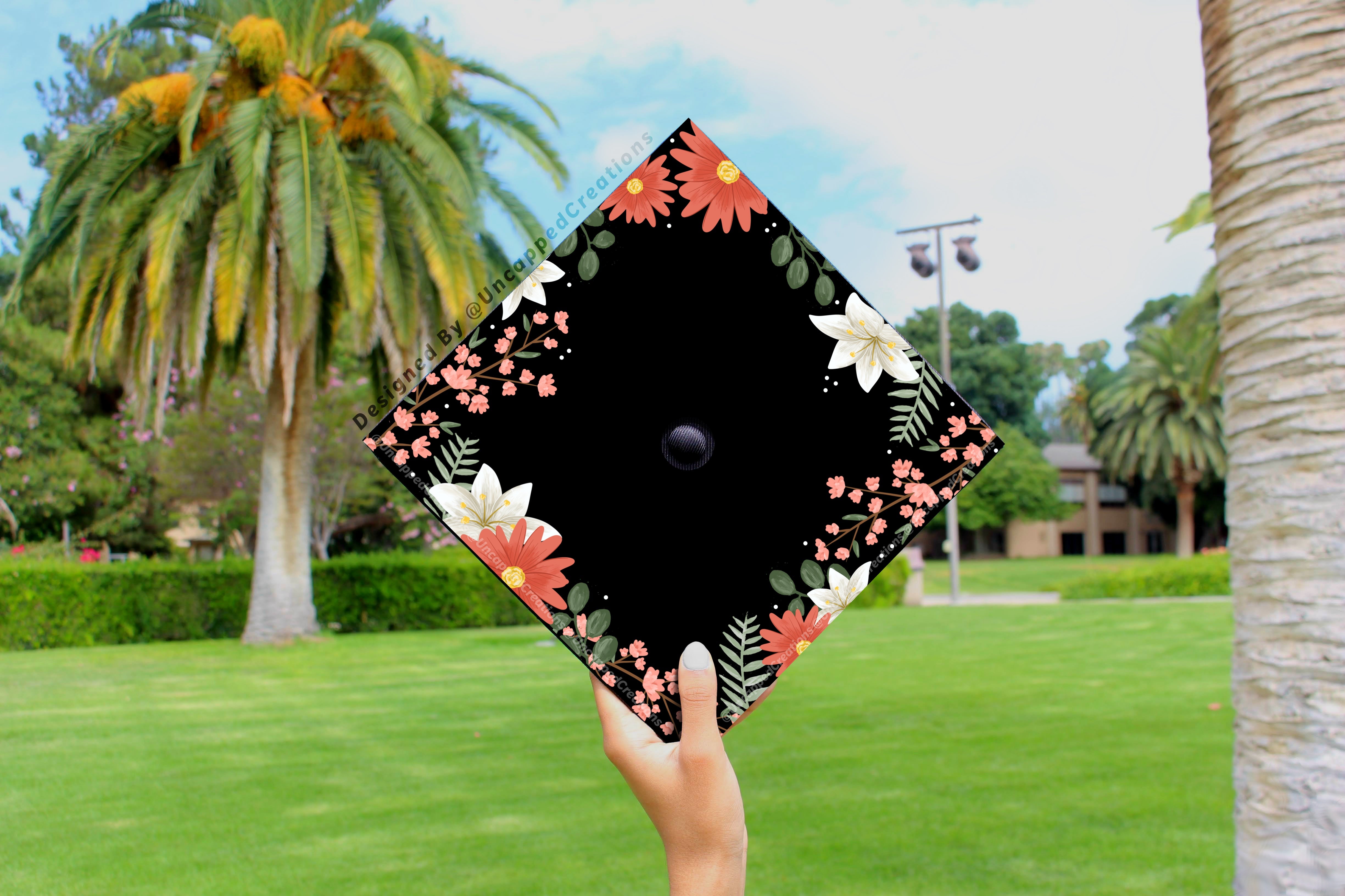 Design is 9.5 x 9.5 inches with an approximate 1 inch hole in the center and double sided adhesive in the back. Design is printed on cardstock, not hand painted. The topper will fit the standard 9 x 9 inches graduation cap / mortar board. (If you need a different size, please let me know the size IN INCHES that you need it for.)