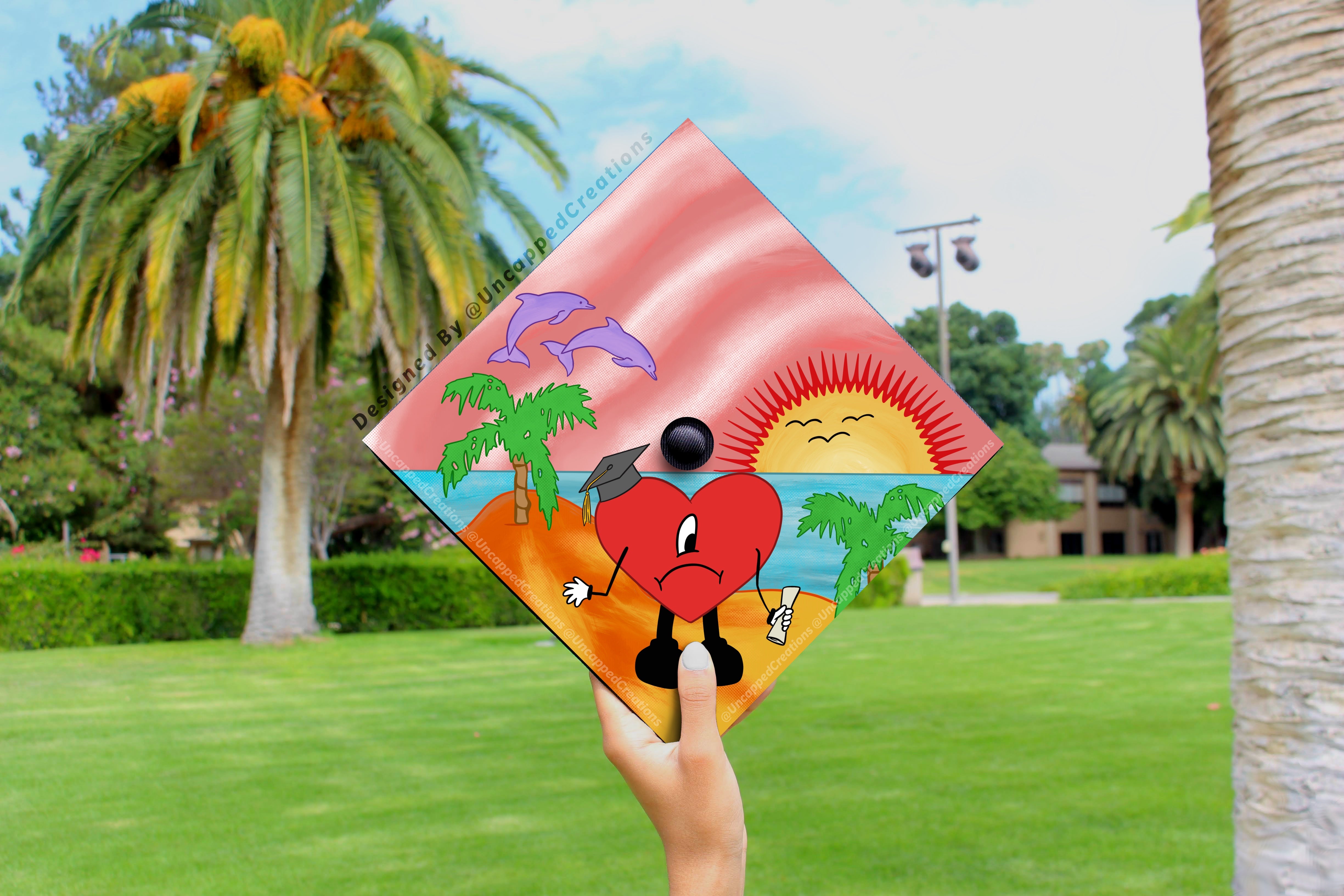 Design is 9.5 x 9.5 inches with an approximate 1 inch hole in the center and double sided adhesive in the back. Design is printed on cardstock, not hand painted. The topper will fit the standard 9 x 9 inches graduation cap / mortar board. (If you need a different size, please let me know the size IN INCHES that you need it for.)