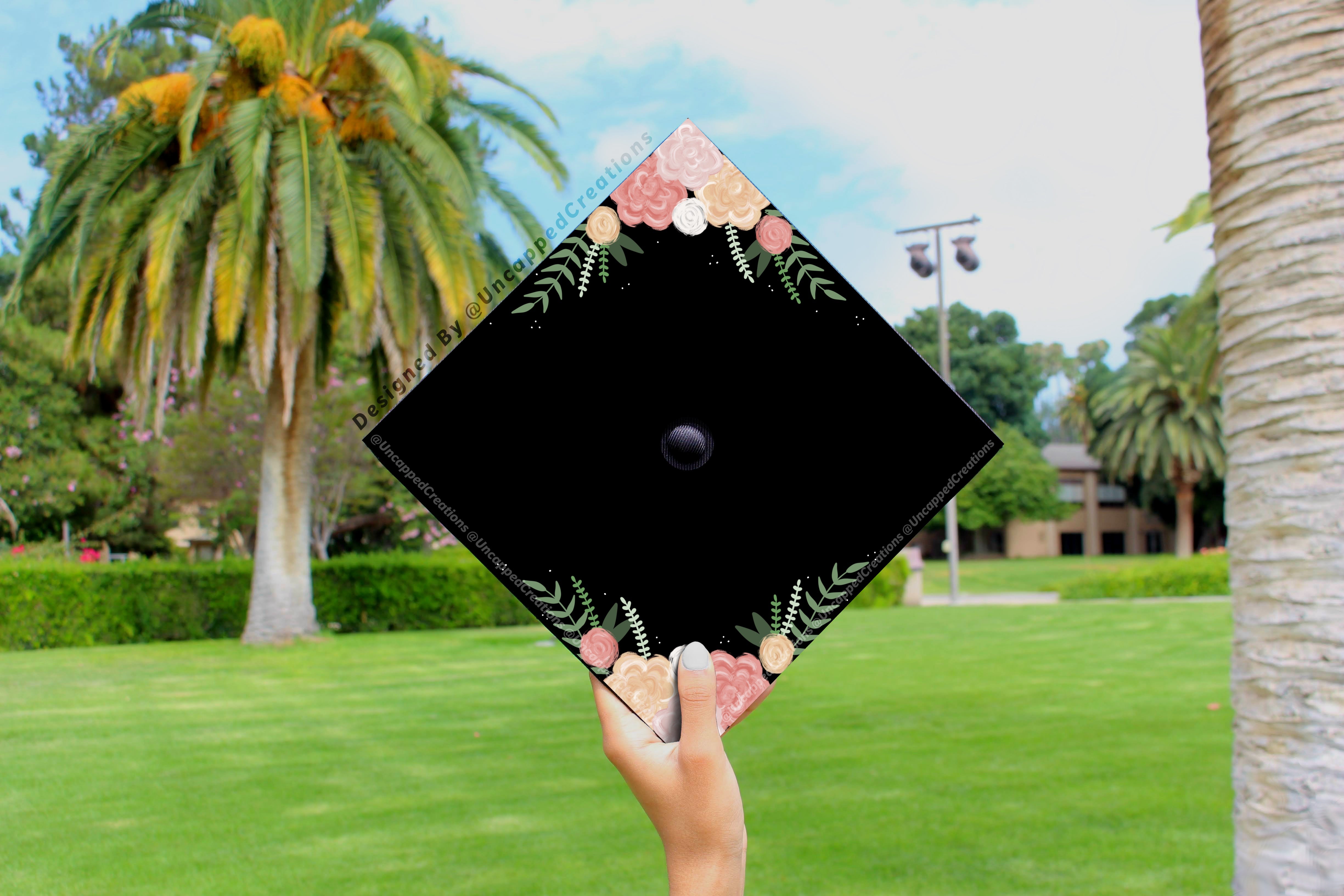 Design is 9.5 x 9.5 inches with an approximate 1 inch hole in the center and double sided adhesive in the back. Design is printed on cardstock, not hand painted. The topper will fit the standard 9 x 9 inches graduation cap / mortar board. (If you need a different size, please let me know the size IN INCHES that you need it for.)