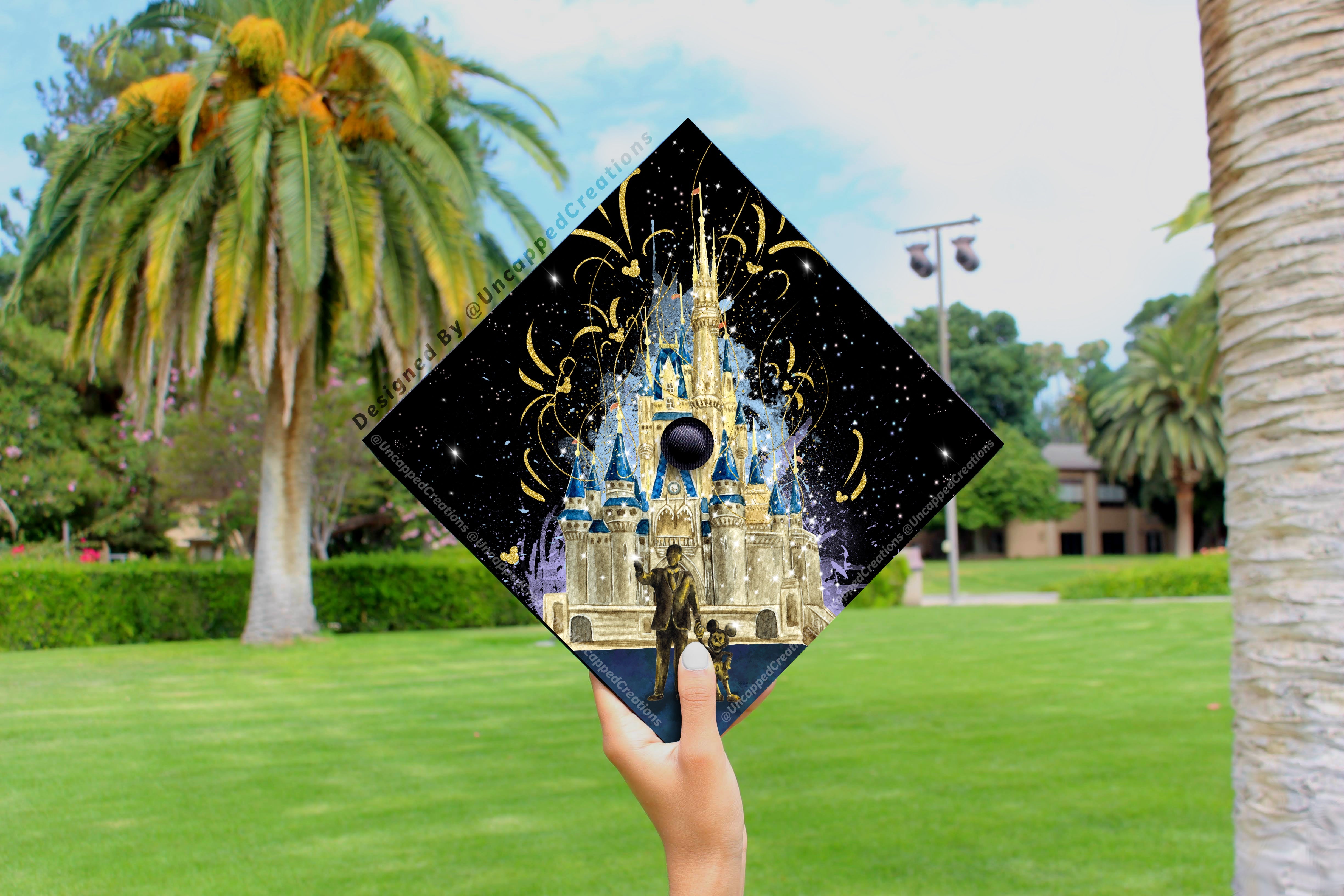 Design is 9.5 x 9.5 inches with an approximate 1 inch hole in the center and double sided adhesive in the back. Design is printed on cardstock, not hand painted. The topper will fit the standard 9 x 9 inches graduation cap / mortar board. (If you need a different size, please let me know the size IN INCHES that you need it for.)