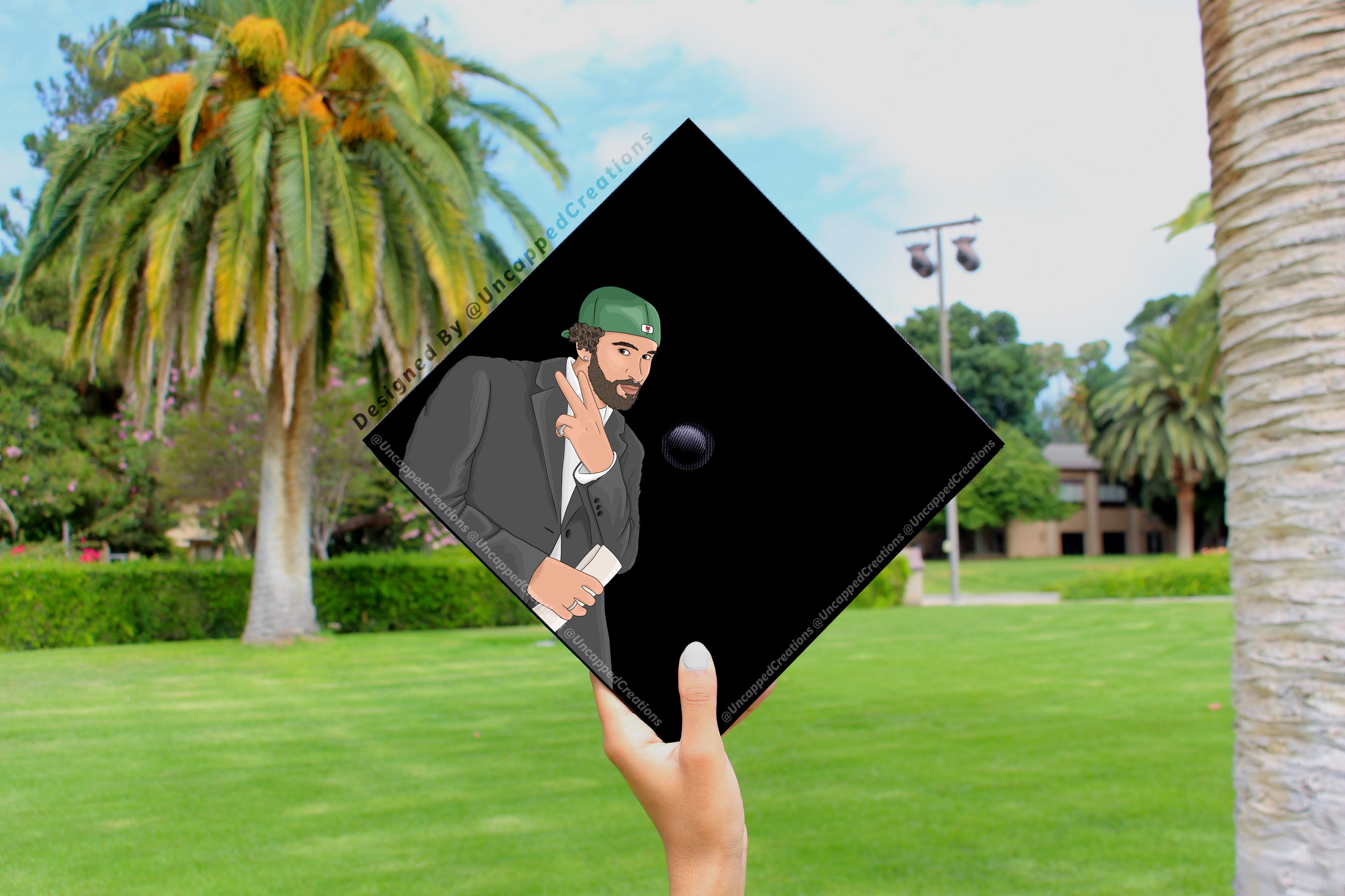 Design is 9.5 x 9.5 inches with an approximate 1 inch hole in the center and double sided adhesive in the back. Design is printed on cardstock, not hand painted. The topper will fit the standard 9 x 9 inches graduation cap / mortar board. (If you need a different size, please let me know the size IN INCHES that you need it for.)
