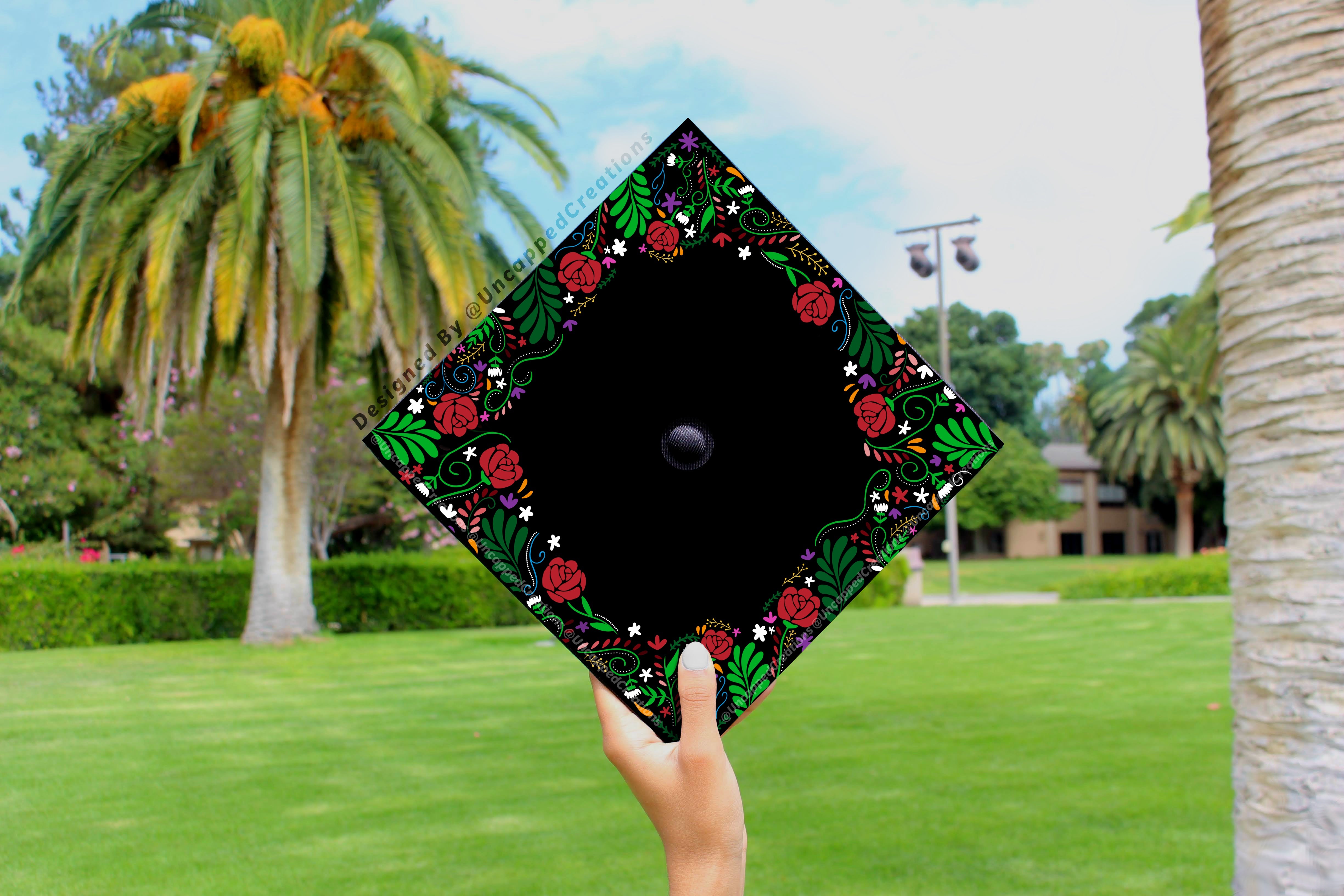 Design is 9.5 x 9.5 inches with an approximate 1 inch hole in the center and double sided adhesive in the back. Design is printed on cardstock, not hand painted. The topper will fit the standard 9 x 9 inches graduation cap / mortar board. (If you need a different size, please let me know the size IN INCHES that you need it for.)