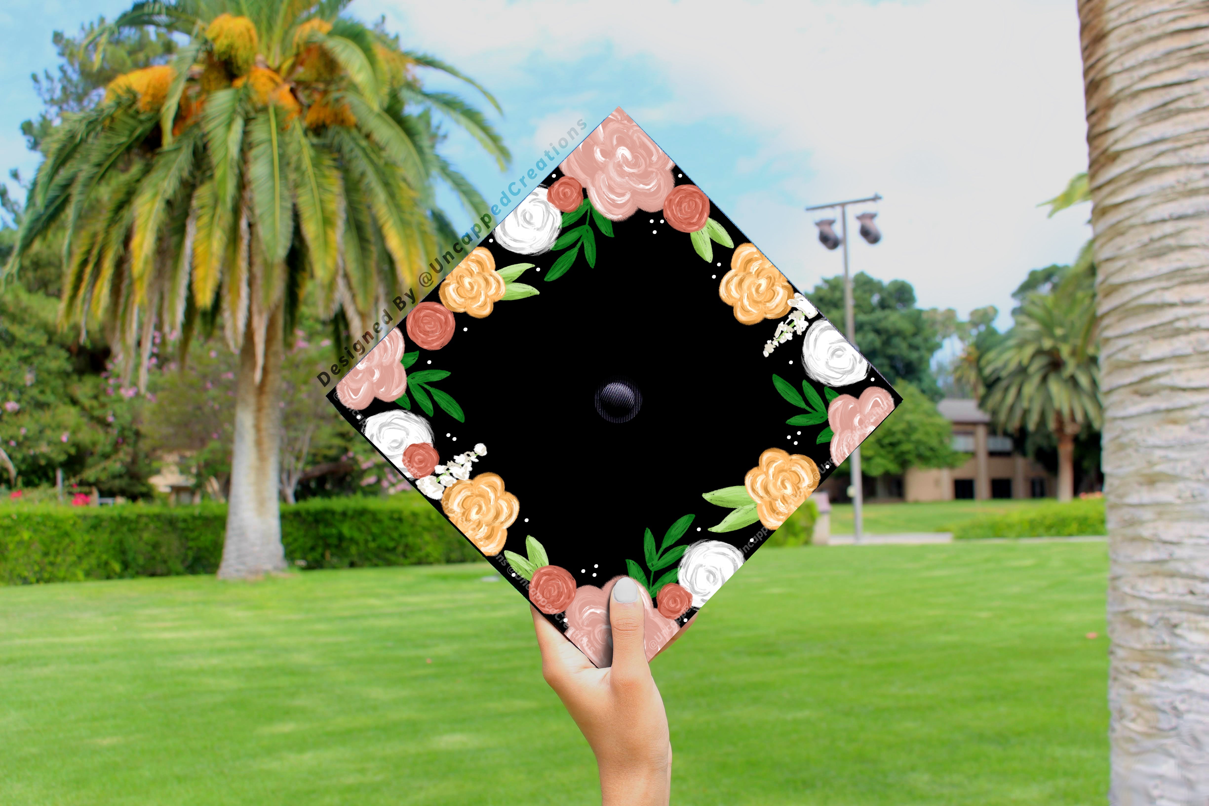 Design is 9.5 x 9.5 inches with an approximate 1 inch hole in the center and double sided adhesive in the back. Design is printed on cardstock, not hand painted. The topper will fit the standard 9 x 9 inches graduation cap / mortar board. (If you need a different size, please let me know the size IN INCHES that you need it for.)