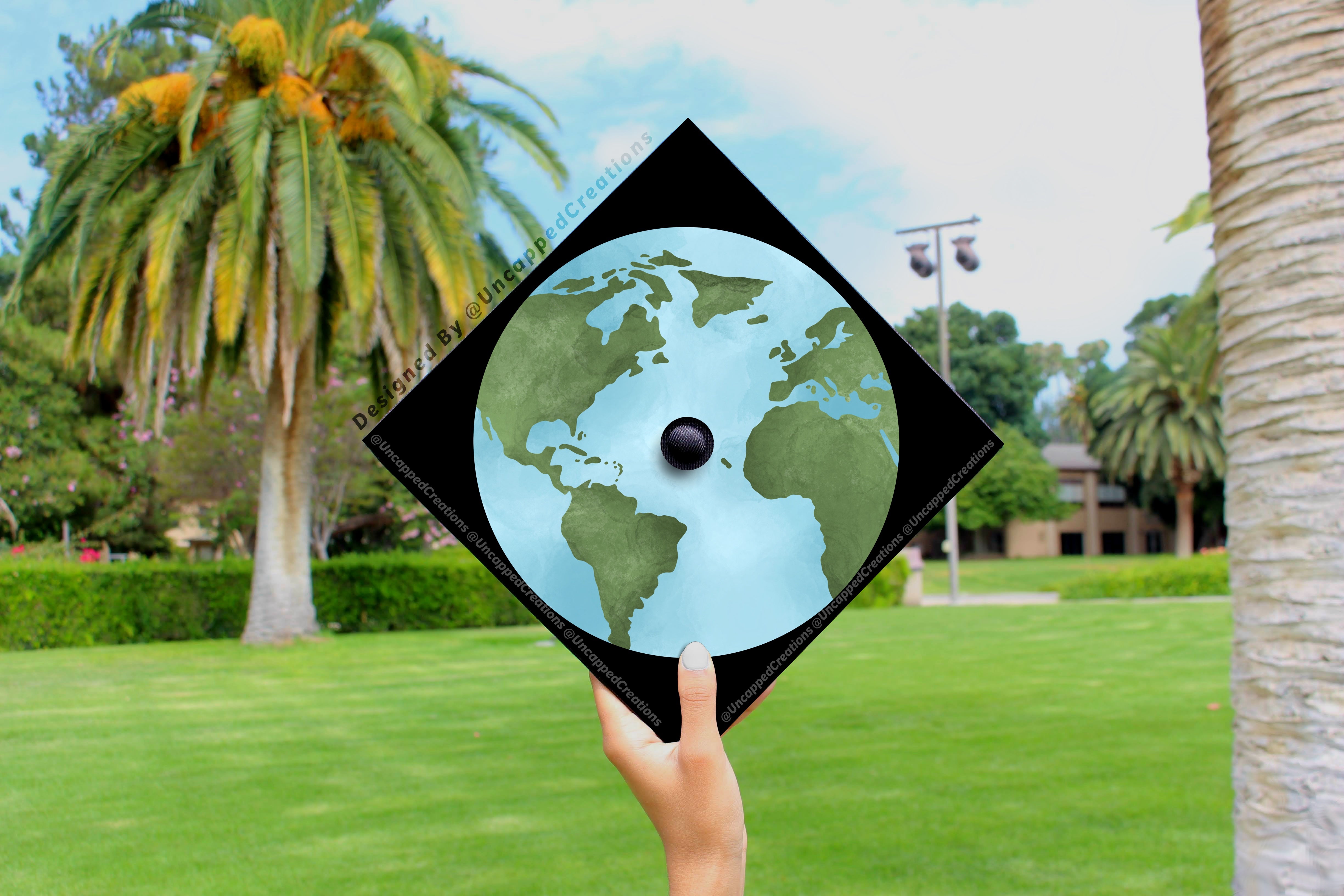 Design is 9.5 x 9.5 inches with an approximate 1 inch hole in the center and double sided adhesive in the back. Design is printed on cardstock, not hand painted. The topper will fit the standard 9 x 9 inches graduation cap / mortar board. (If you need a different size, please let me know the size IN INCHES that you need it for.)