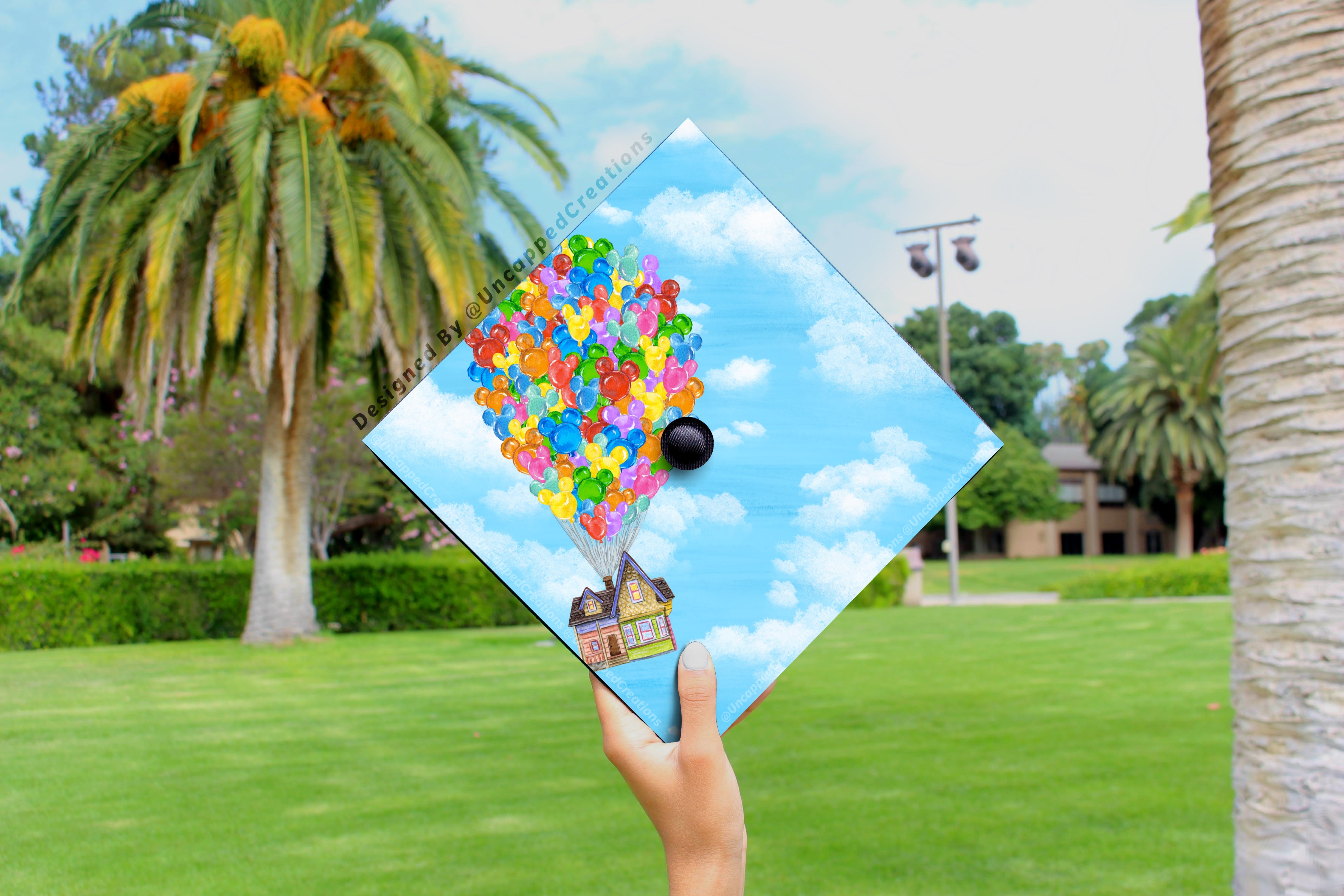 Design is 9.5 x 9.5 inches with an approximate 1 inch hole in the center and double sided adhesive in the back. Design is printed on cardstock, not hand painted. The topper will fit the standard 9 x 9 inches graduation cap / mortar board. (If you need a different size, please let me know the size IN INCHES that you need it for.)