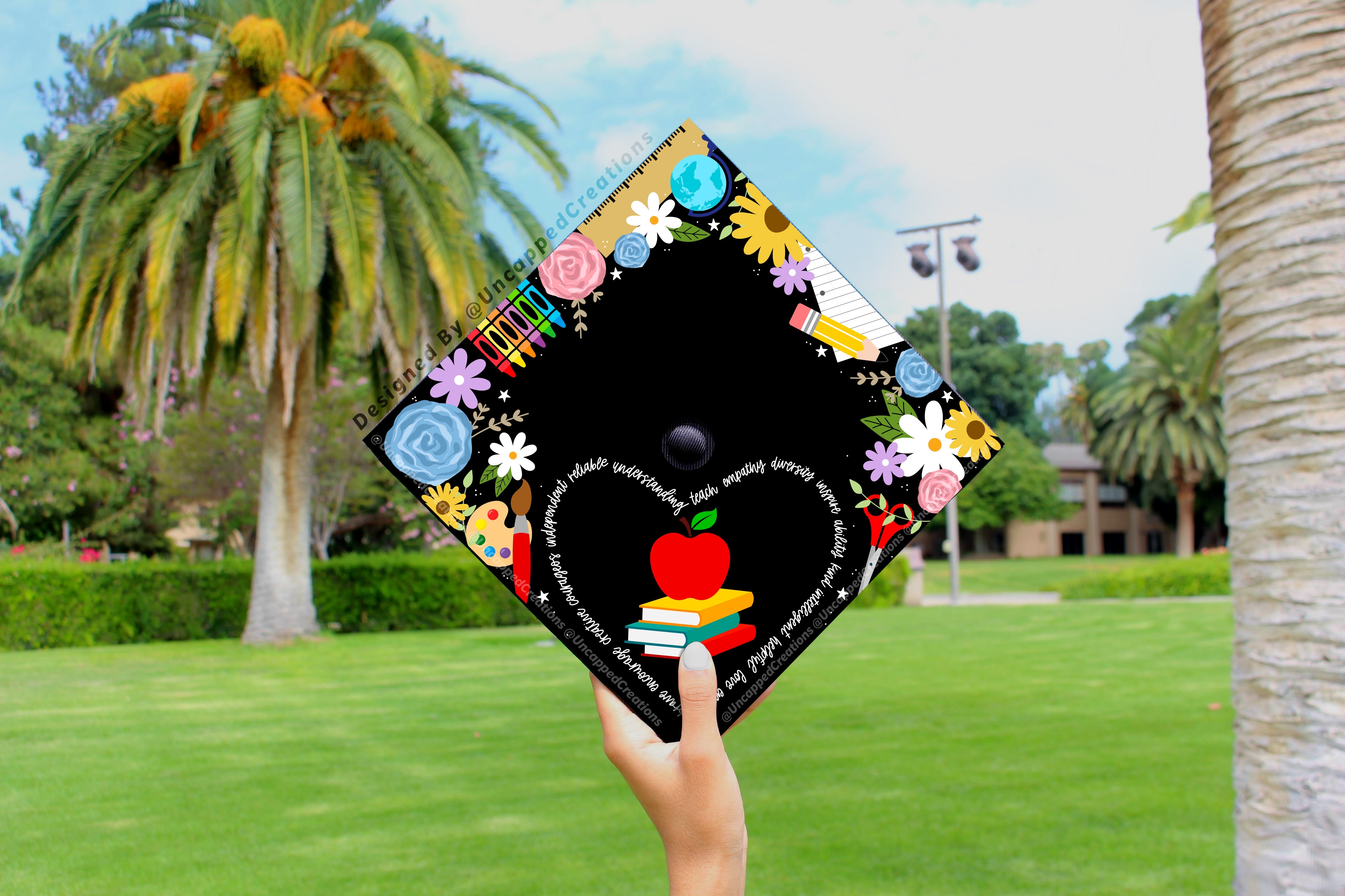 Design is 9.5 x 9.5 inches with an approximate 1 inch hole in the center and double sided adhesive in the back. Design is printed on cardstock, not hand painted. The topper will fit the standard 9 x 9 inches graduation cap / mortar board. (If you need a different size, please let me know the size IN INCHES that you need it for.)