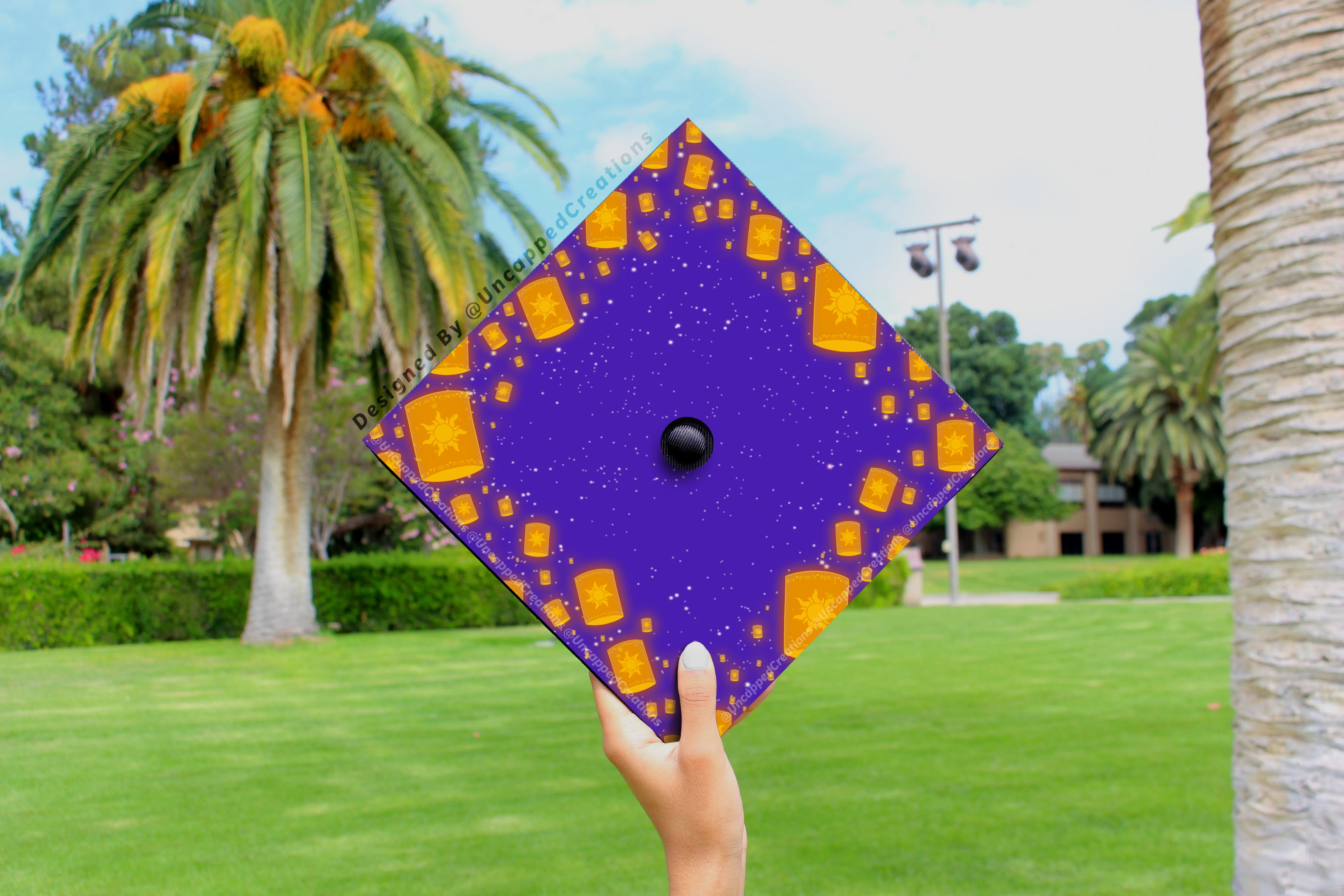 Design is 9.5 x 9.5 inches with an approximate 1 inch hole in the center and double sided adhesive in the back. Design is printed on cardstock, not hand painted. The topper will fit the standard 9 x 9 inches graduation cap / mortar board. (If you need a different size, please let me know the size IN INCHES that you need it for.)