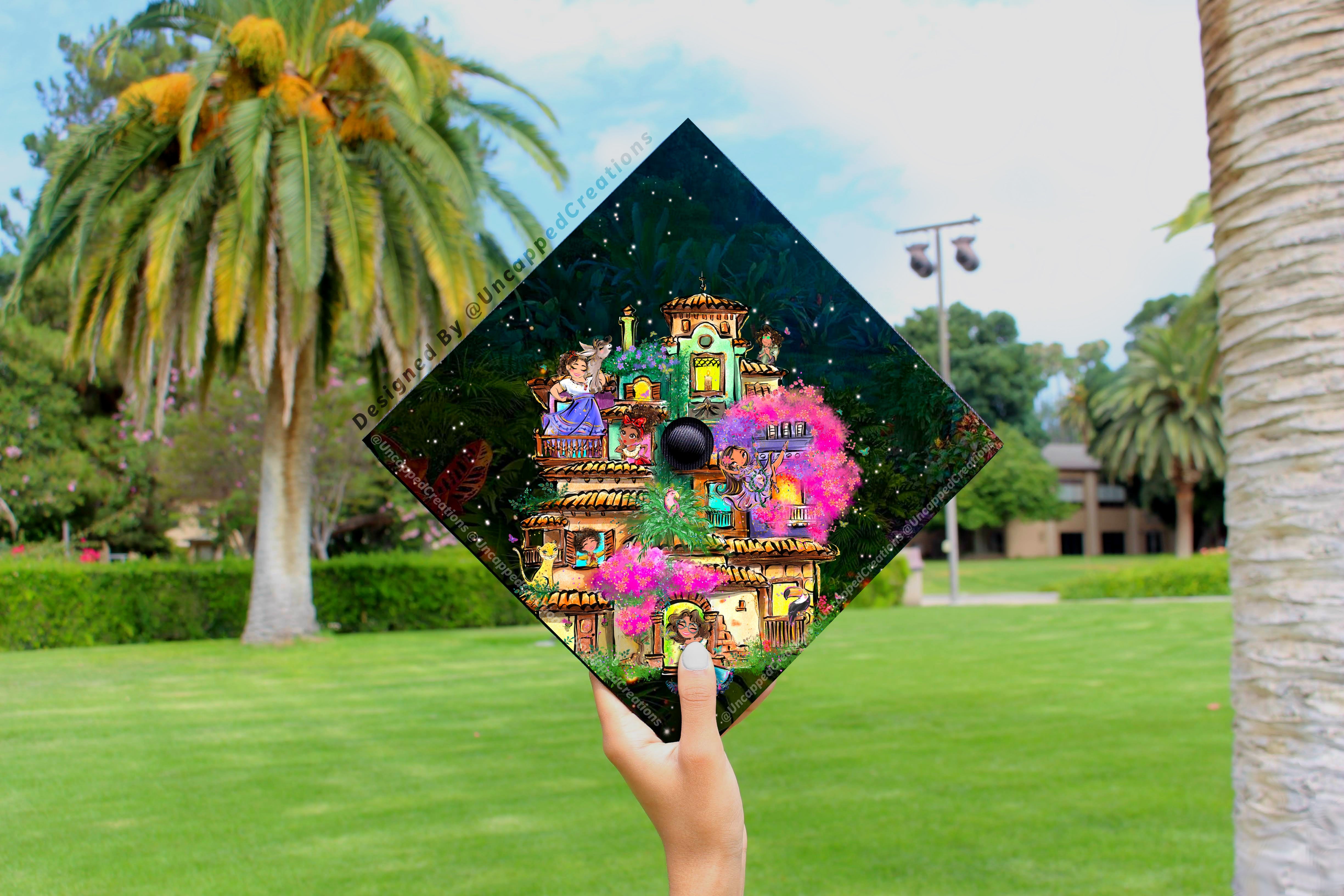 Design is 9.5 x 9.5 inches with an approximate 1 inch hole in the center and double sided adhesive in the back. Design is printed on cardstock, not hand painted. The topper will fit the standard 9 x 9 inches graduation cap / mortar board. (If you need a different size, please let me know the size IN INCHES that you need it for.)