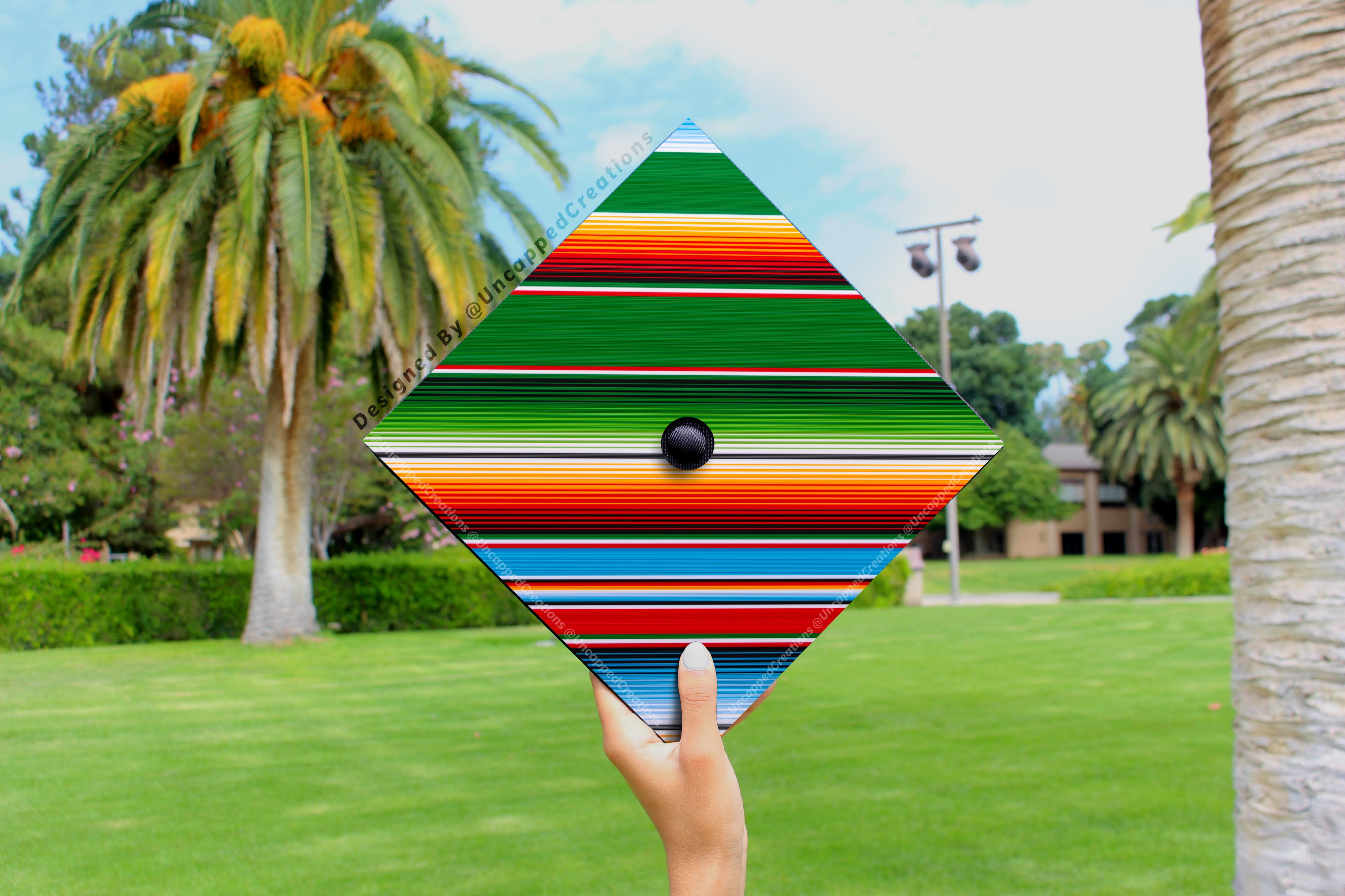 Design is 9.5 x 9.5 inches with an approximate 1 inch hole in the center and double sided adhesive in the back. Design is printed on cardstock, not hand painted. The topper will fit the standard 9 x 9 inches graduation cap / mortar board. (If you need a different size, please let me know the size IN INCHES that you need it for.)