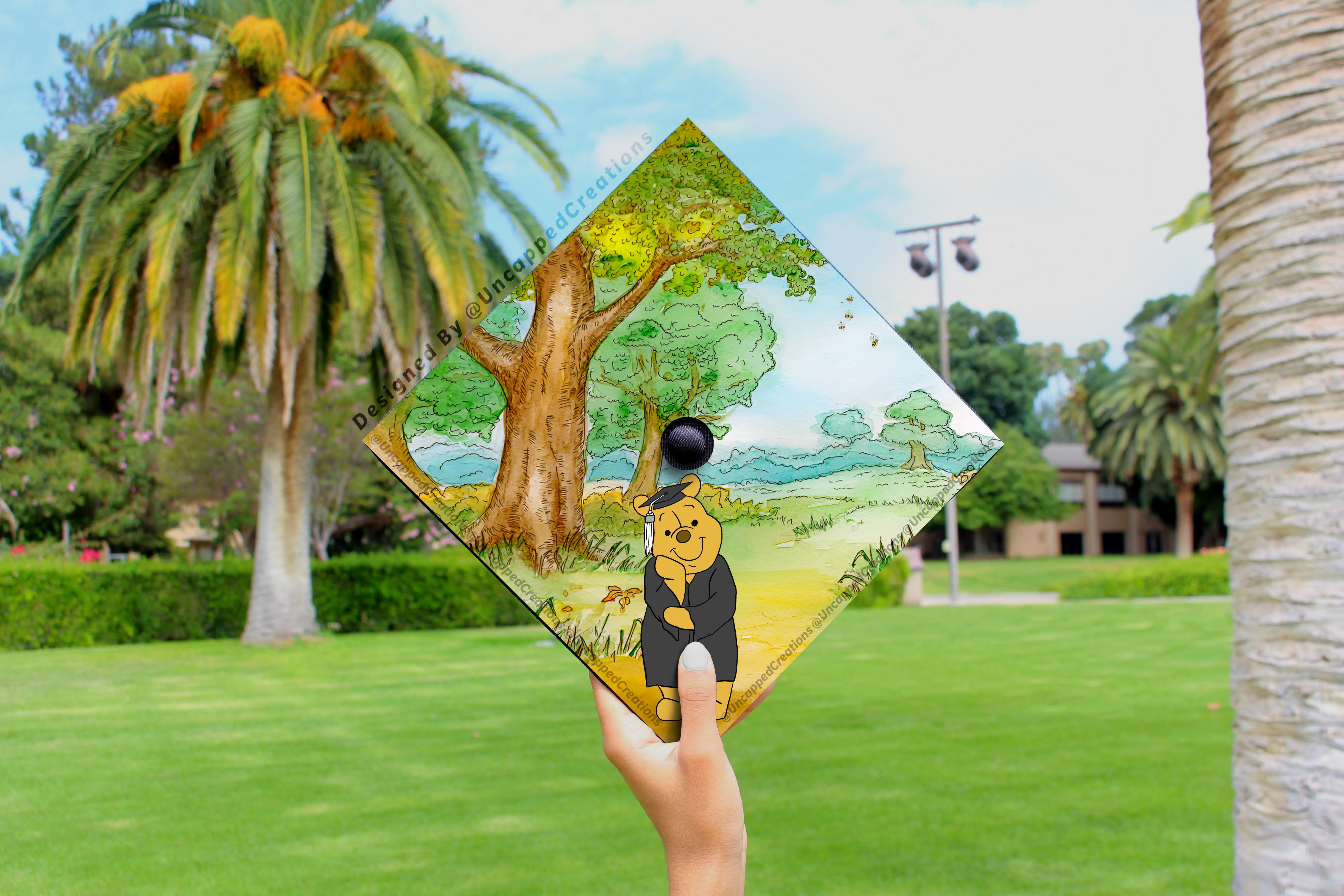 Design is 9.5 x 9.5 inches with an approximate 1 inch hole in the center and double sided adhesive in the back. Design is printed on cardstock, not hand painted. The topper will fit the standard 9 x 9 inches graduation cap / mortar board. (If you need a different size, please let me know the size IN INCHES that you need it for.)