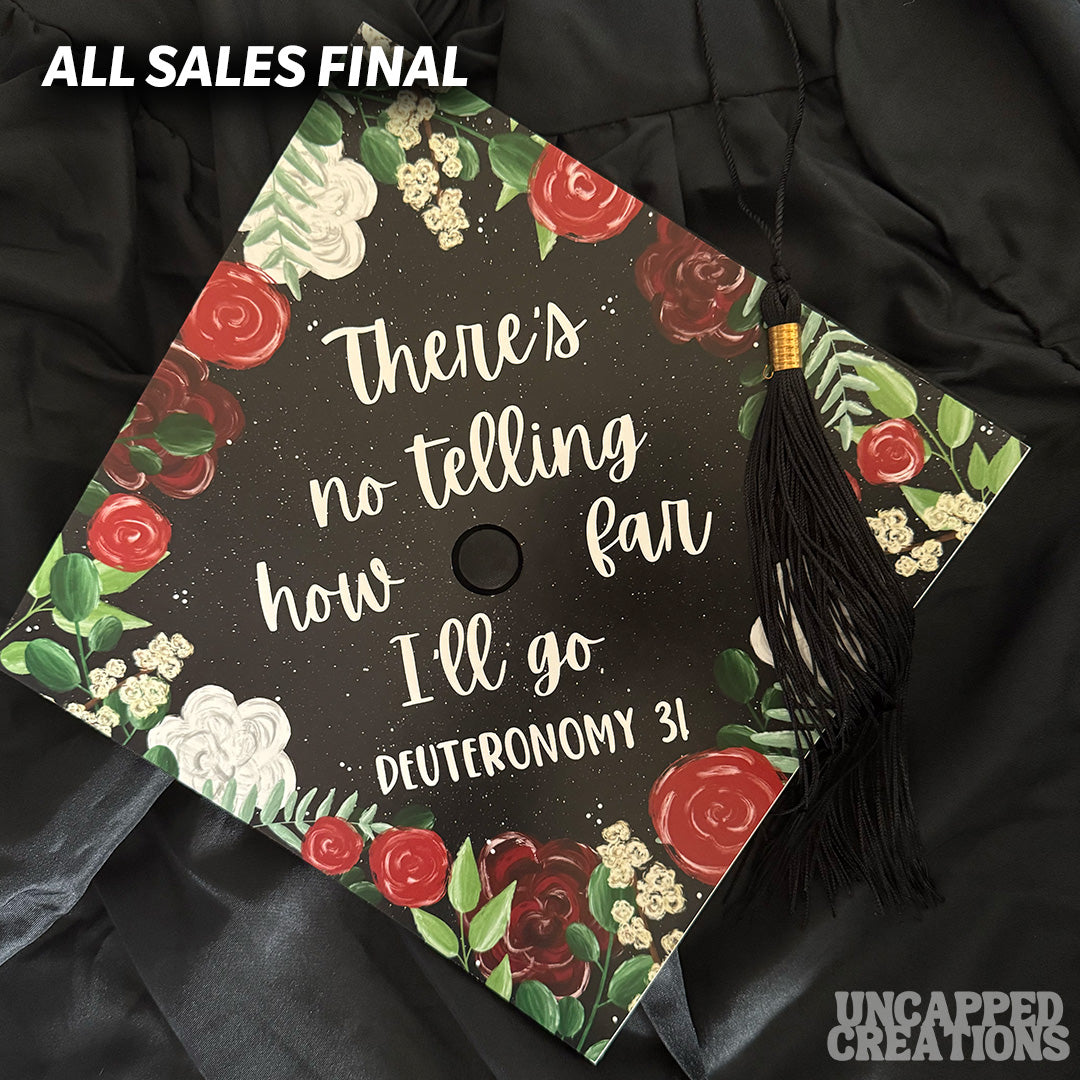 Design is 9.5 x 9.5 inches with an approximate 1 inch hole in the center and double sided adhesive in the back. Design is printed on cardstock, not hand painted, and rhinestoned on top. The topper will fit the standard 9 x 9 inches graduation cap / mortar board. Cap/Mortar board is not included. Center circle is not included.