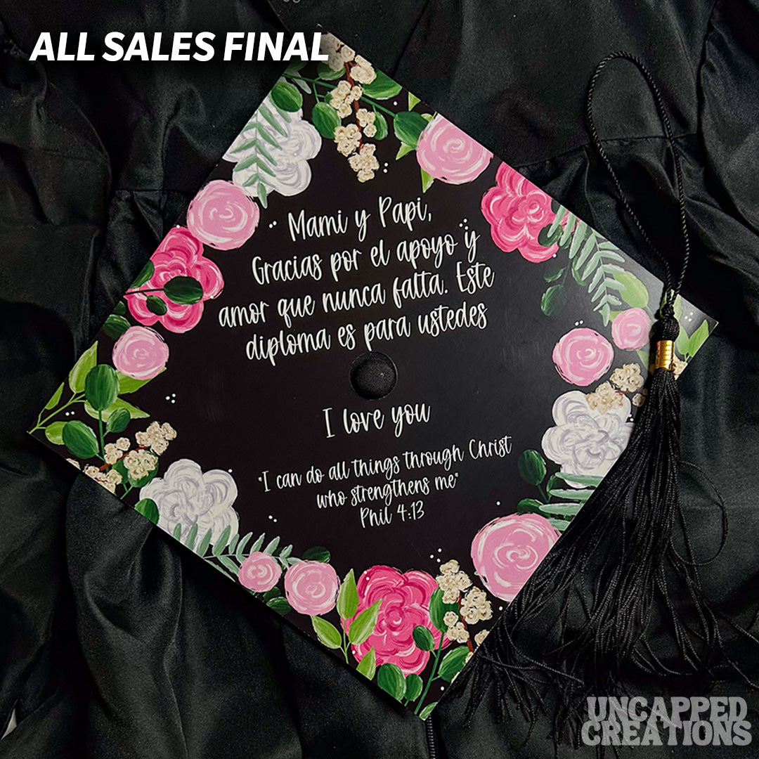 Design is 9.5 x 9.5 inches with an approximate 1 inch hole in the center and double sided adhesive in the back. Design is printed on cardstock, not hand painted, and rhinestoned on top. The topper will fit the standard 9 x 9 inches graduation cap / mortar board. Cap/Mortar board is not included. Center circle is not included.