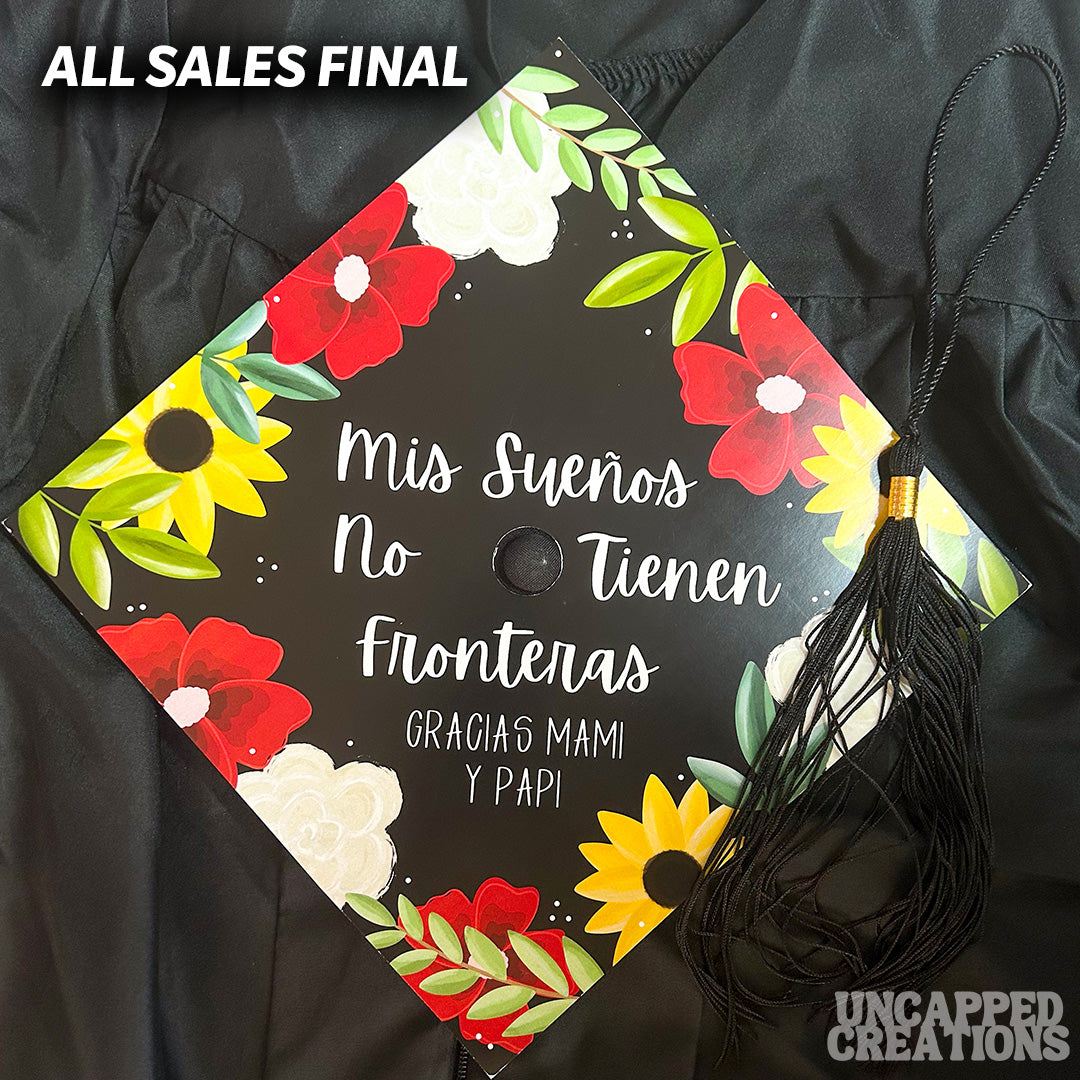 Keywords: spanish grad cap, sunflowers, red flowers, greenery