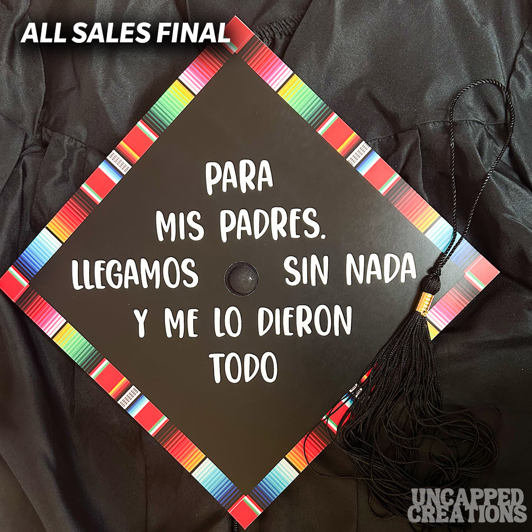 Design is 9.5 x 9.5 inches with an approximate 1 inch hole in the center and double sided adhesive in the back. Design is printed on cardstock, not hand painted, and rhinestoned on top. The topper will fit the standard 9 x 9 inches graduation cap / mortar board. Cap/Mortar board is not included. Center circle is not included.