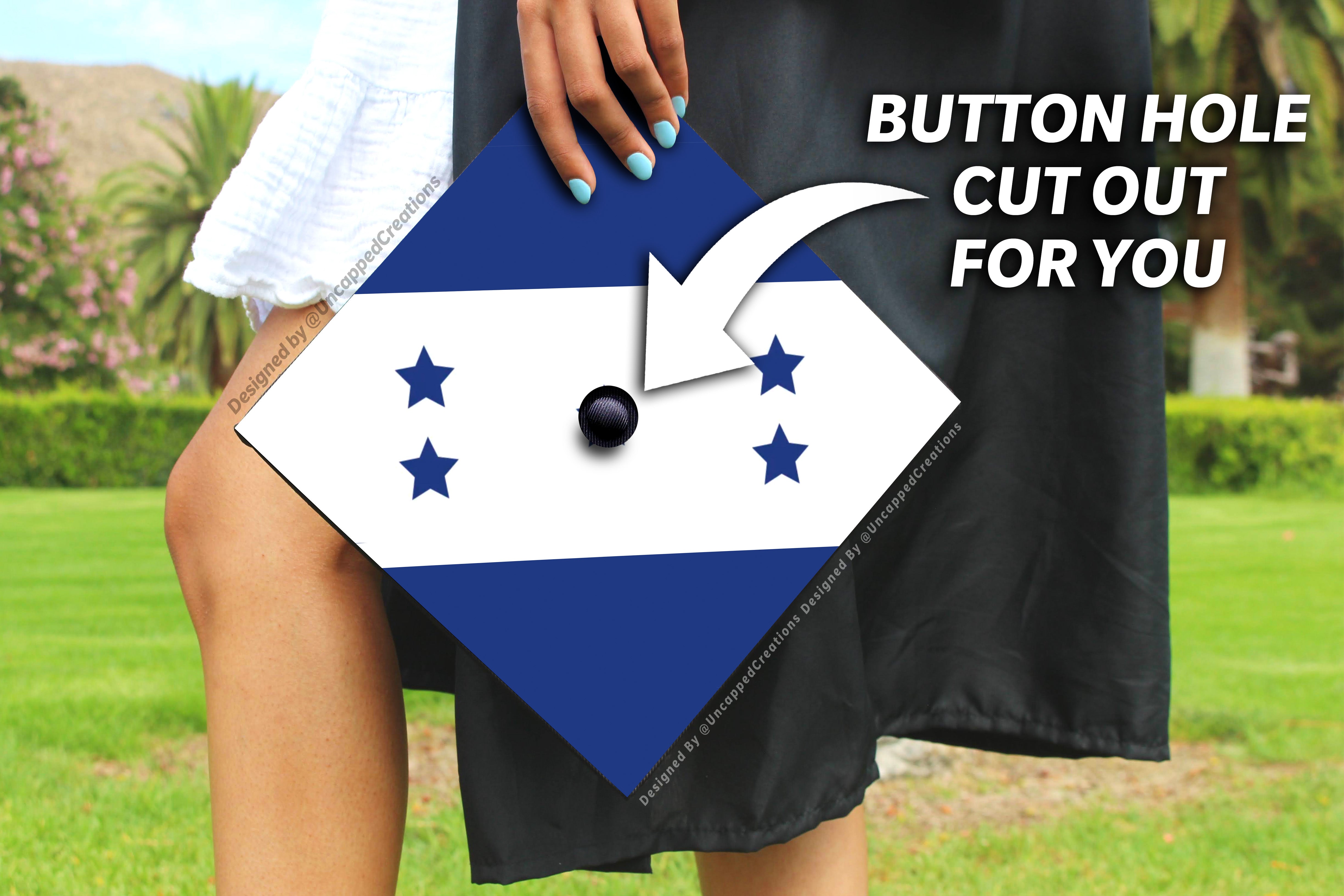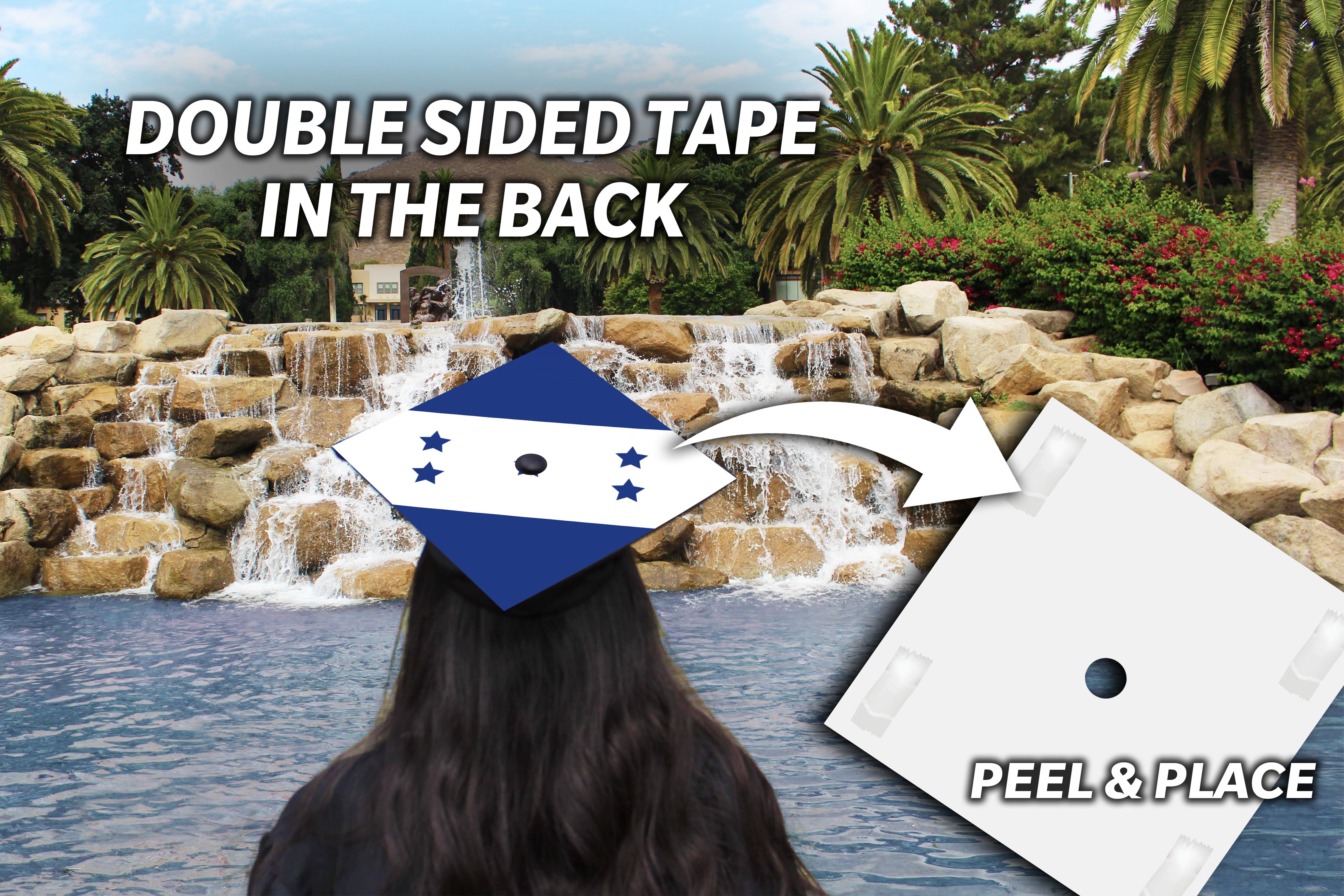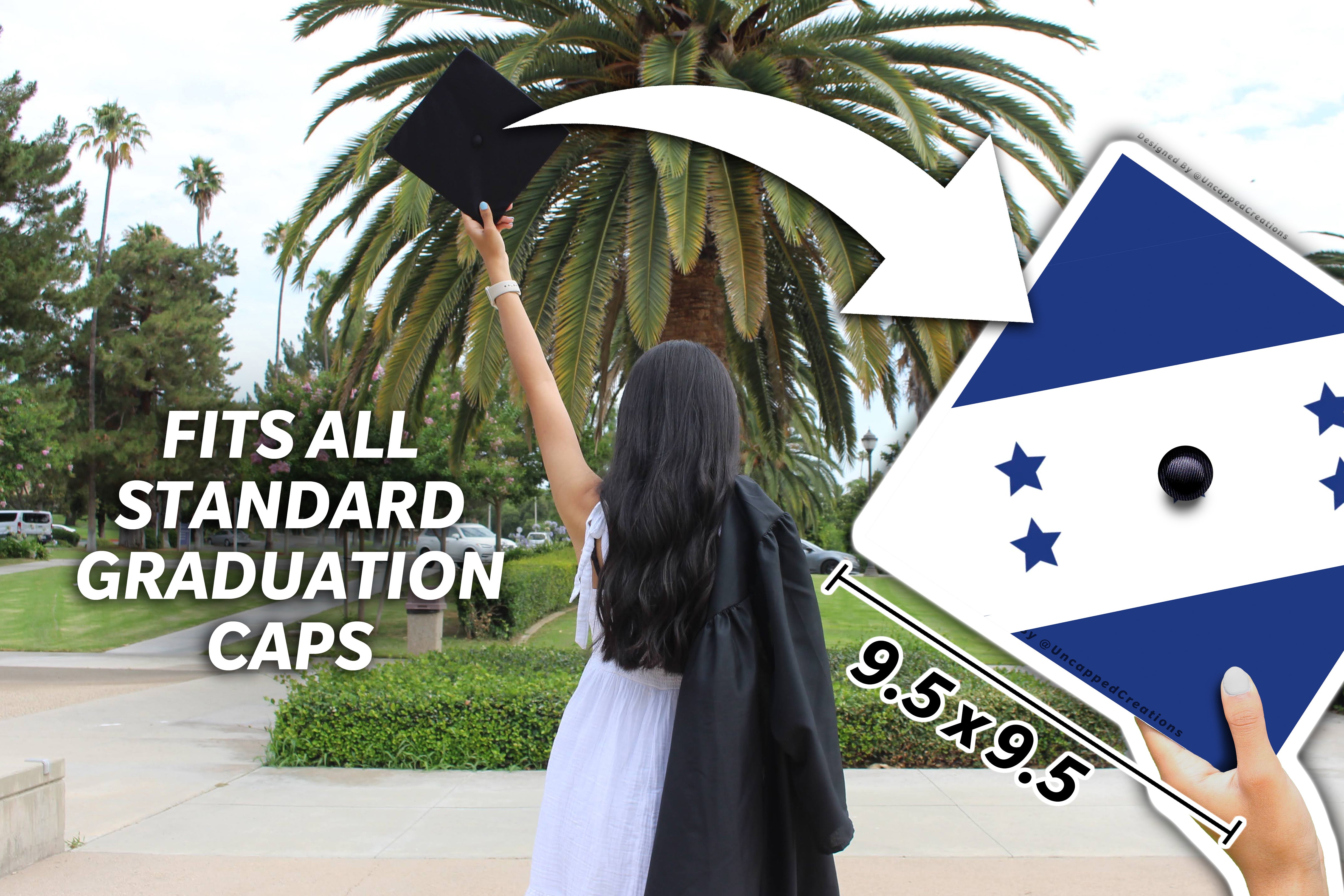 Design is 9.5 x 9.5 inches with an approximate 1 inch hole in the center and double sided adhesive in the back. Design is printed on cardstock, not hand painted. The topper will fit the standard 9 x 9 inches graduation cap / mortar board. Cap/Mortar board is not included. Center circle is not included.