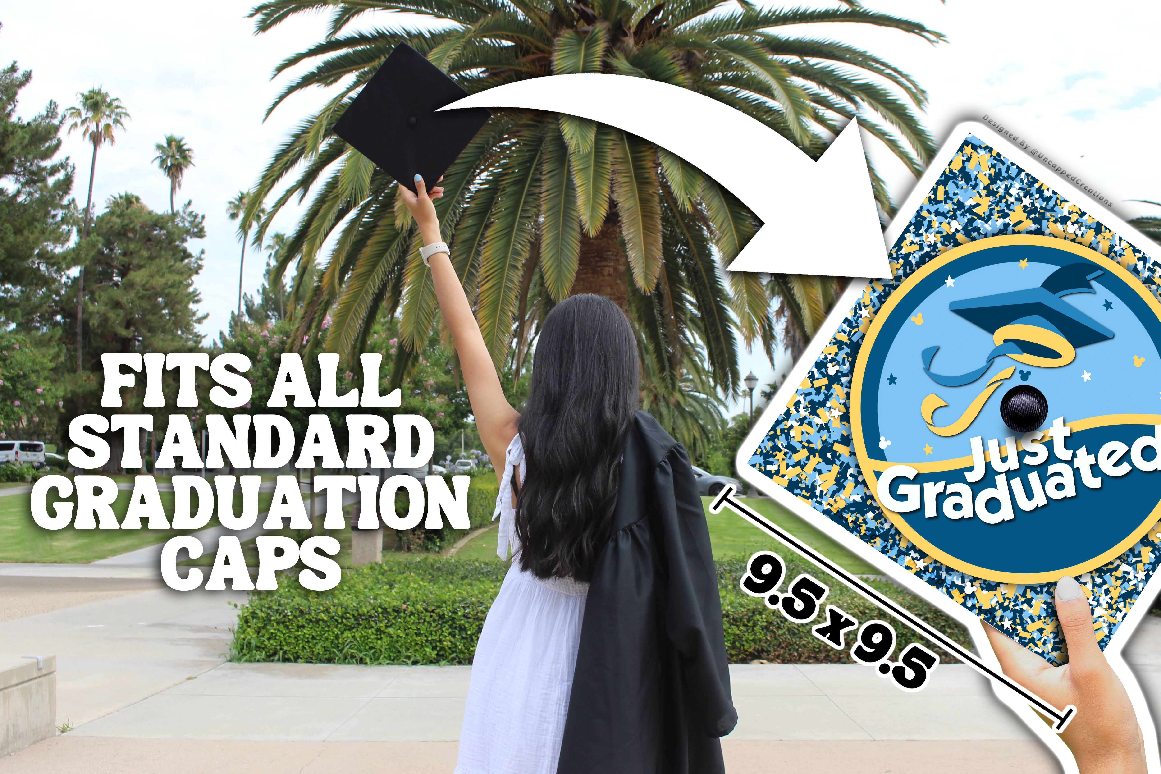 Design is 9.5 x 9.5 inches with an approximate 1 inch hole in the center and double sided adhesive in the back. Design is printed on cardstock, not hand painted. The topper will fit the standard 9 x 9 inches graduation cap / mortar board. Cap/Mortar board is not included. Center circle is not included.