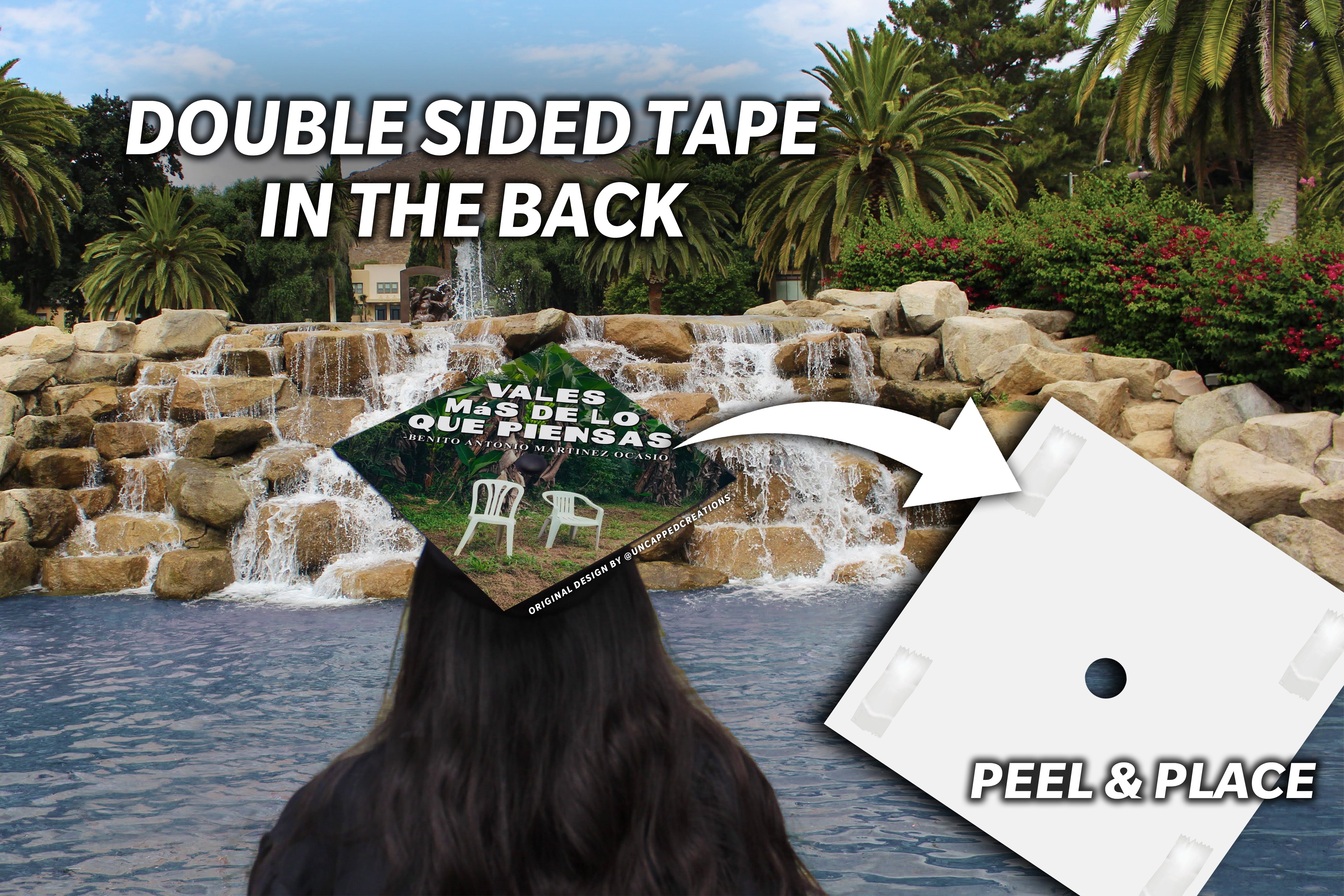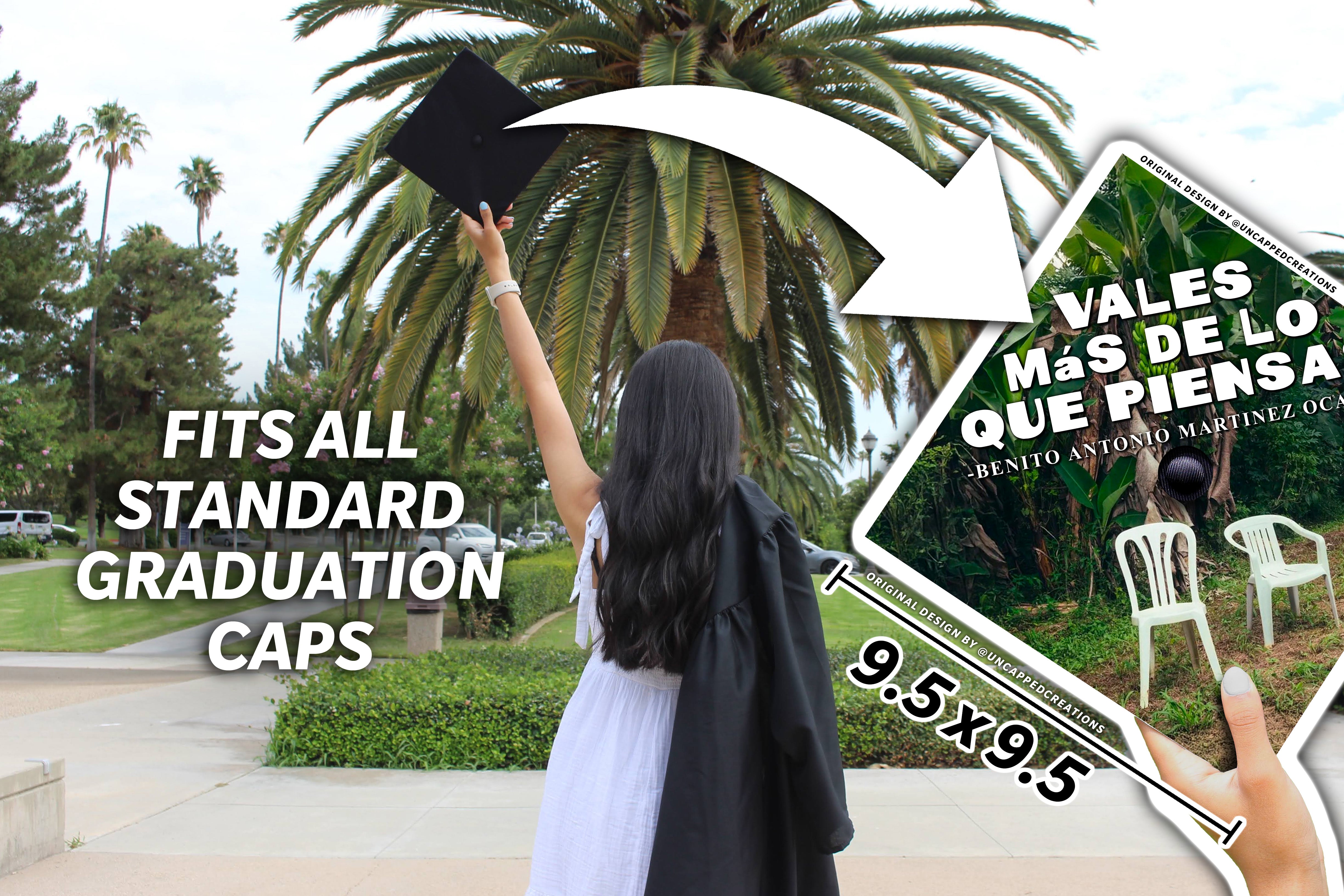Design is 9.5 x 9.5 inches with an approximate 1 inch hole in the center and double sided adhesive in the back. Design is printed on cardstock, not hand painted. The topper will fit the standard 9 x 9 inches graduation cap / mortar board. Cap/Mortar board is not included. Center circle is not included.