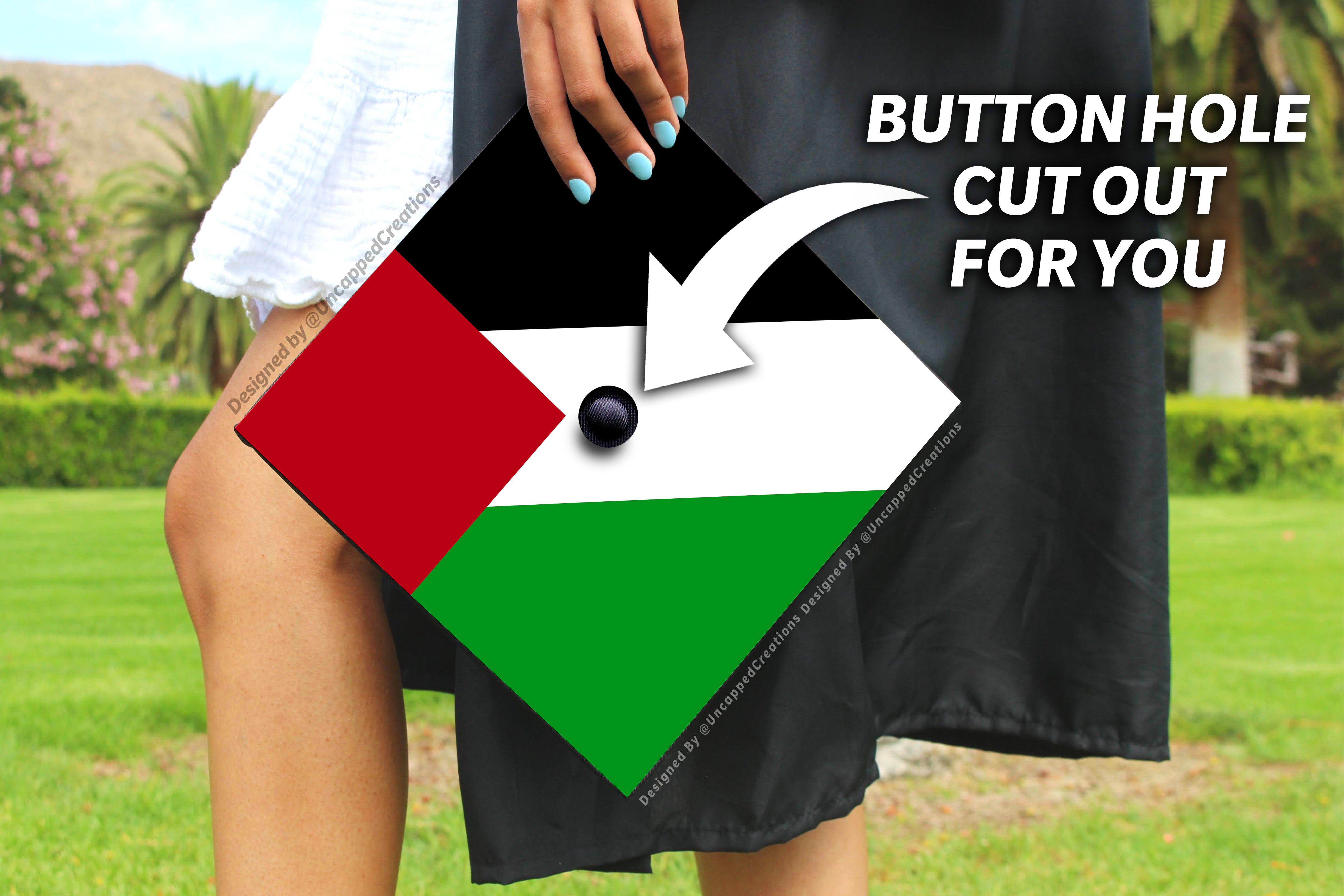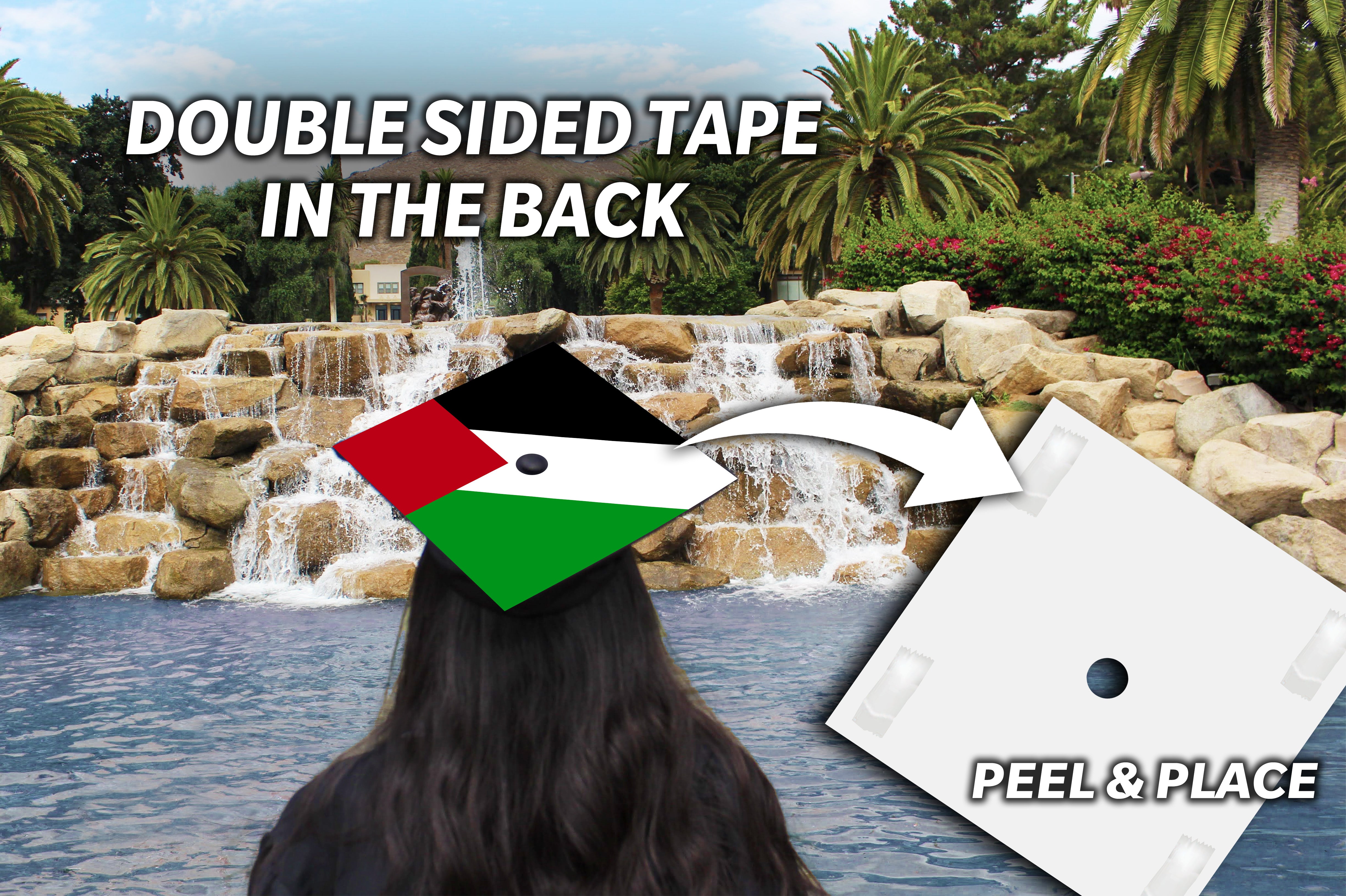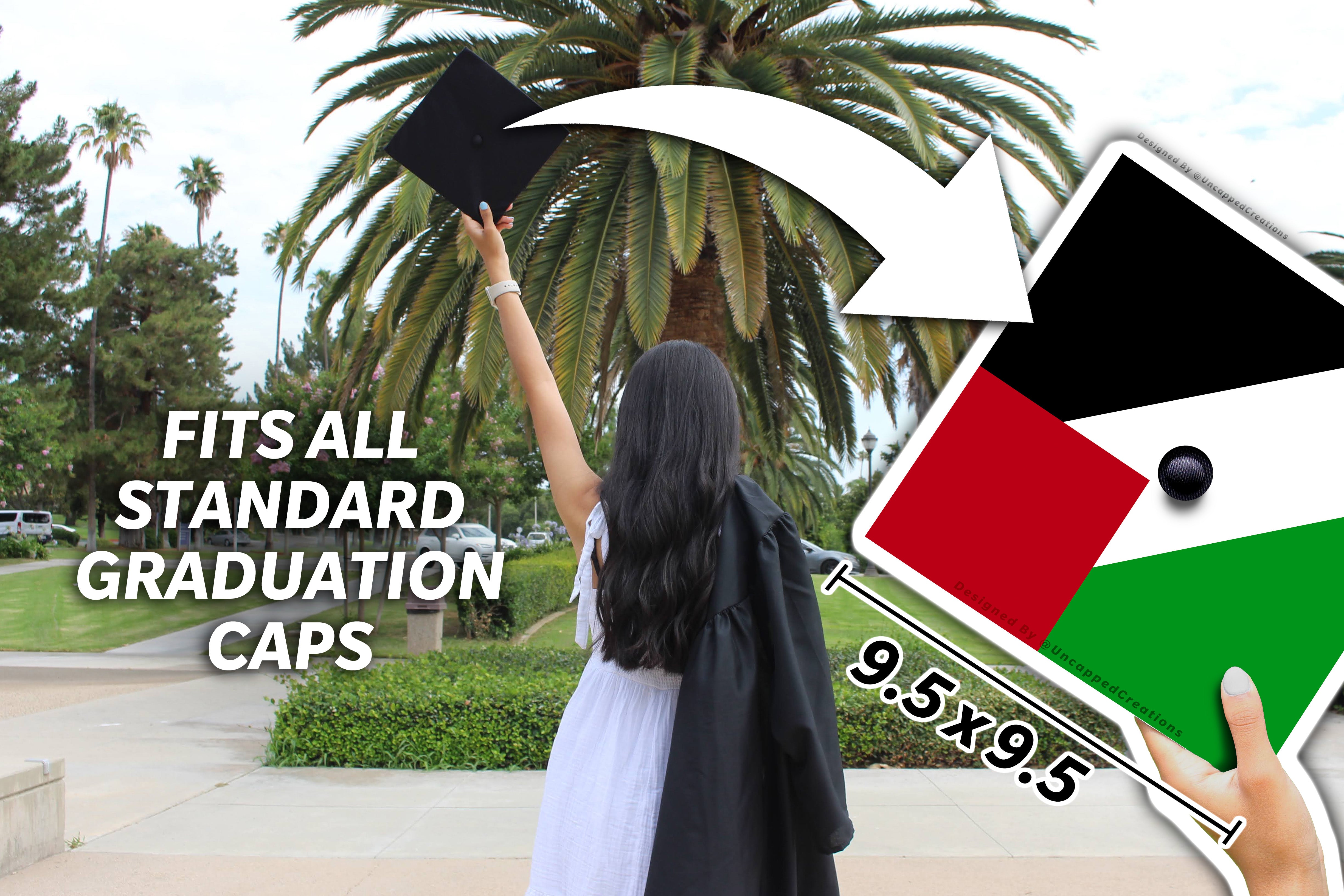 Design is 9.5 x 9.5 inches with an approximate 1 inch hole in the center and double sided adhesive in the back. Design is printed on cardstock, not hand painted. The topper will fit the standard 9 x 9 inches graduation cap / mortar board. Cap/Mortar board is not included. Center circle is not included.