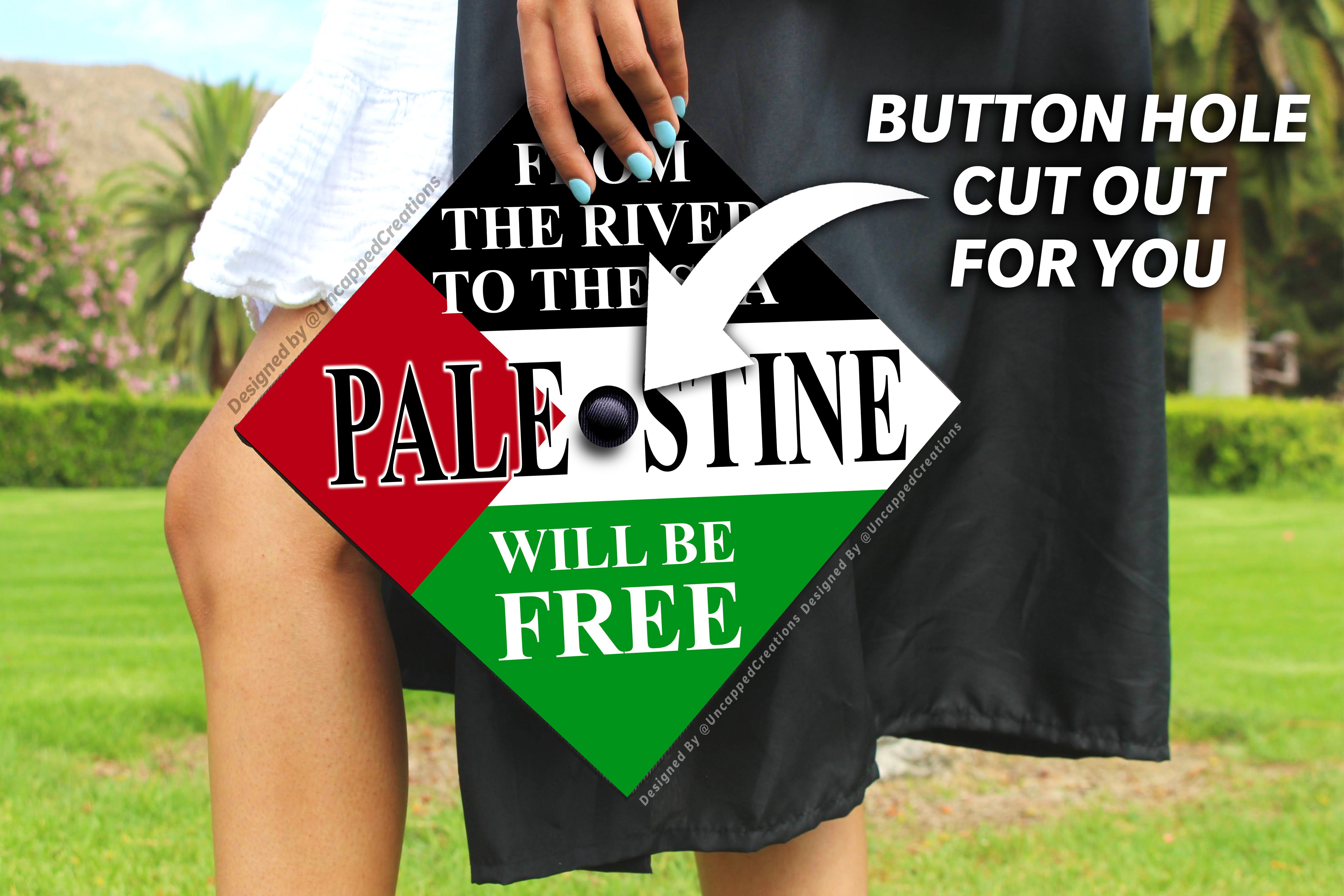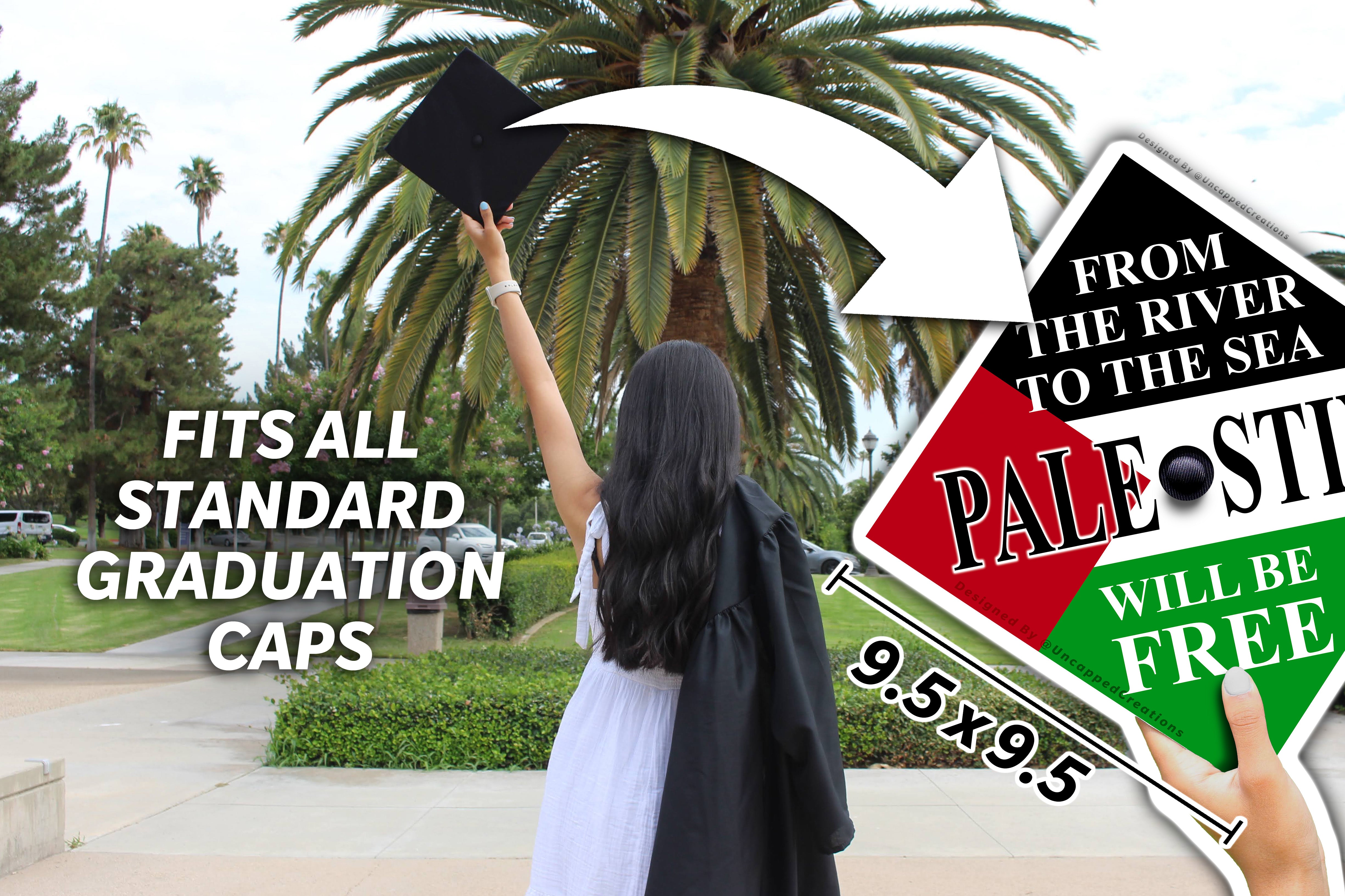 Design is 9.5 x 9.5 inches with an approximate 1 inch hole in the center and double sided adhesive in the back. Design is printed on cardstock, not hand painted. The topper will fit the standard 9 x 9 inches graduation cap / mortar board. Cap/Mortar board is not included. Center circle is not included.