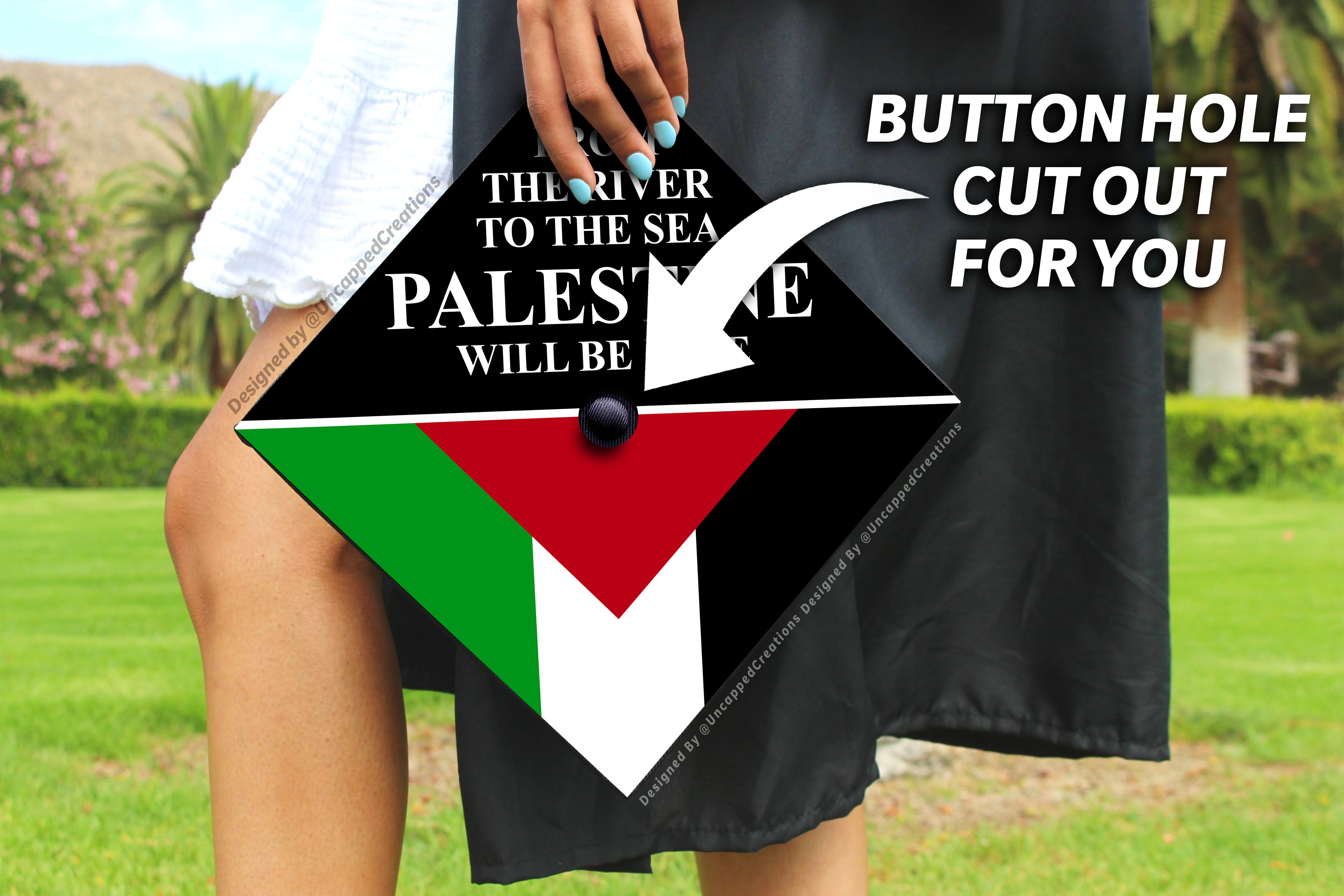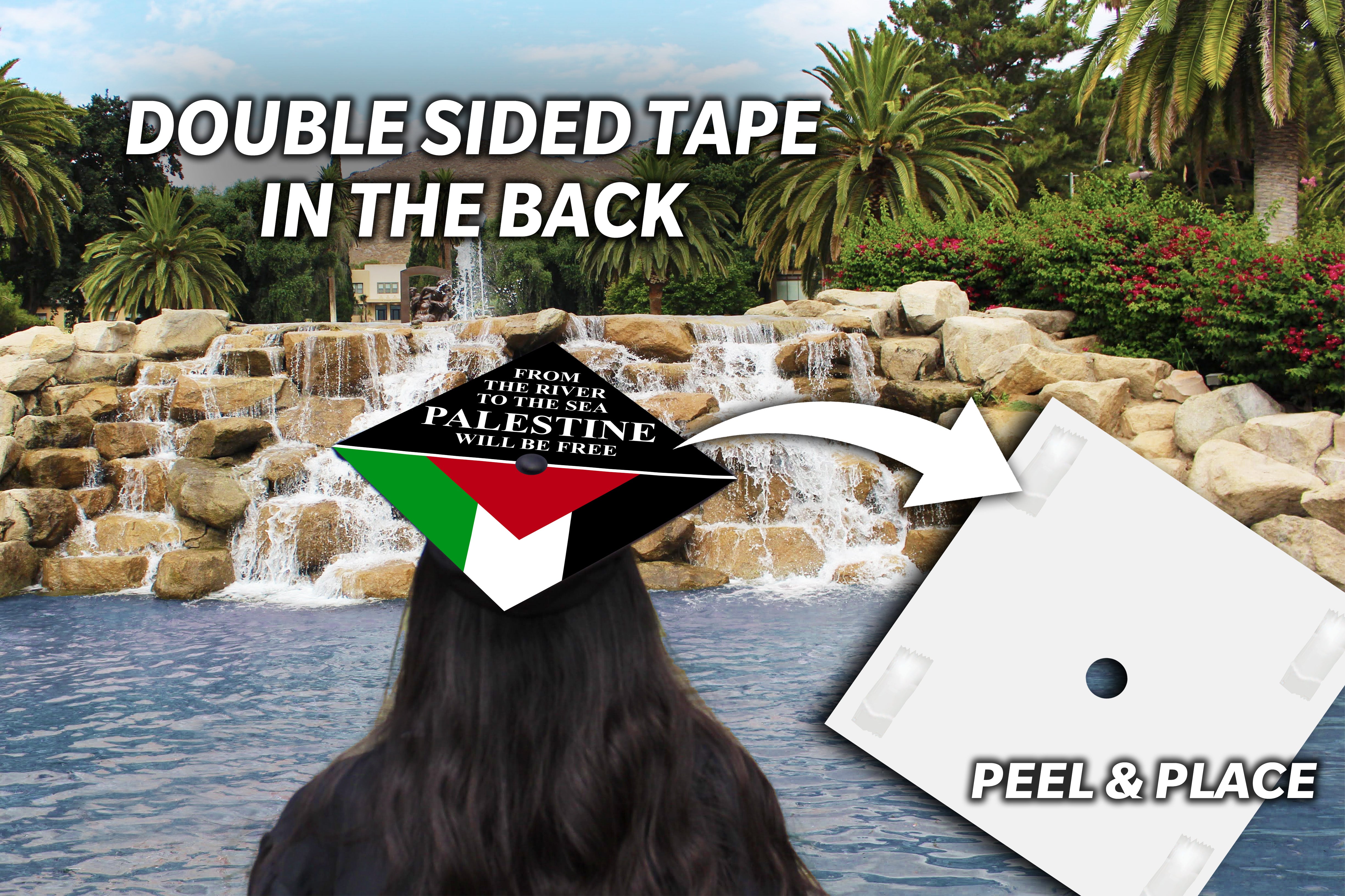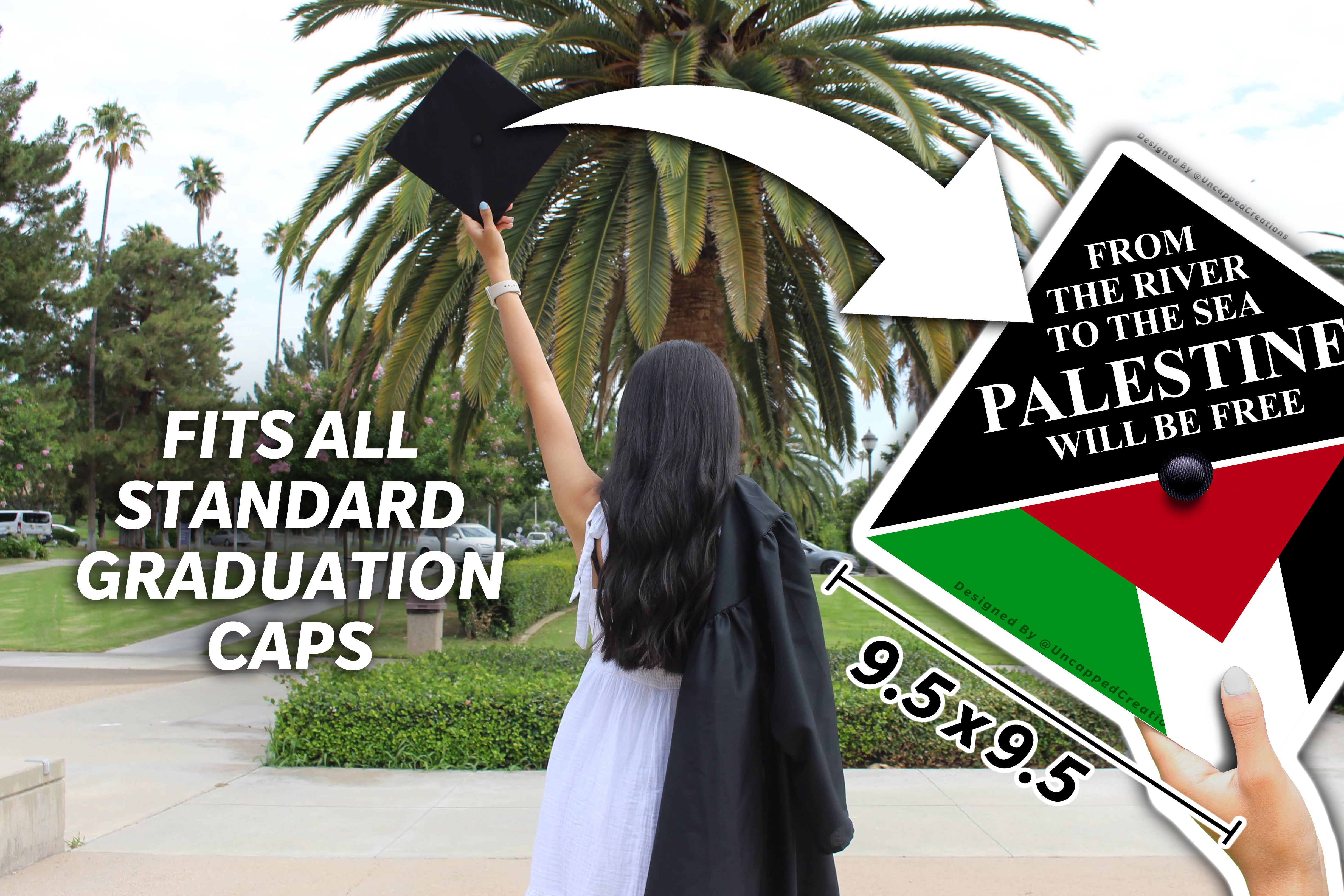Design is 9.5 x 9.5 inches with an approximate 1 inch hole in the center and double sided adhesive in the back. Design is printed on cardstock, not hand painted. The topper will fit the standard 9 x 9 inches graduation cap / mortar board. Cap/Mortar board is not included. Center circle is not included.