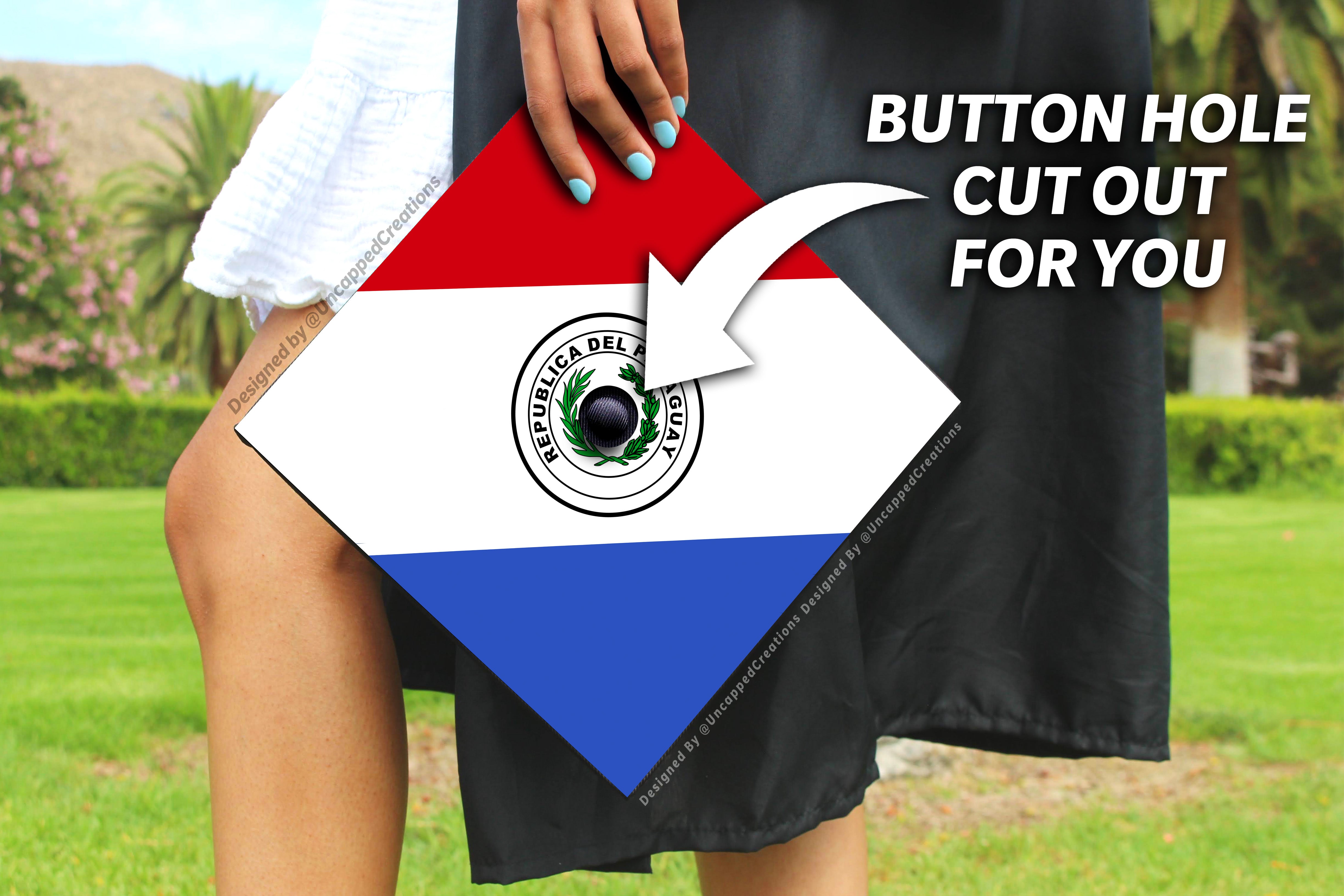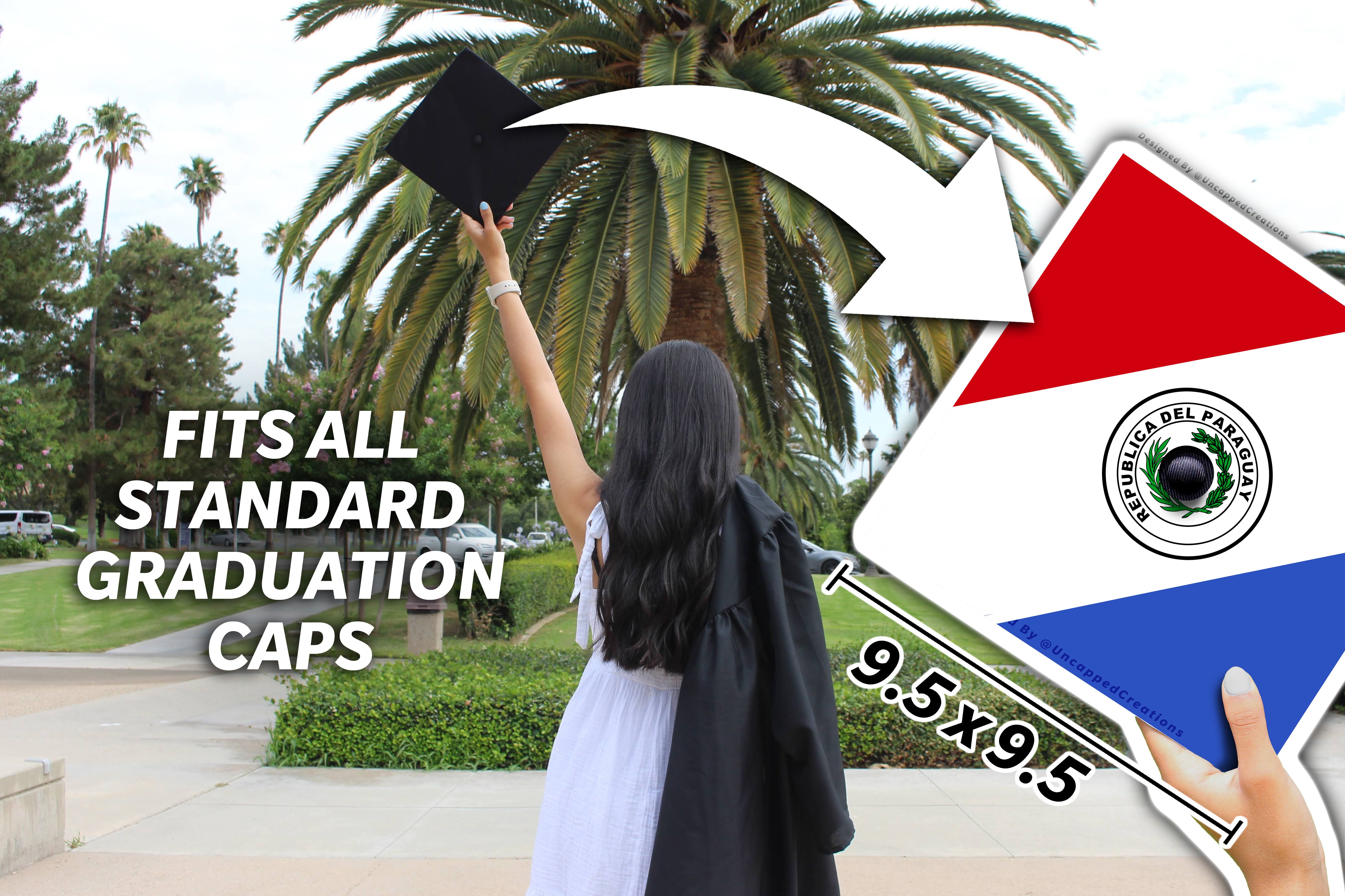 Design is 9.5 x 9.5 inches with an approximate 1 inch hole in the center and double sided adhesive in the back. Design is printed on cardstock, not hand painted. The topper will fit the standard 9 x 9 inches graduation cap / mortar board. Cap/Mortar board is not included. Center circle is not included.