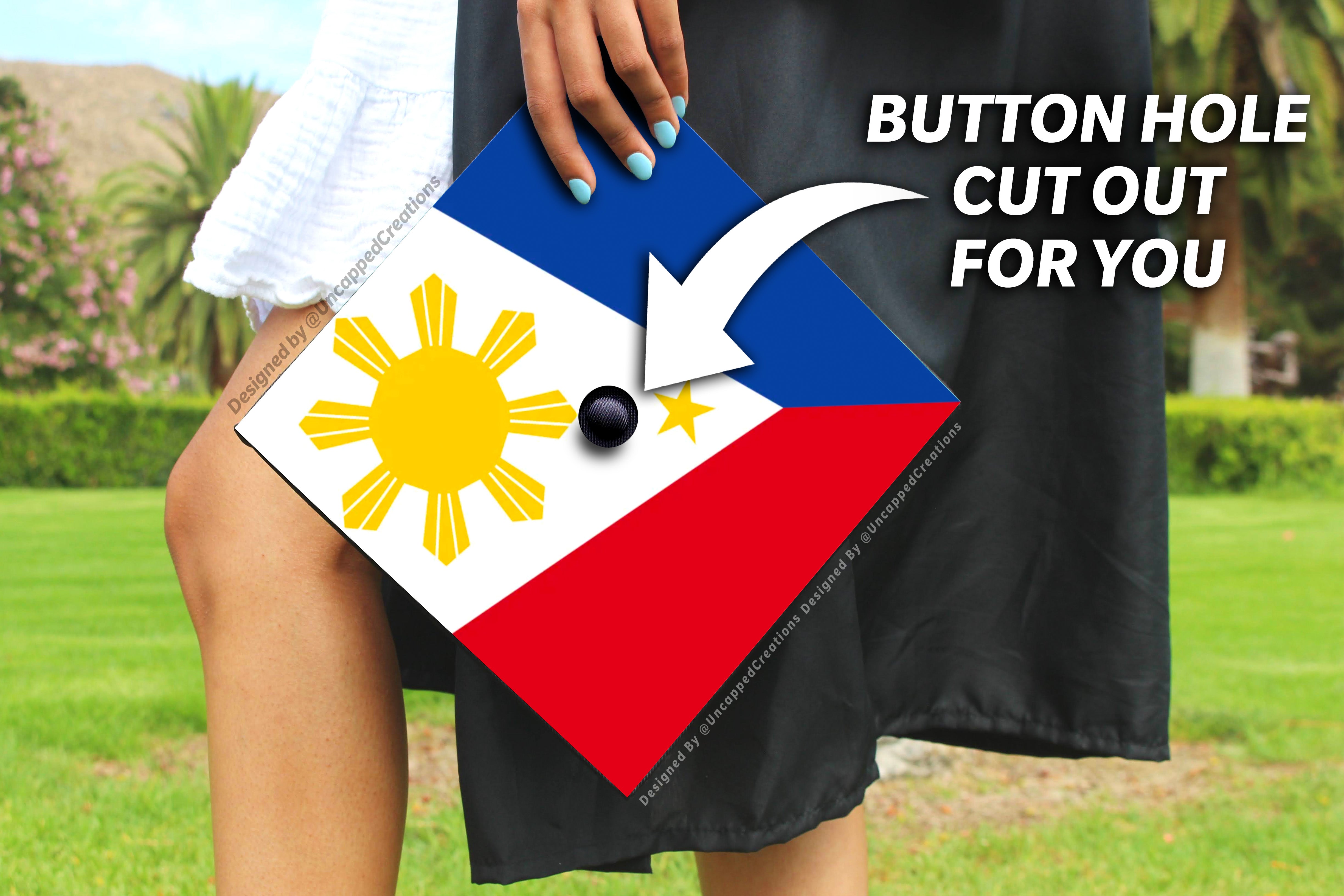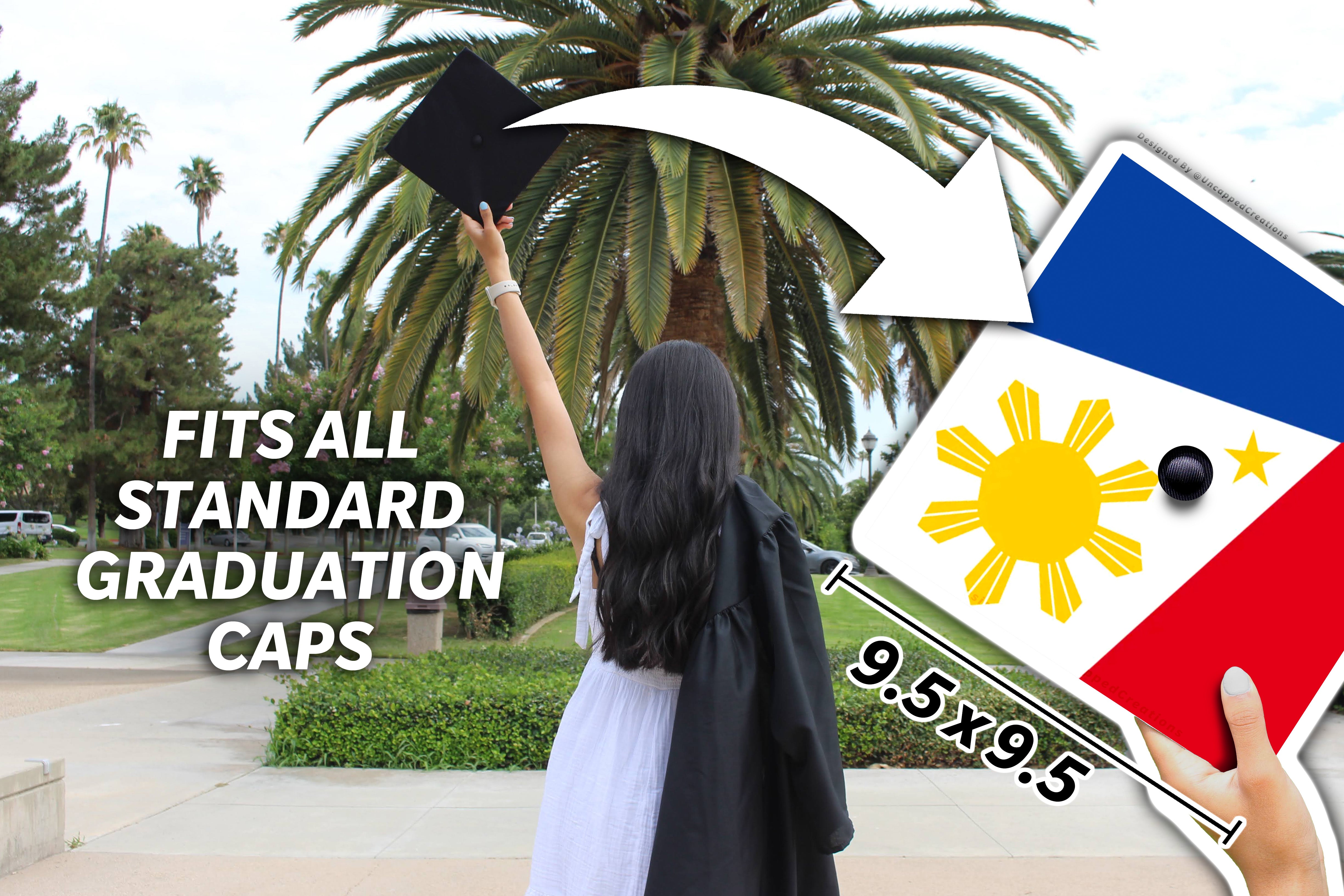 Design is 9.5 x 9.5 inches with an approximate 1 inch hole in the center and double sided adhesive in the back. Design is printed on cardstock, not hand painted. The topper will fit the standard 9 x 9 inches graduation cap / mortar board. Cap/Mortar board is not included. Center circle is not included.