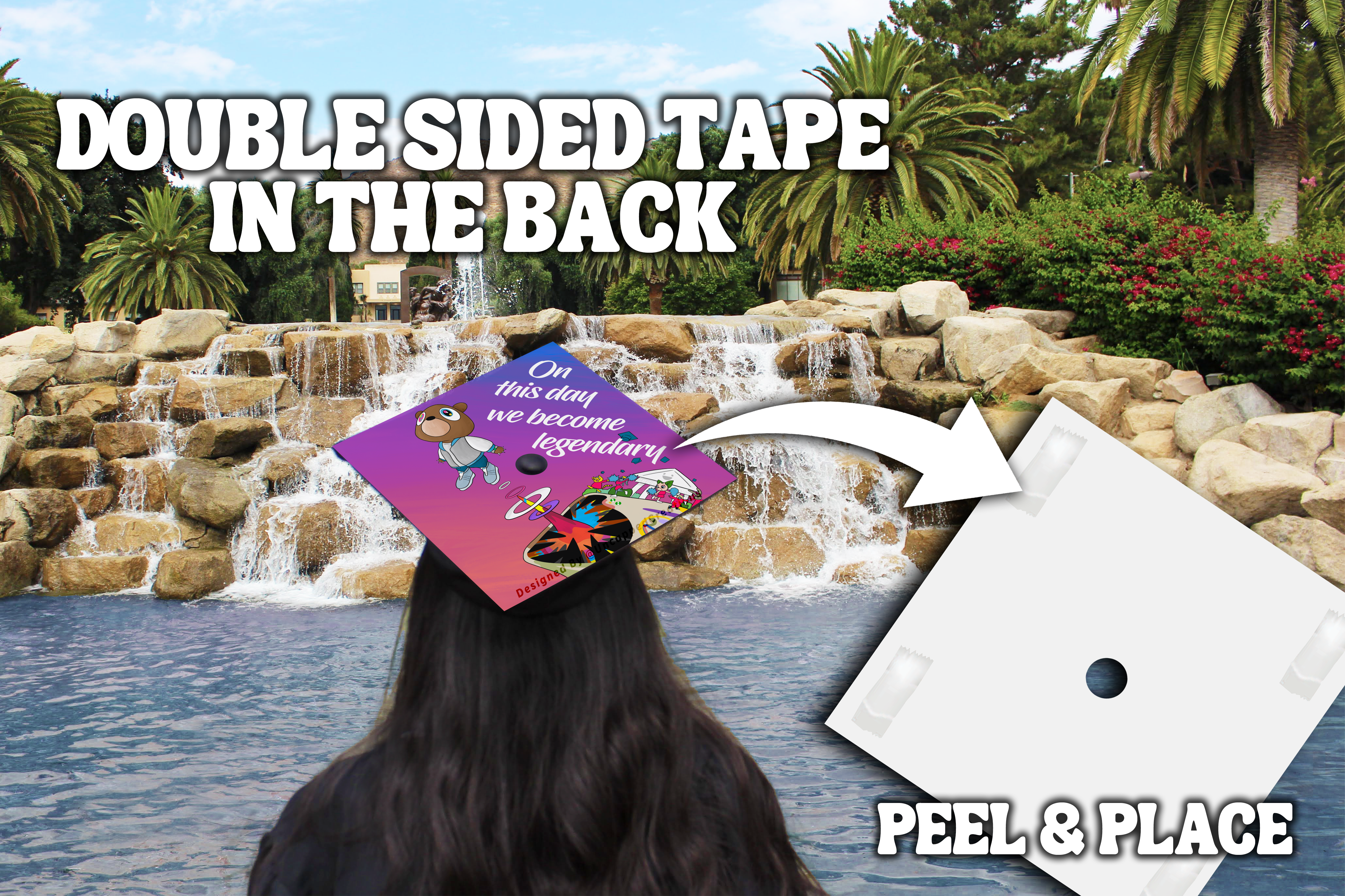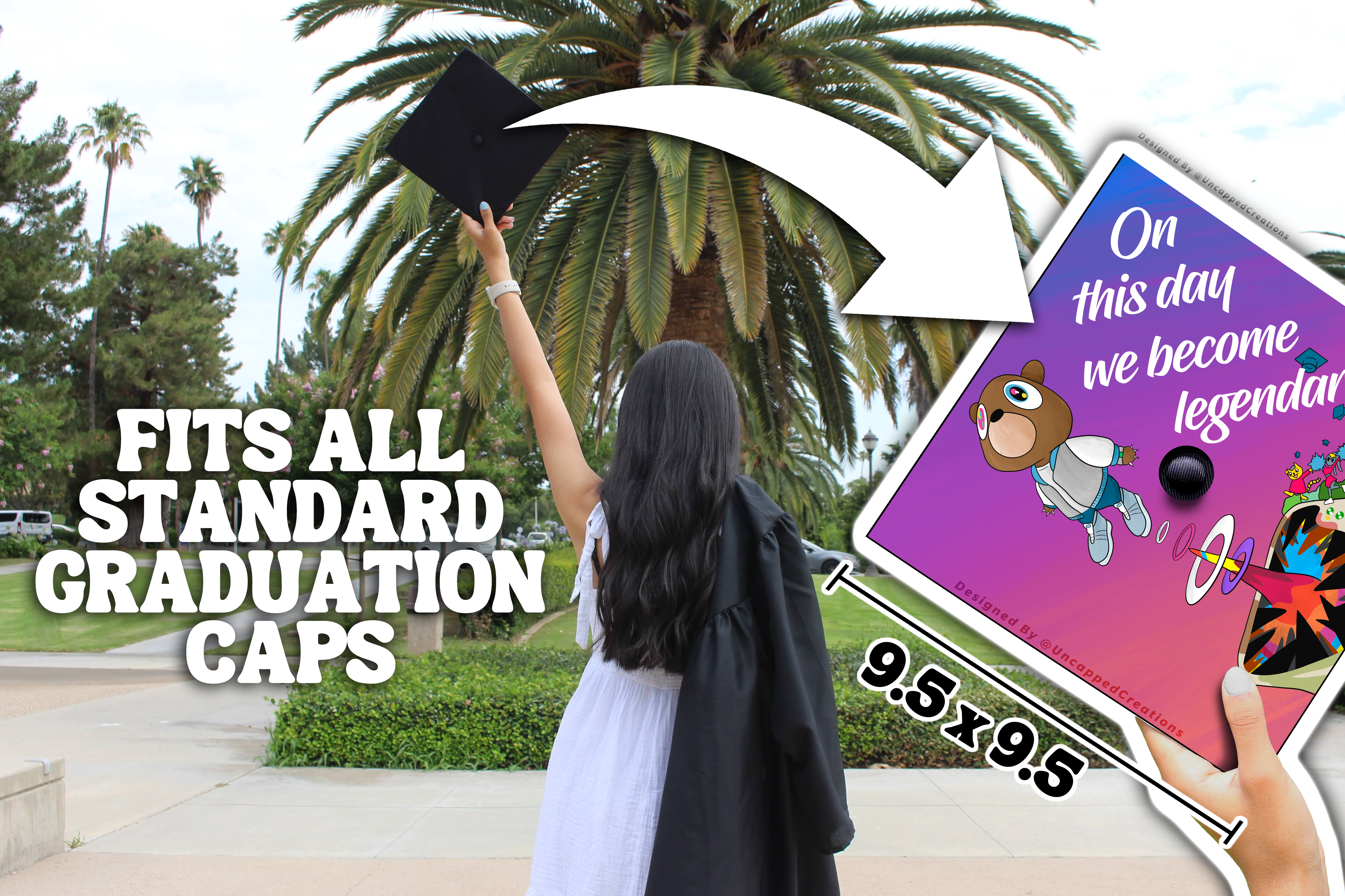 Design is 9.5 x 9.5 inches with an approximate 1 inch hole in the center and double sided adhesive in the back. Design is printed on cardstock, not hand painted. The topper will fit the standard 9 x 9 inches graduation cap / mortar board. Cap/Mortar board is not included. Center circle is not included.