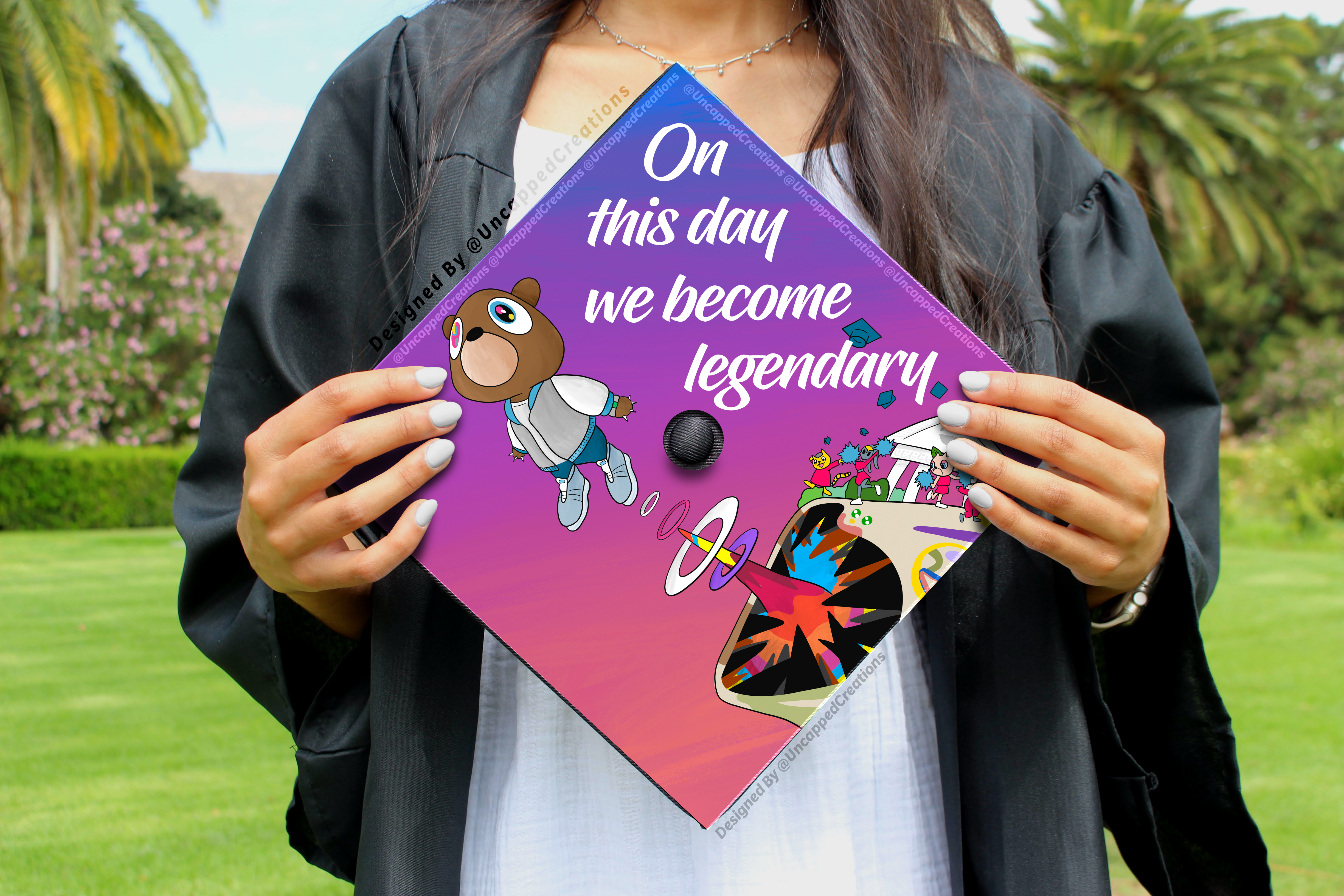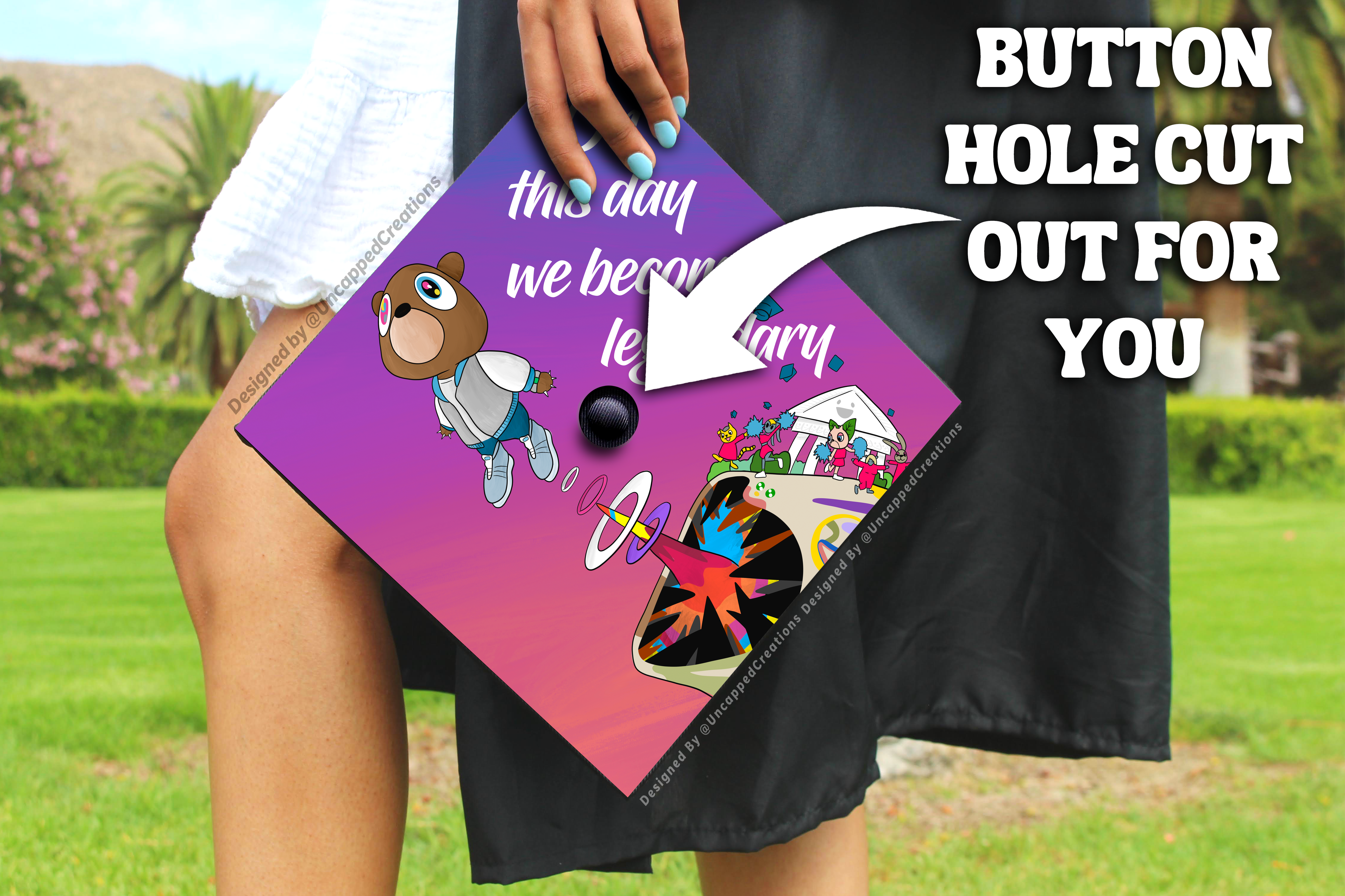 Premade grad cap design is sold AS IS. Design CANNOT be altered, edited, or changed and will be shipped exactly how you see it. Printed design may differ in color slightly in person. Watermarks are only on product photos, actual product will not have a watermark.