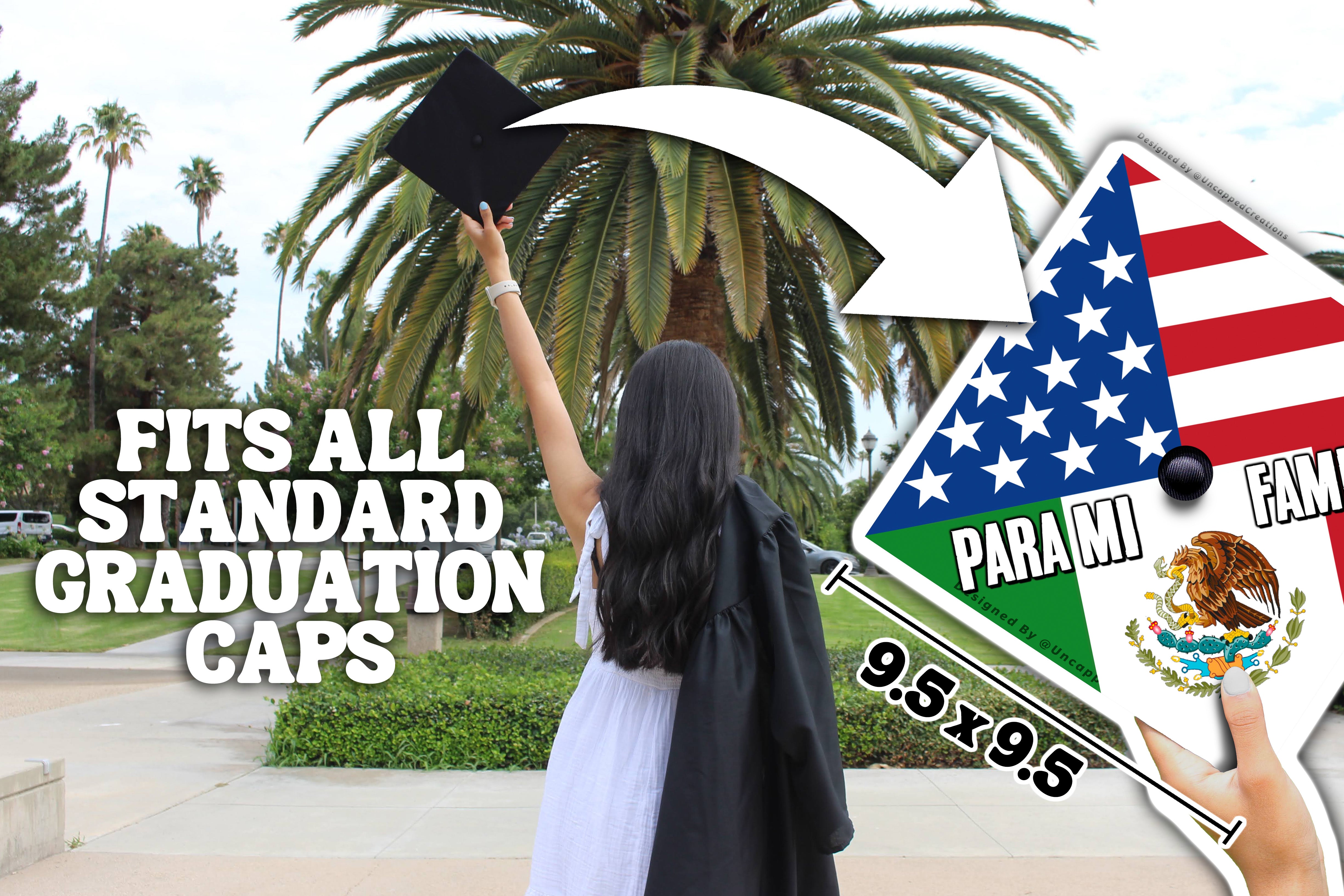 Design is 9.5 x 9.5 inches with an approximate 1 inch hole in the center and double sided adhesive in the back. Design is printed on cardstock, not hand painted. The topper will fit the standard 9 x 9 inches graduation cap / mortar board. Cap/Mortar board is not included. Center circle is not included.