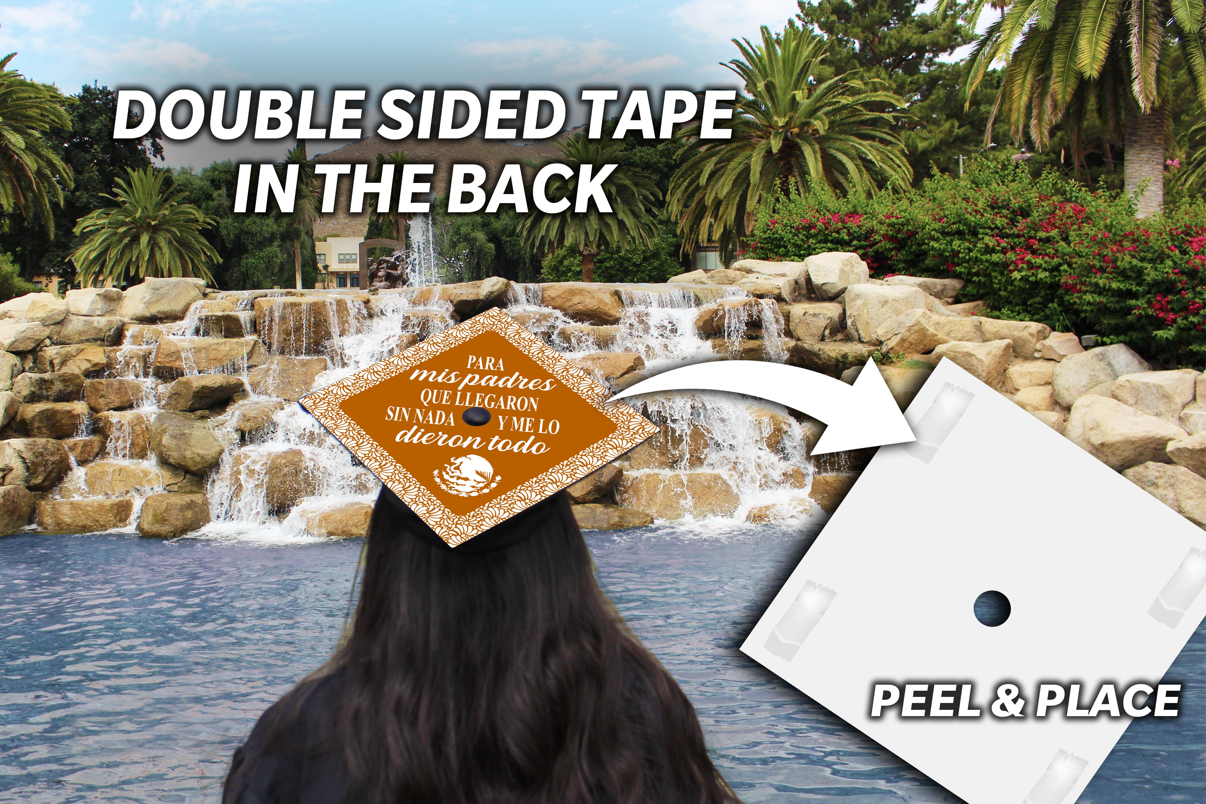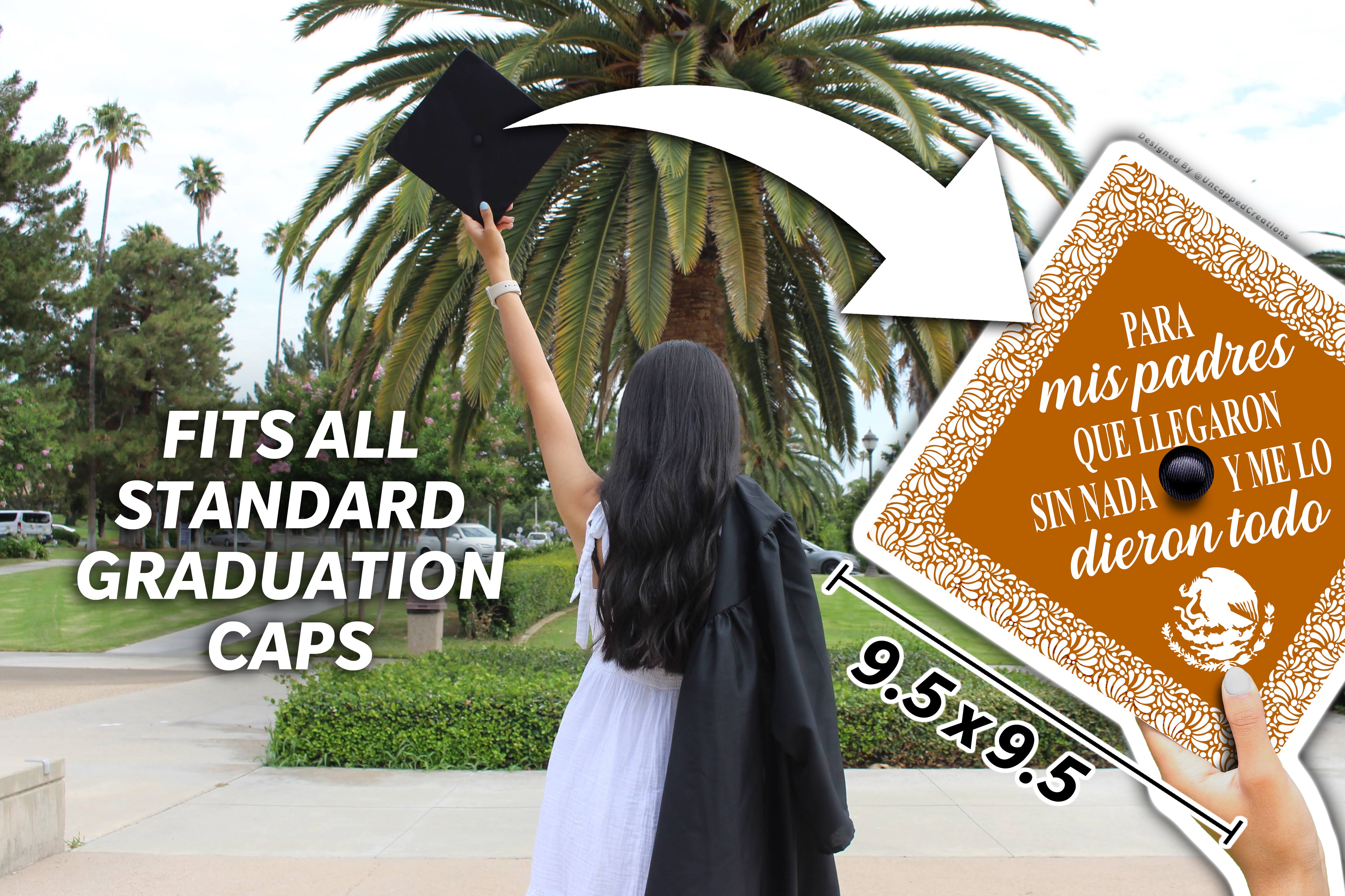 Design is 9.5 x 9.5 inches with an approximate 1 inch hole in the center and double sided adhesive in the back. Design is printed on cardstock, not hand painted. The topper will fit the standard 9 x 9 inches graduation cap / mortar board. Cap is not included.