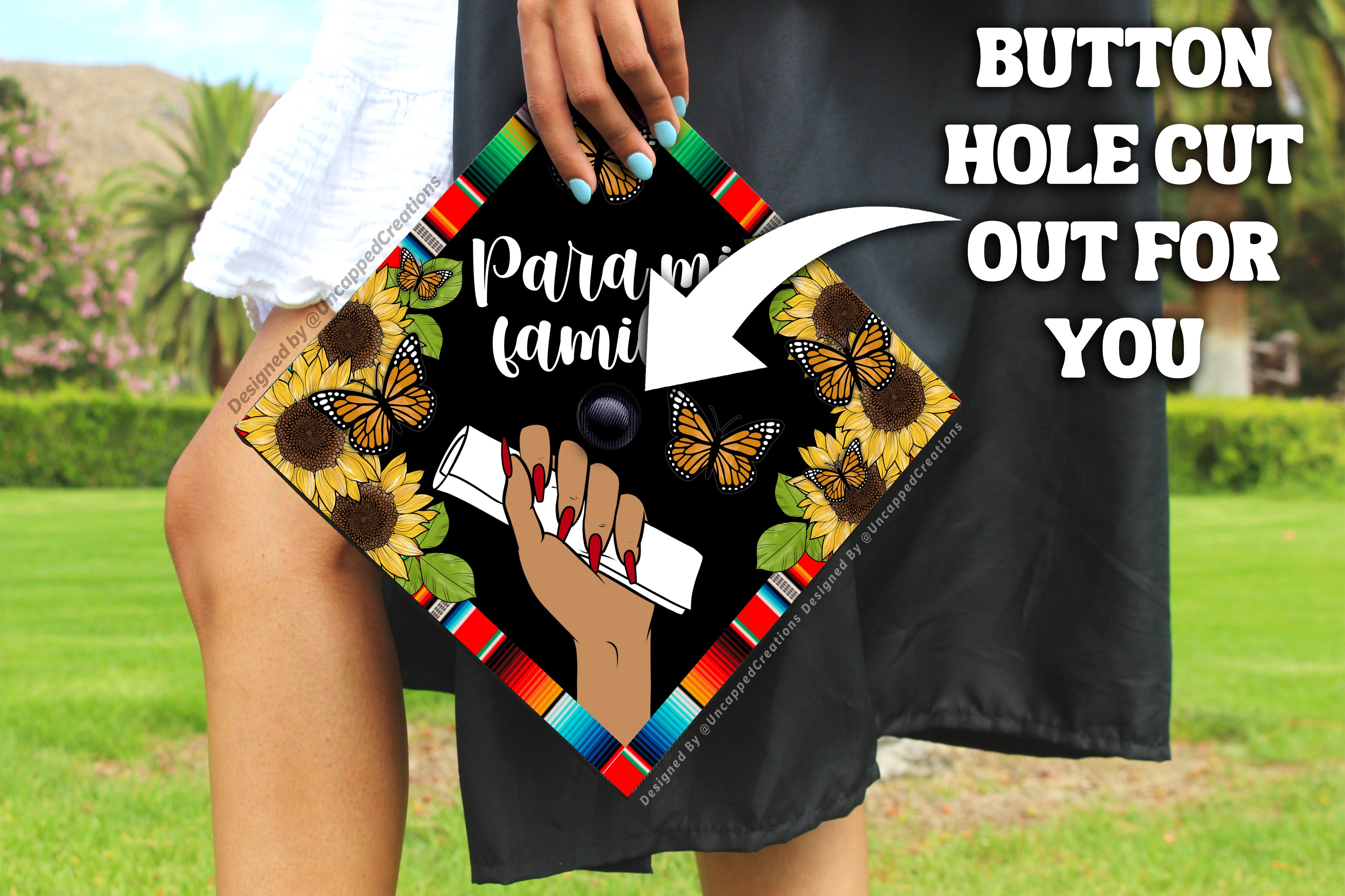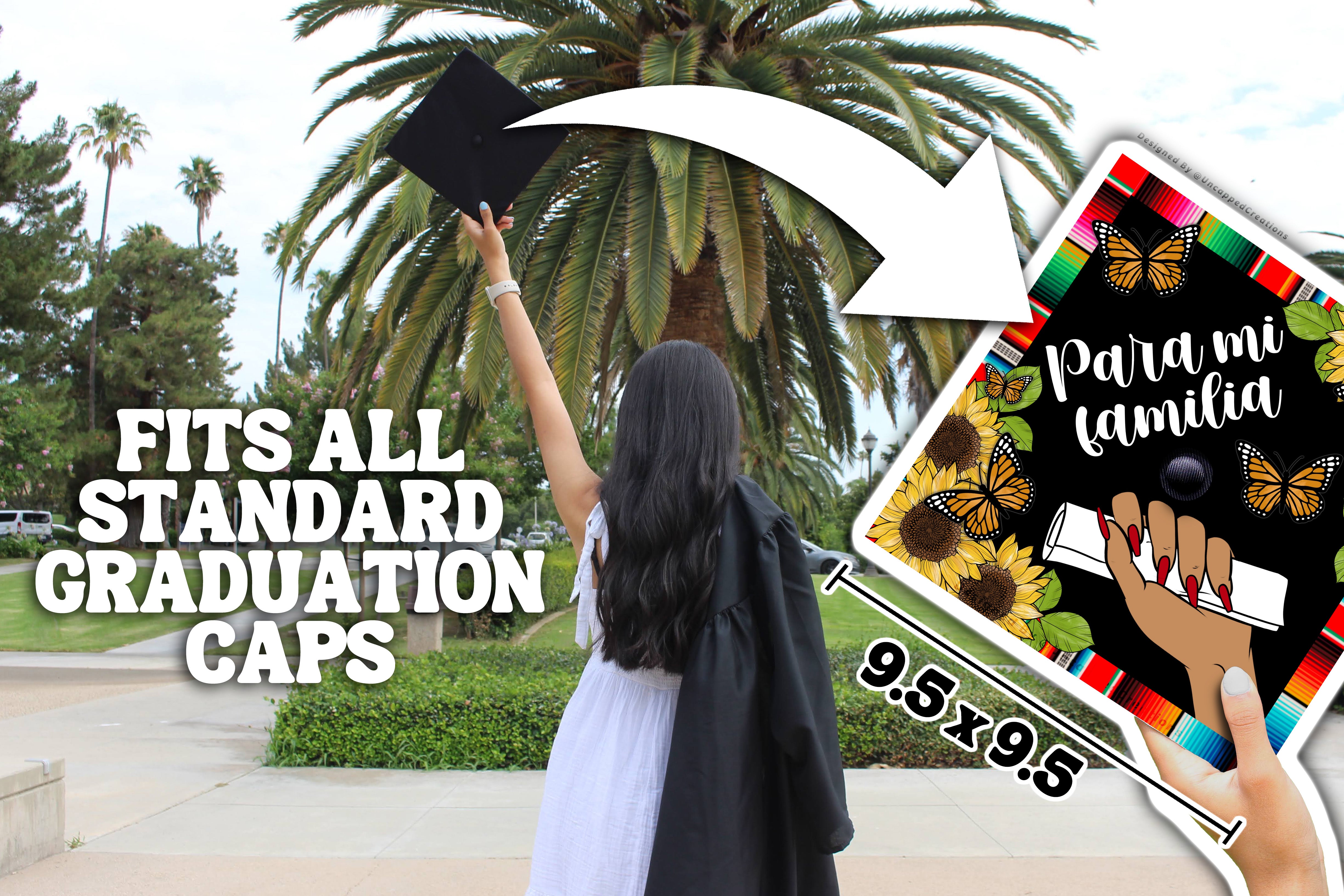 Design is 9.5 x 9.5 inches with an approximate 1 inch hole in the center and double sided adhesive in the back. Design is printed on cardstock, not hand painted. The topper will fit the standard 9 x 9 inches graduation cap / mortar board. Cap/Mortar board is not included. Center circle is not included.
