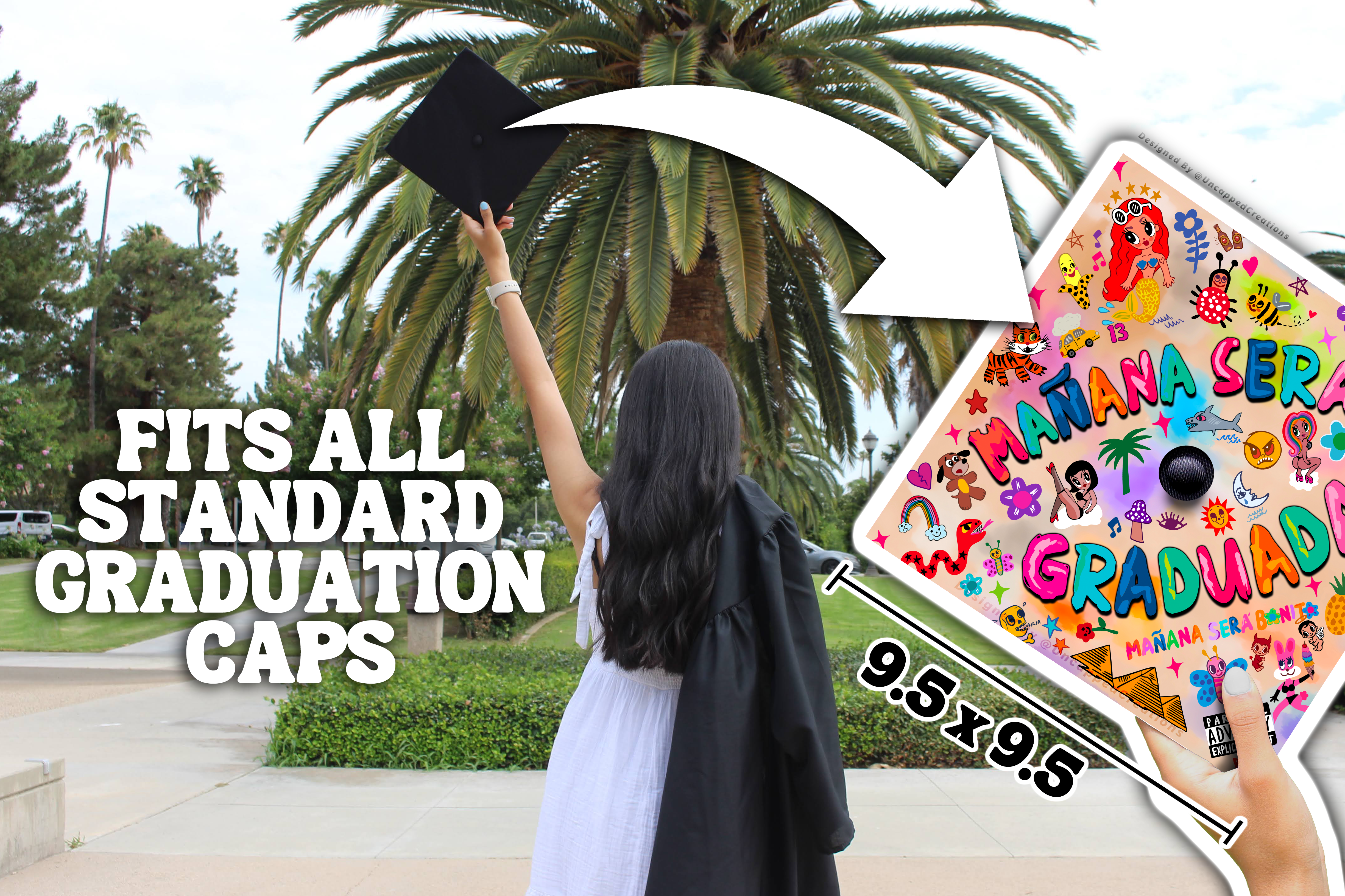 Design is 9.5 x 9.5 inches with an approximate 1 inch hole in the center and double sided adhesive in the back. Design is printed on cardstock, not hand painted. The topper will fit the standard 9 x 9 inches graduation cap / mortar board. Cap/Mortar board is not included. Center circle is not included.