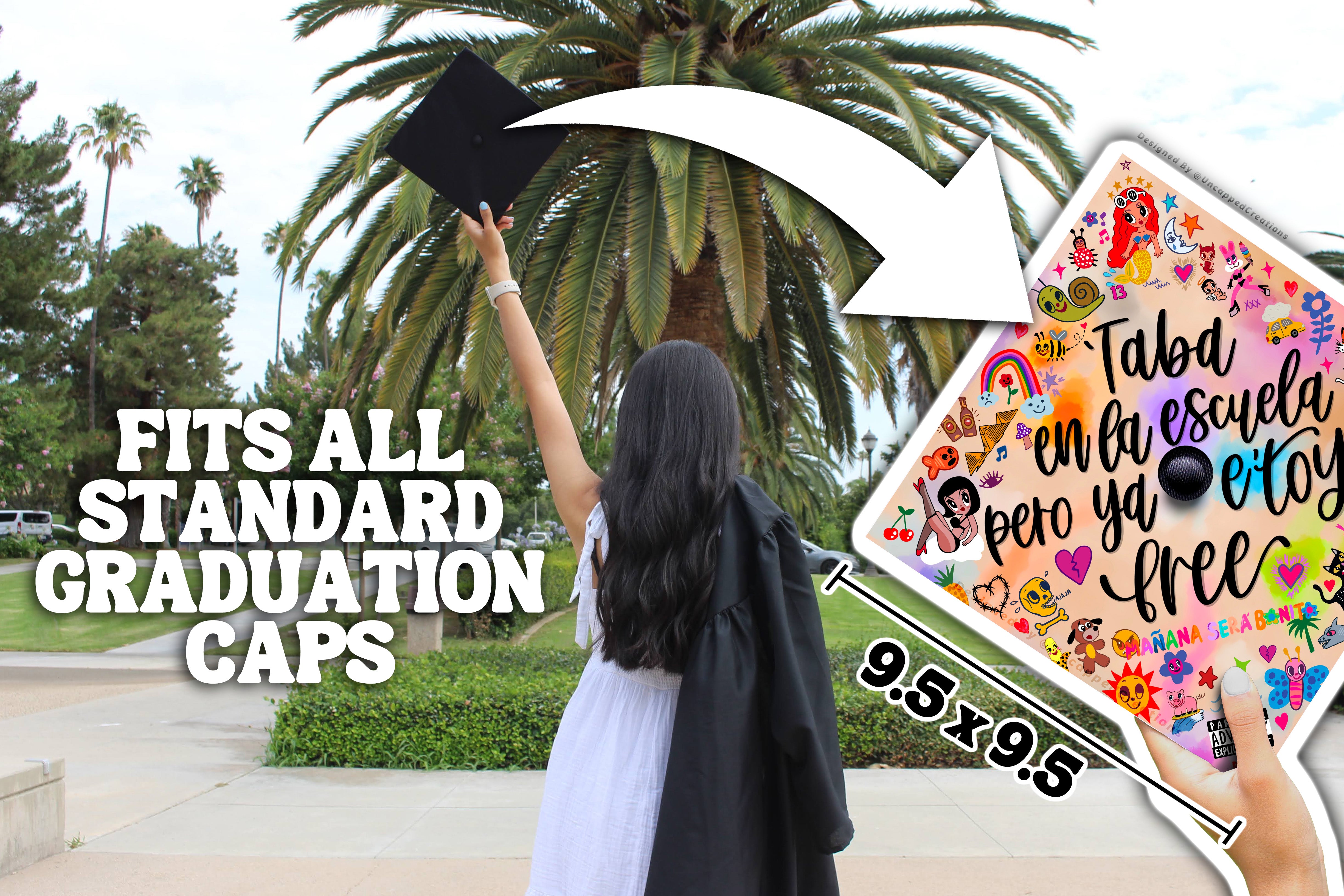Design is 9.5 x 9.5 inches with an approximate 1 inch hole in the center and double sided adhesive in the back. Design is printed on cardstock, not hand painted. The topper will fit the standard 9 x 9 inches graduation cap / mortar board. Cap/Mortar board is not included. Center circle is not included.